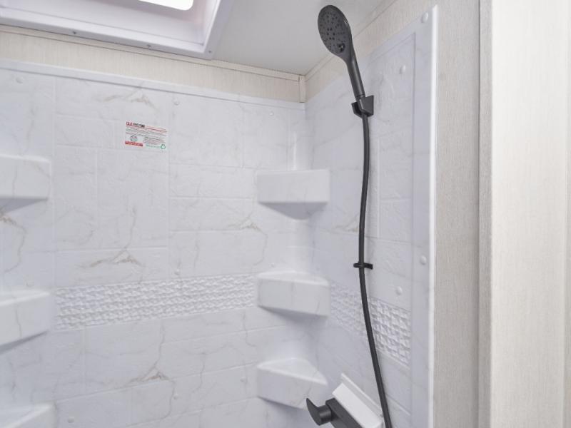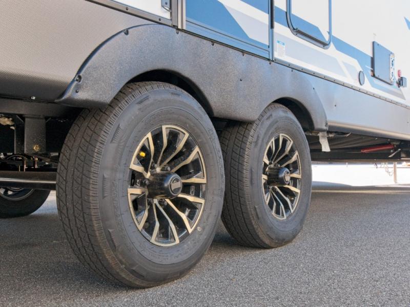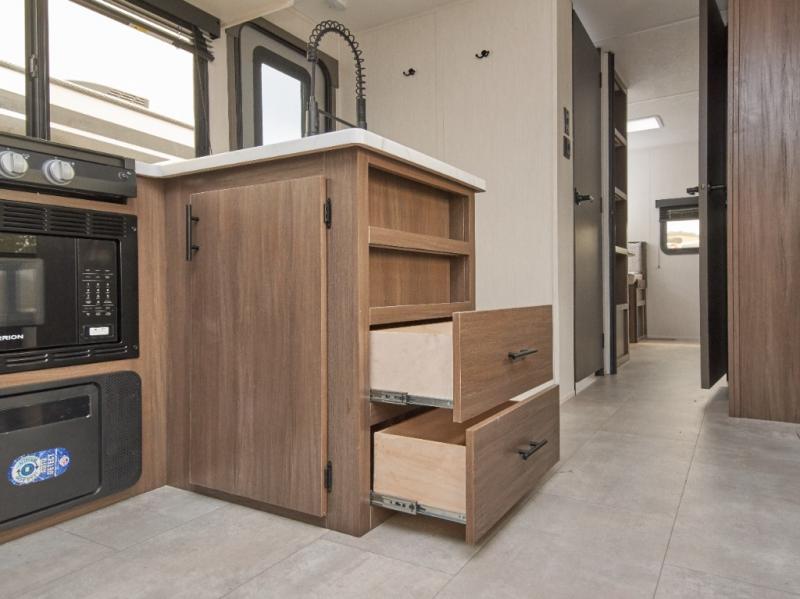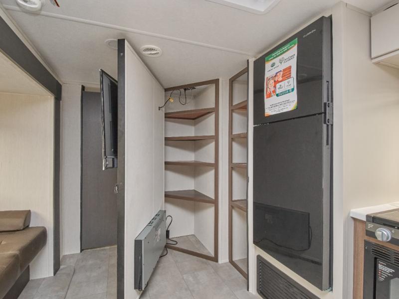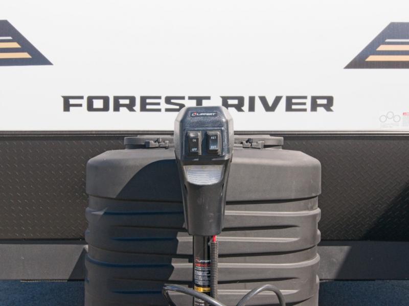 Inside, you'll find Carefree Congoleum flooring, custom two-tone cabinetry, and residential-grade drawer glides. The on-demand tankless water heater, 15,000 BTU ducted A/C, and auto ignition furnace ensure year-round comfort.