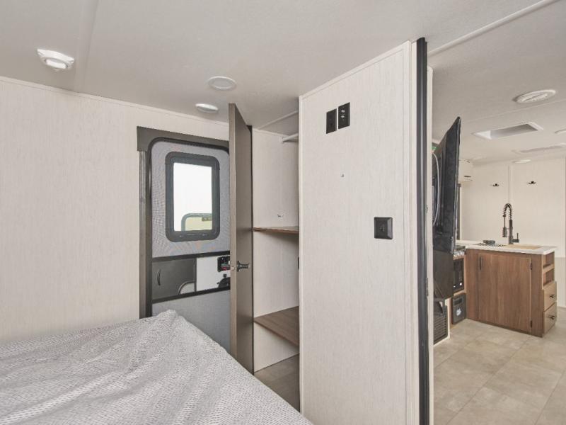 Your guests or kids will love the rear private bunkhouse, complete with a sofa and overhead bunk, a booth dinette, and ample storage. The large slide-out expands the living space, making room for a comfortable sofa and dining area, perfect for relaxing or enjoying meals together.