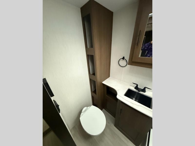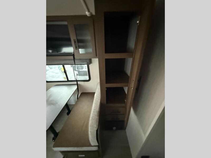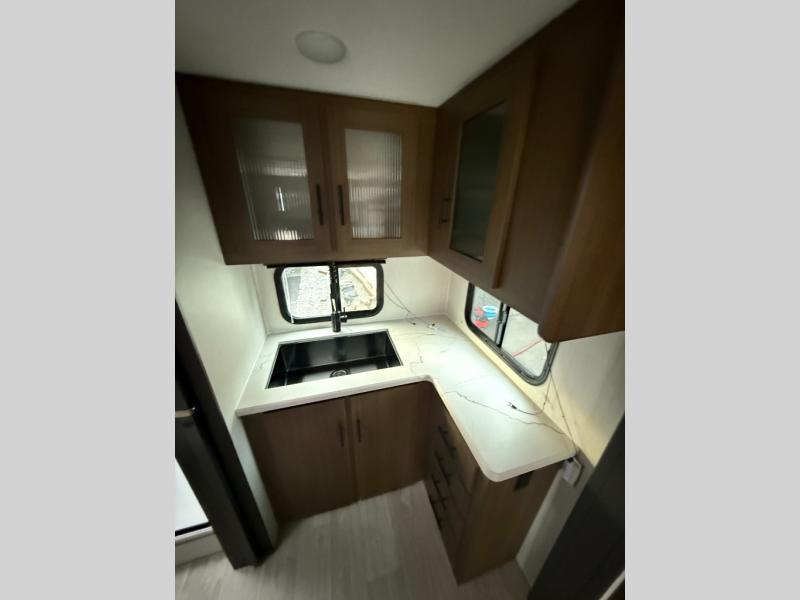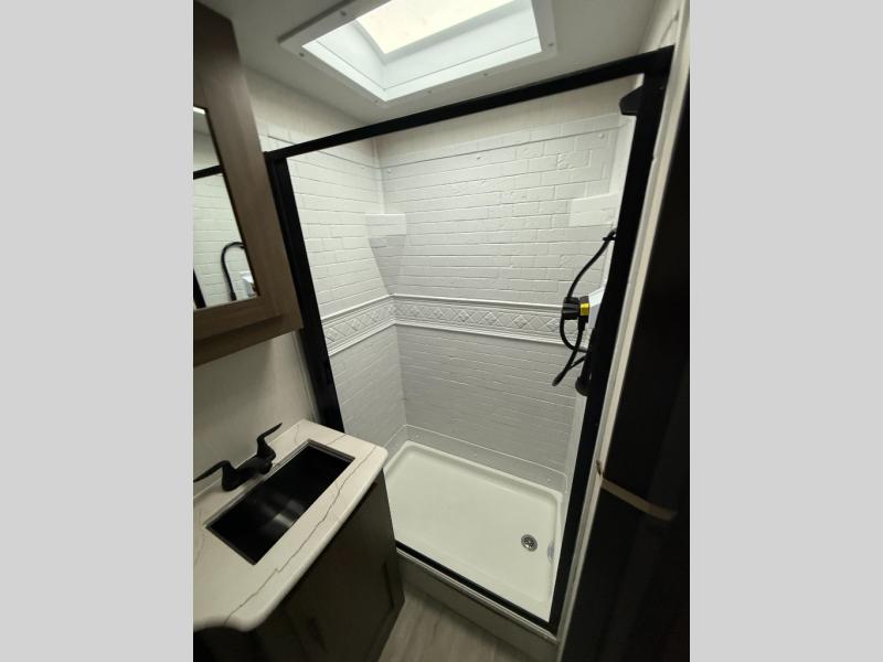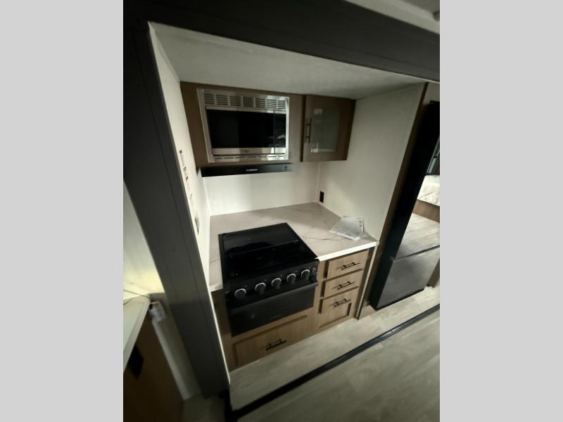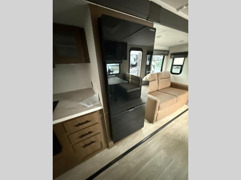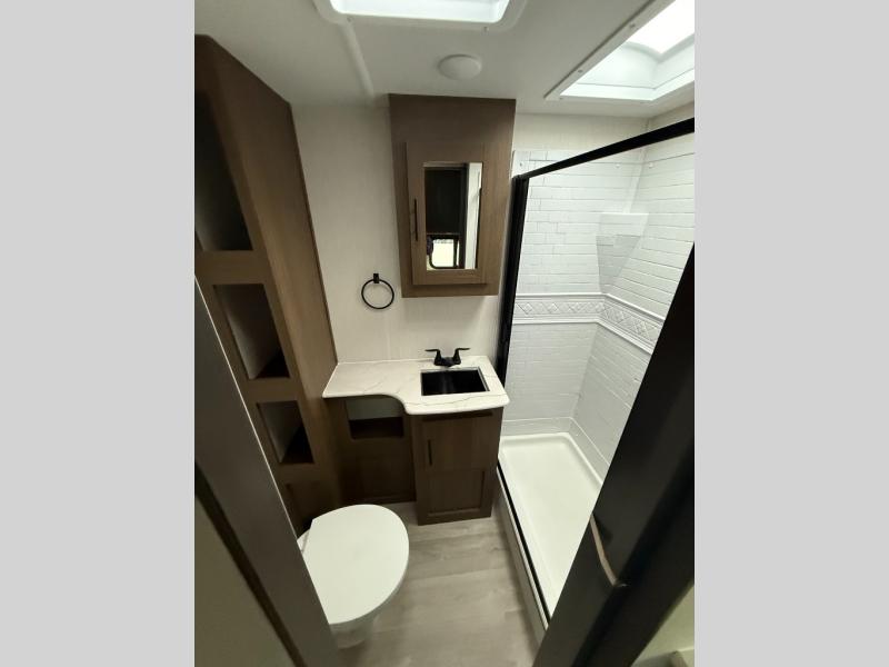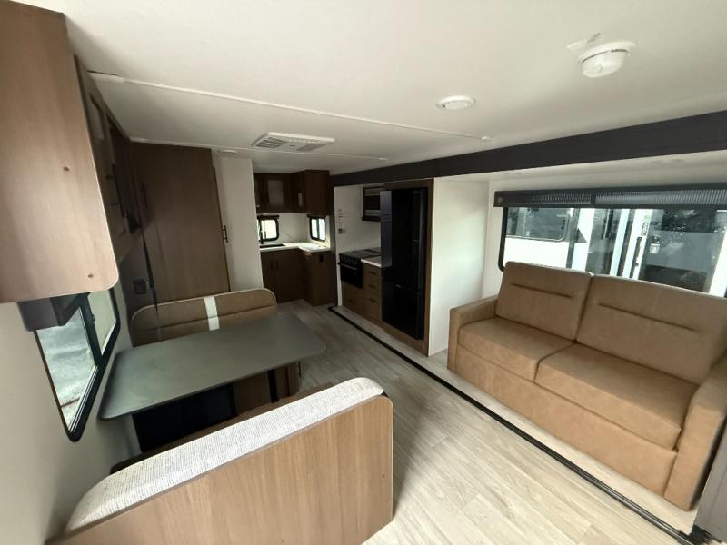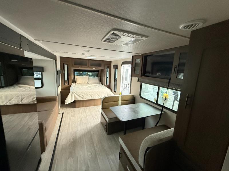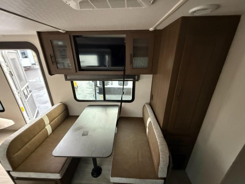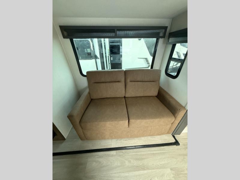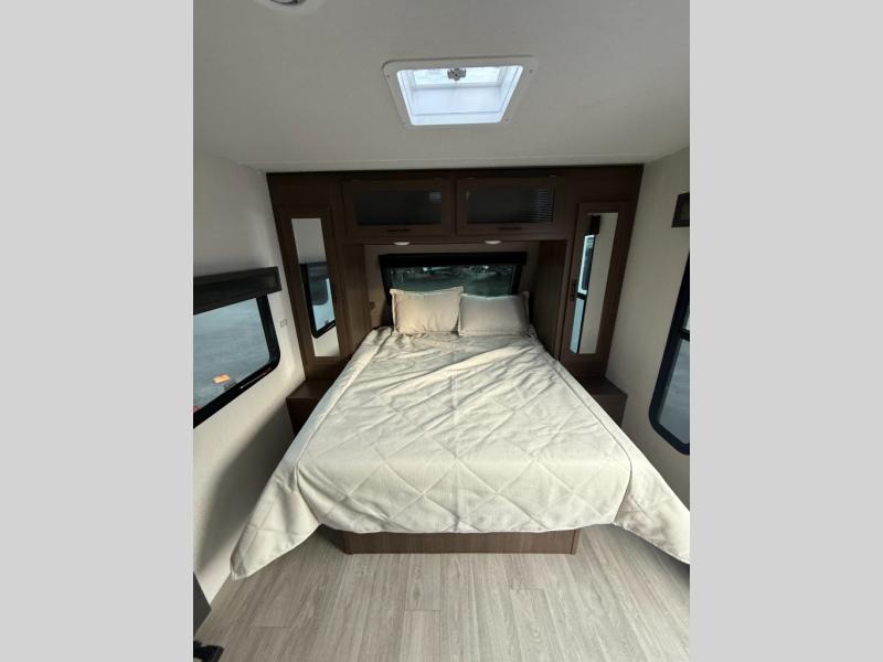 If you're looking for a little more space in your next travel trailer, this is the one! There is a large slide out that houses the sleeper sofa and kitchen appliances, and the rear corner kitchen includes a skylight for more natural light. You'll find the full bath in the other rear corner, and the front queen bed with end tables is sure to provide a great night's rest. A booth dinette gives you the perfect place to dine together, and the LED HDTV will make movie nights possible.
