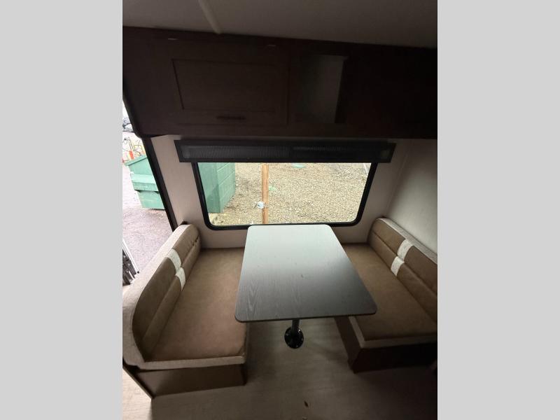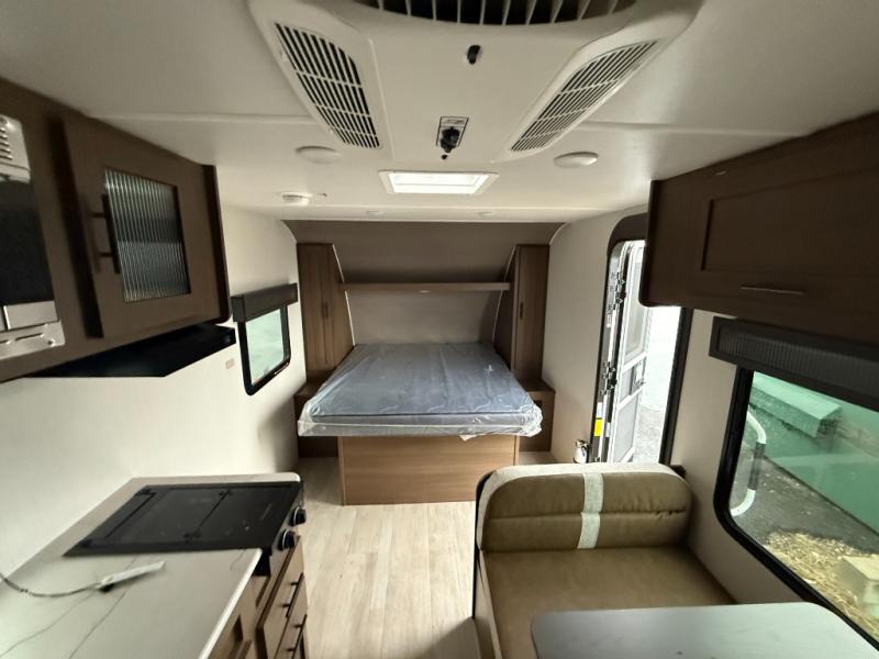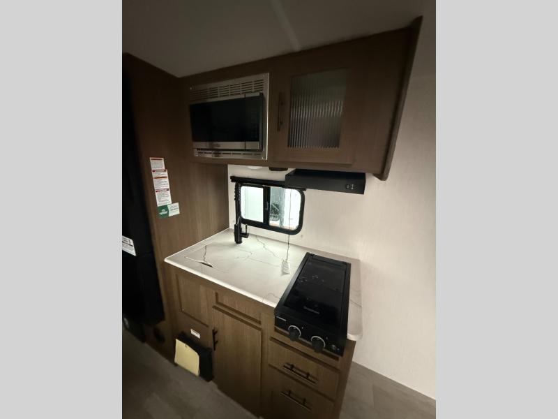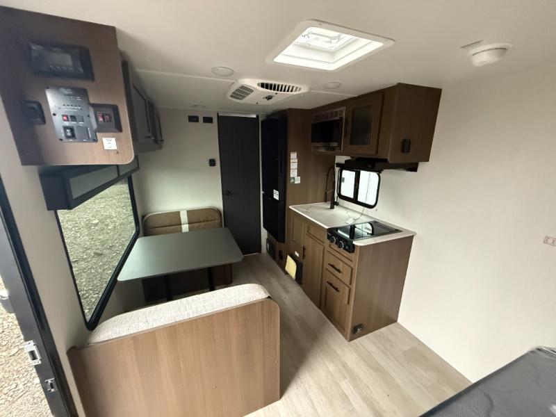 This lightweight single axle travel trailer is perfect for the couple looking to get away on weekend trips to the lake. You will enjoy a queen bed just like at home, and dual wardrobes for your clothes. If you have an overnight guest or two small children, they can sleep on the booth dinette comfortably. There is a recessed two burner cooktop with a glass cover to cook meals on, plus a microwave oven when you're on-the-go. And don't miss the full rear bath that will allow you to clean up each day without having to use the camp's facilities!
