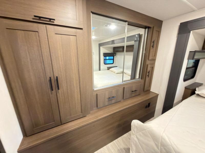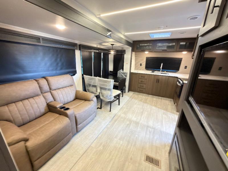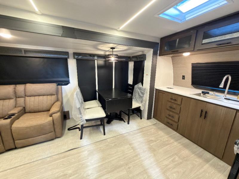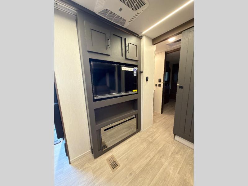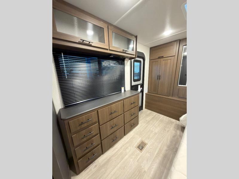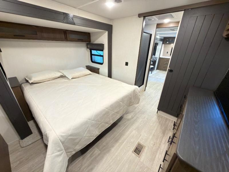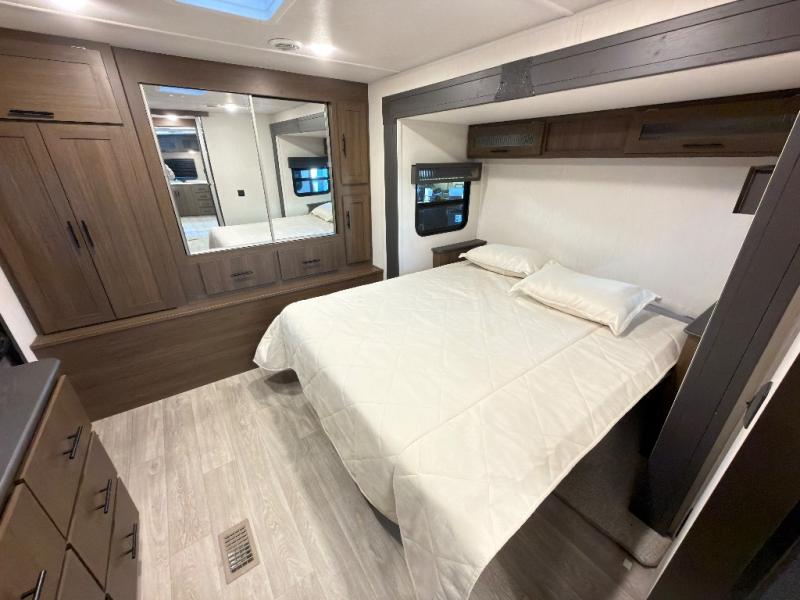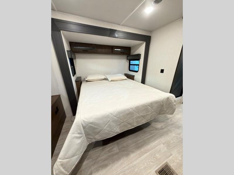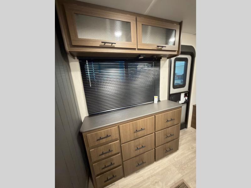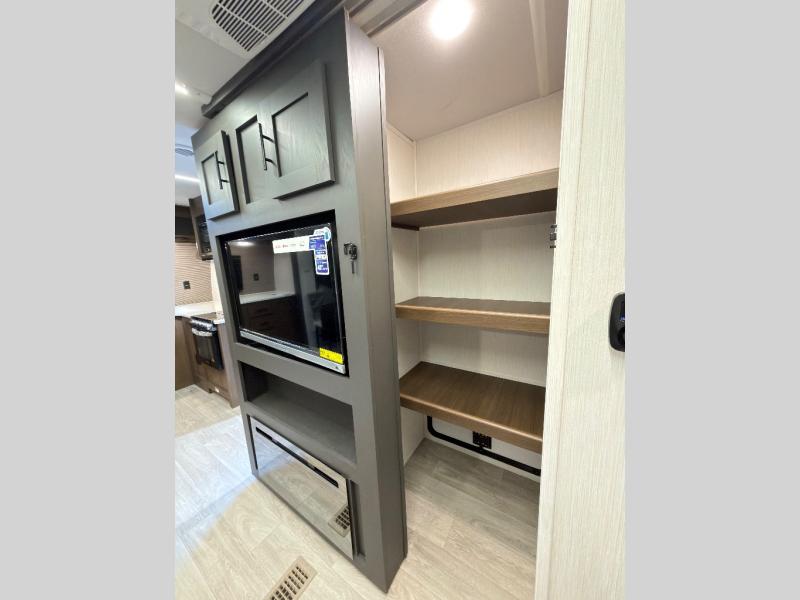 Wherever you decide to camp, you can be sure to have at-home comforts in this double slide out travel trailer. The front kitchen is any chef's dream with its large counter space, 12V refrigerator and a walk-in pantry, and the front windshield will provide great views as you cook. Your crew can relax on the tri-fold hide-a-bed sofa sleeper across from the Smart TV, or play a game at the booth dinette with storage below. The walk-thru bath will create a rear master bedroom you are sure to love. There is a Maxx king bed here, a dresser and a large wardrobe, complete with washer and dryer prep. You'll even find the second entry door in this room for added convenience!