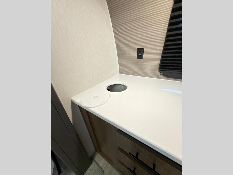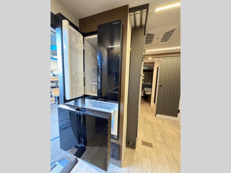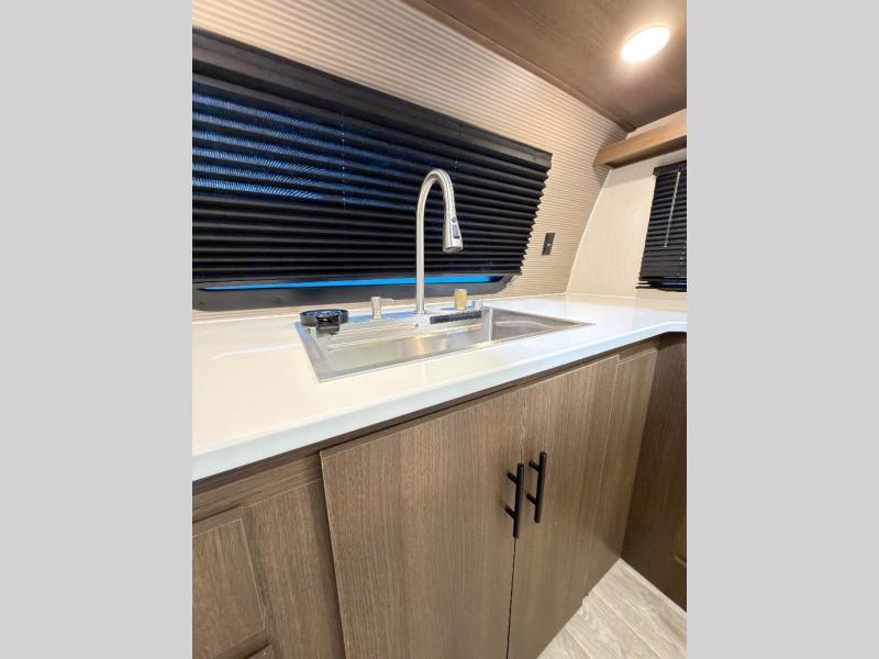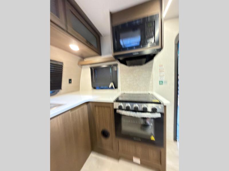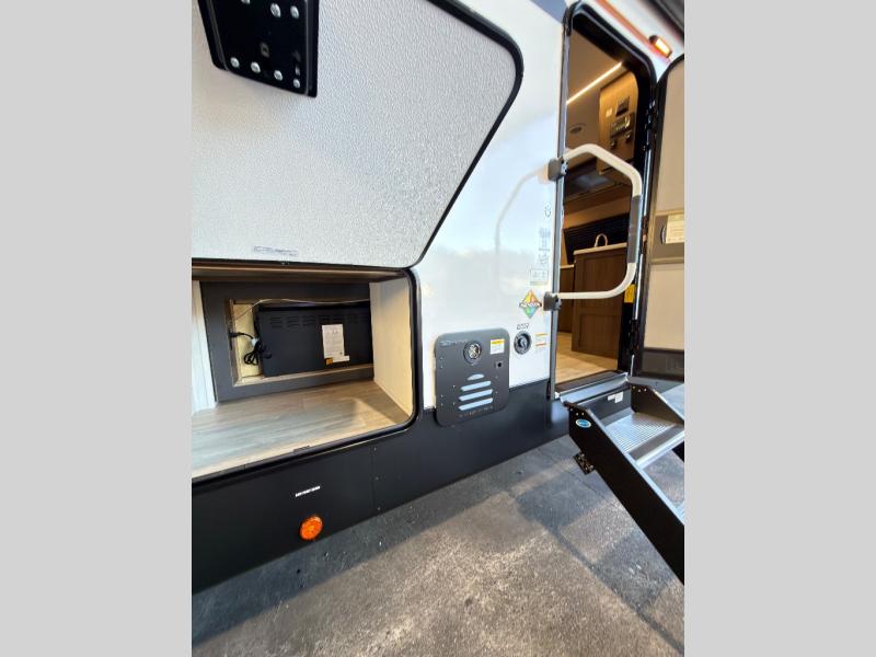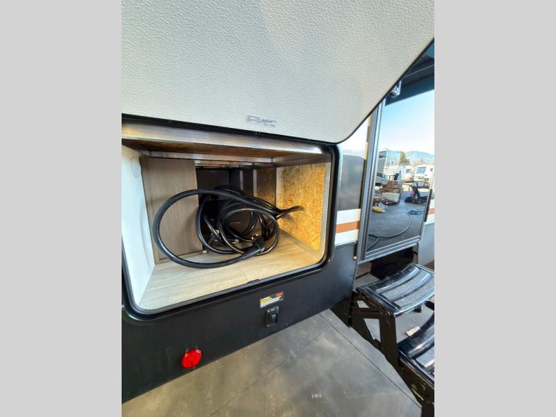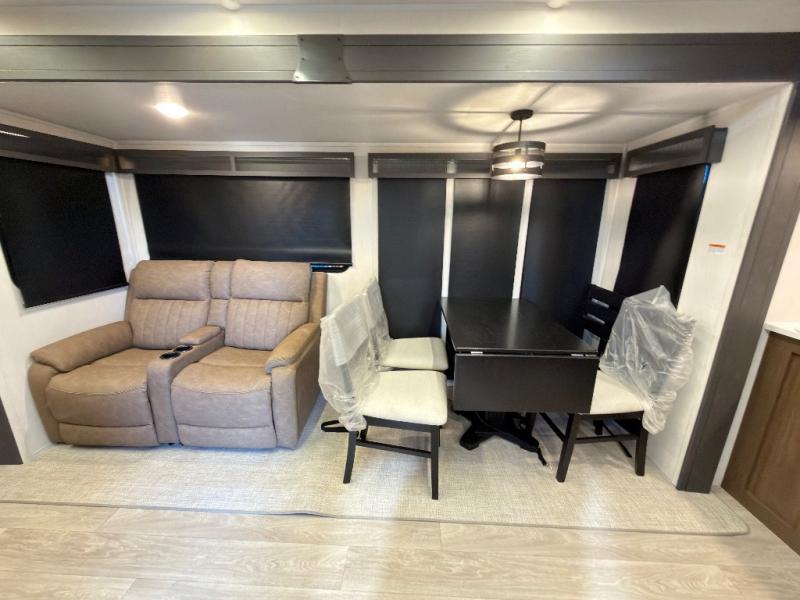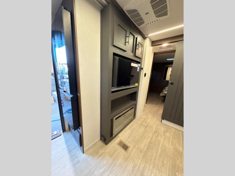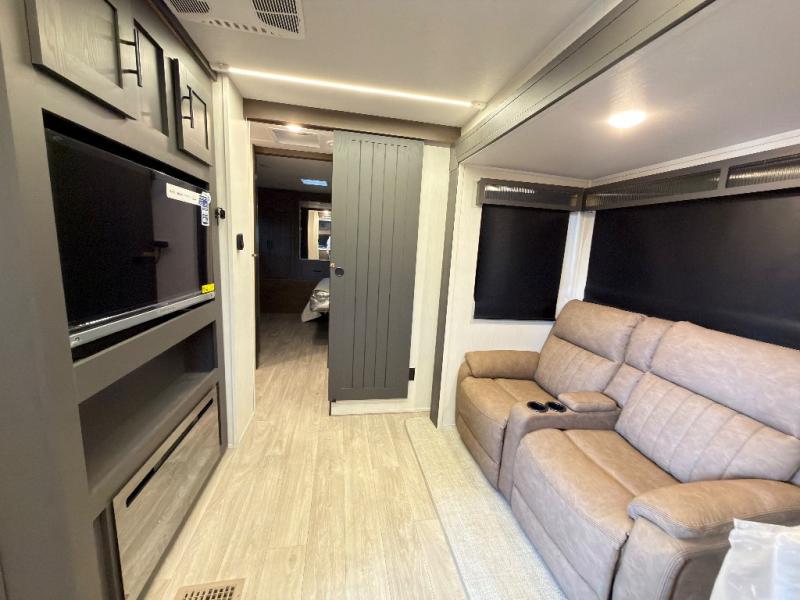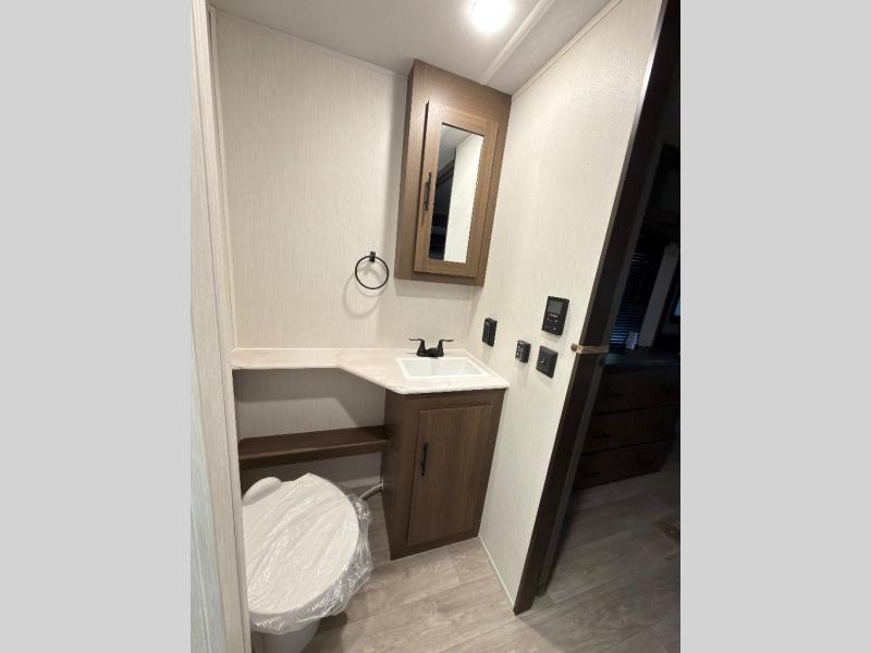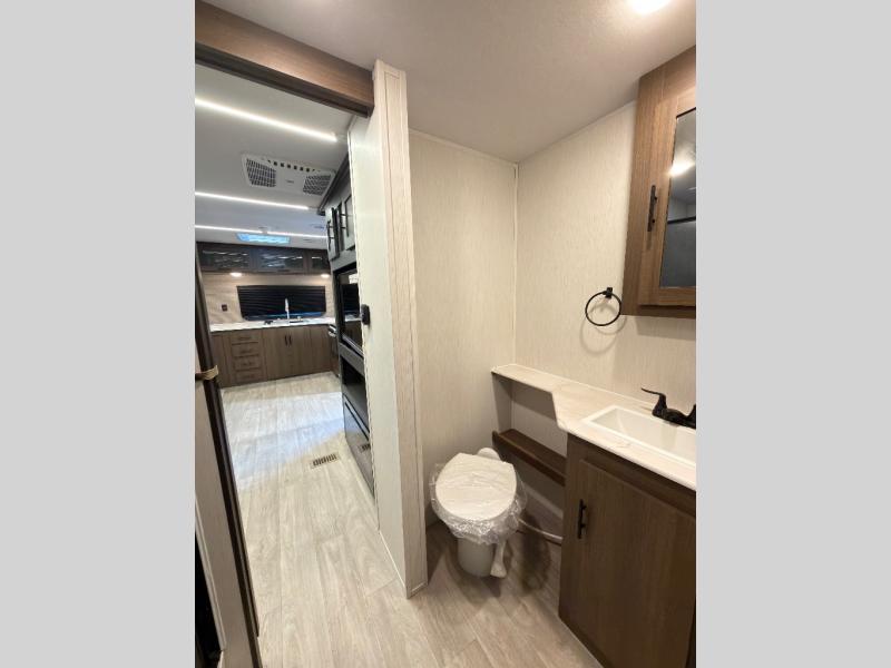 Wherever you decide to camp, you can be sure to have at-home comforts in this double slide out travel trailer. The front kitchen is any chef's dream with its large counter space, 12V refrigerator and a walk-in pantry, and the front windshield will provide great views as you cook. Your crew can relax on the tri-fold hide-a-bed sofa sleeper across from the Smart TV, or play a game at the booth dinette with storage below. The walk-thru bath will create a rear master bedroom you are sure to love. There is a Maxx king bed here, a dresser and a large wardrobe, complete with washer and dryer prep. You'll even find the second entry door in this room for added convenience!