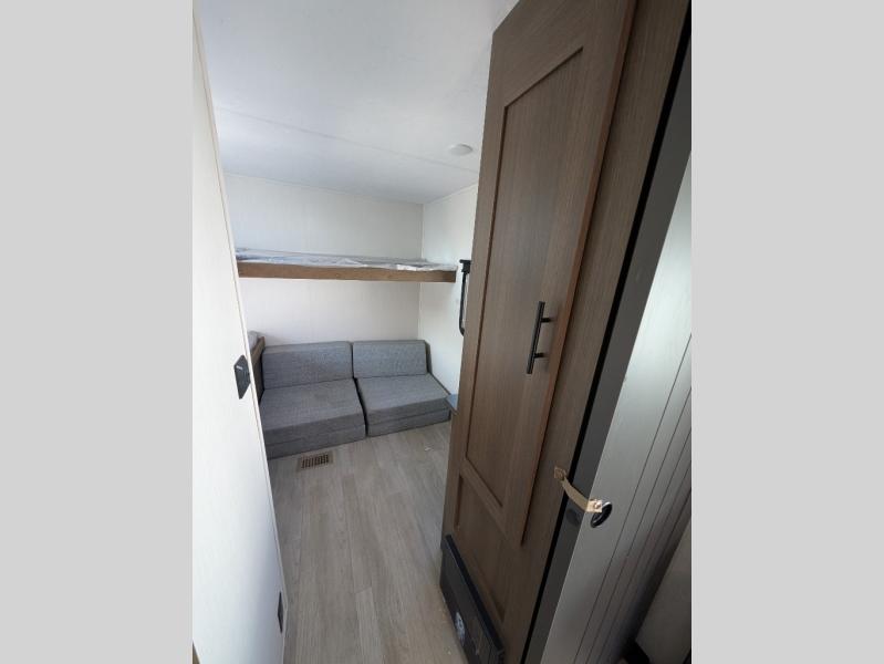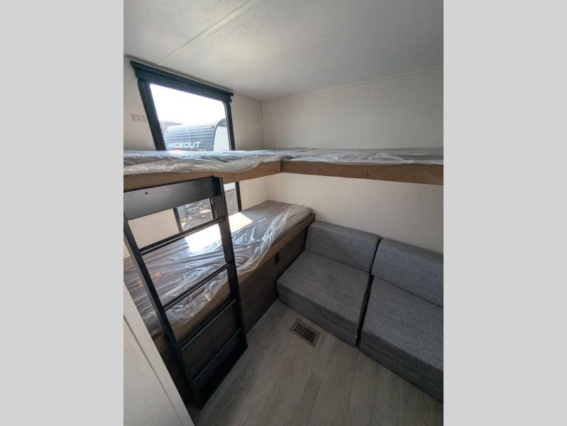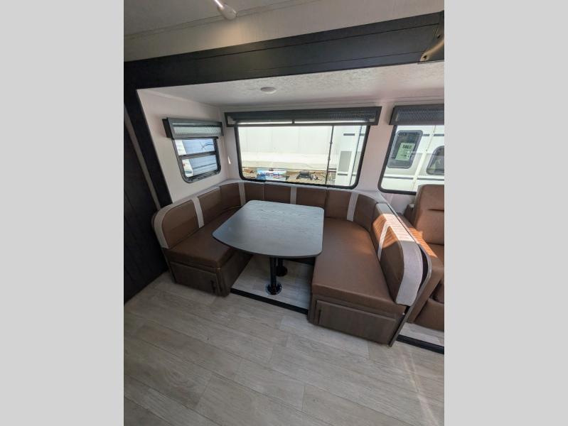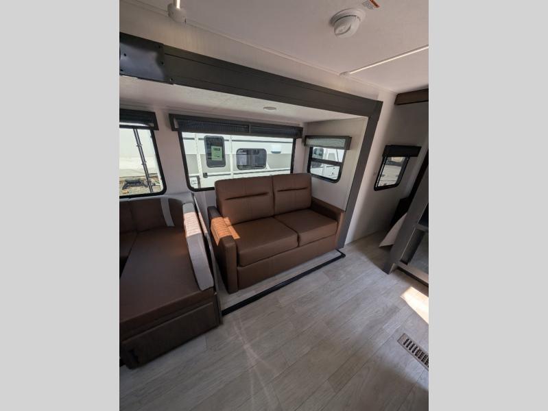 When you want to enjoy the great outdoors, bring your at-home comforts with you in this spacious travel trailer. You can easily sleep ten people thanks to the bunkhouse that includes triple bunks and Vibe cubes. You and your spouse will feel right at home in the front private bedroom on the queen bed, and any other guests can sleep on the U-shaped dinette and sleeper sofa within the large slide out. This model includes all the kitchen appliances needed to cook meals each day, including a three burner cooktop and a black oven, a microwave oven, and plenty of counter space. There is even an exterior grill if you love a sunrise breakfast!