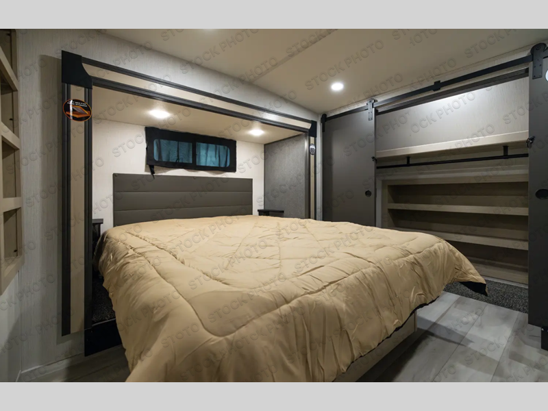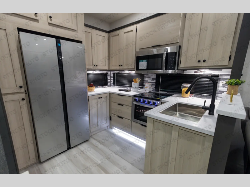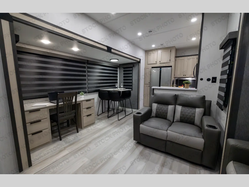 For the couple who love to cook, this fifth wheel is the perfect choice! There is generous counter space in the rear kitchen, along with overhead cabinetry, and a hi-top table and chairs for dining space. Beside the table is a desk with a chair and oversized opening windows so you can still enjoy nature views if you have to work. When it's time to relax, the tri-fold sofa and theater seating in the living room will do the trick, or you can head outdoors to enjoy the two power awnings. A full bath will let you freshen up before bed, and speaking of bedtime, the king bed slide out in the front bedroom is sure to bring comfort. There is also a walk-in wardrobe with washer and dryer prep and a dresser to keep your space tidy!