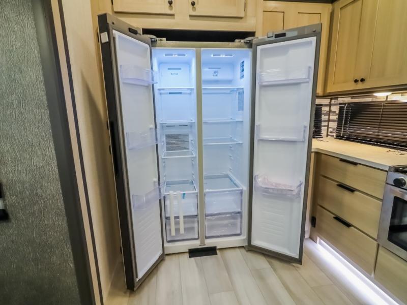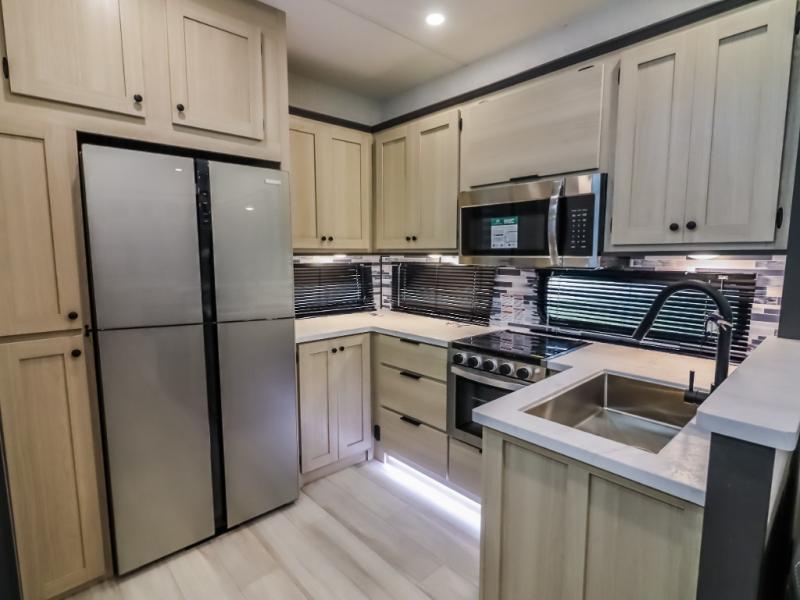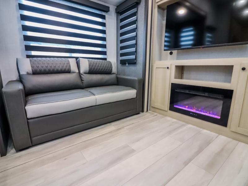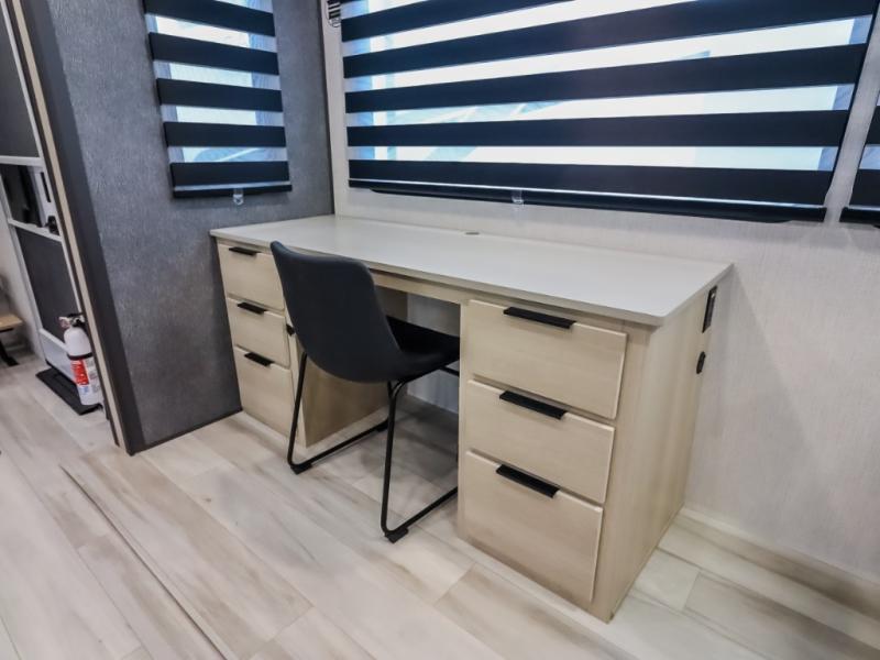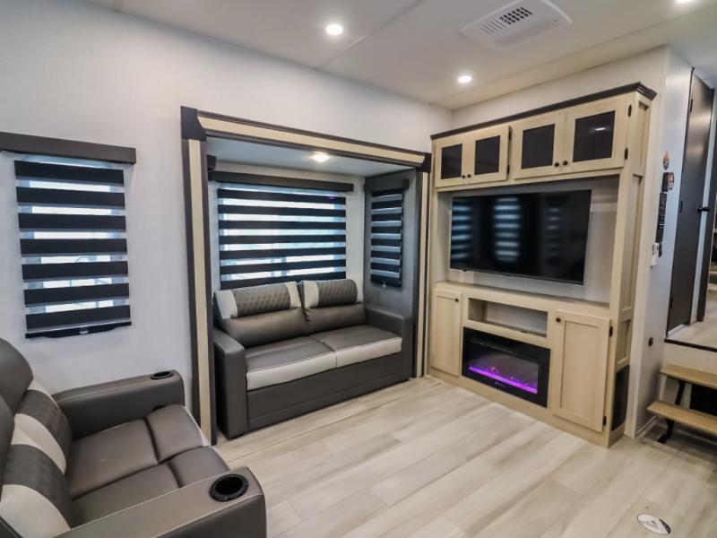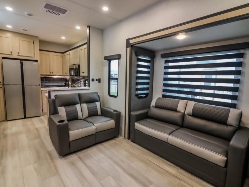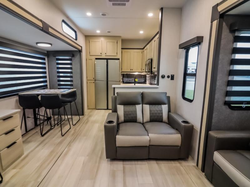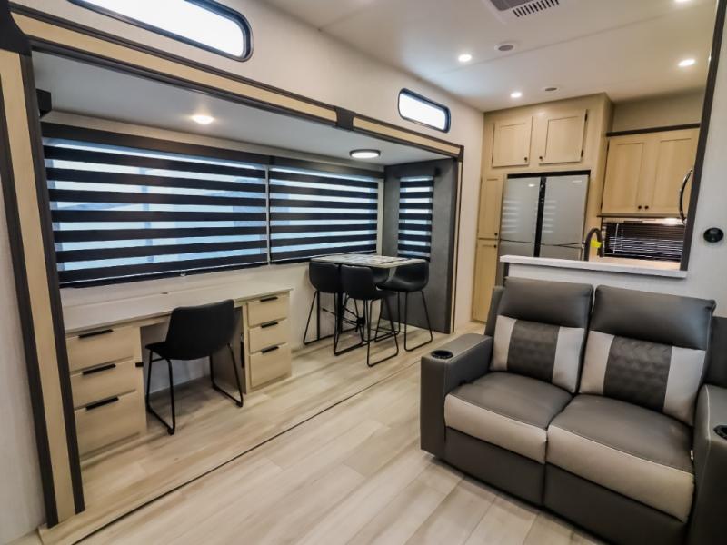 For the couple who love to cook, this fifth wheel is the perfect choice! There is generous counter space in the rear kitchen, along with overhead cabinetry, and a hi-top table and chairs for dining space. Beside the table is a desk with a chair and oversized opening windows so you can still enjoy nature views if you have to work. When it's time to relax, the tri-fold sofa and theater seating in the living room will do the trick, or you can head outdoors to enjoy the two power awnings. A full bath will let you freshen up before bed, and speaking of bedtime, the king bed slide out in the front bedroom is sure to bring comfort. There is also a walk-in wardrobe with washer and dryer prep and a dresser to keep your space tidy!