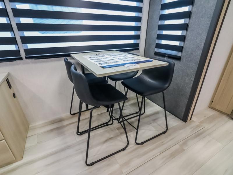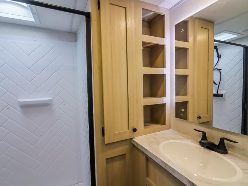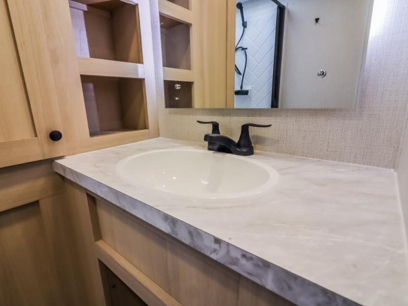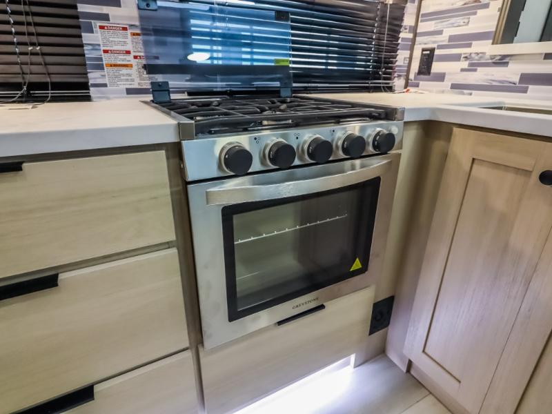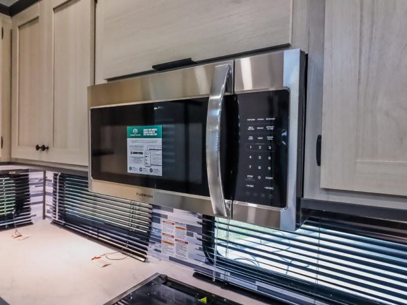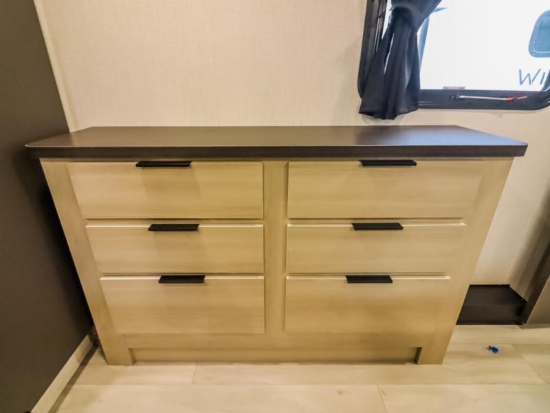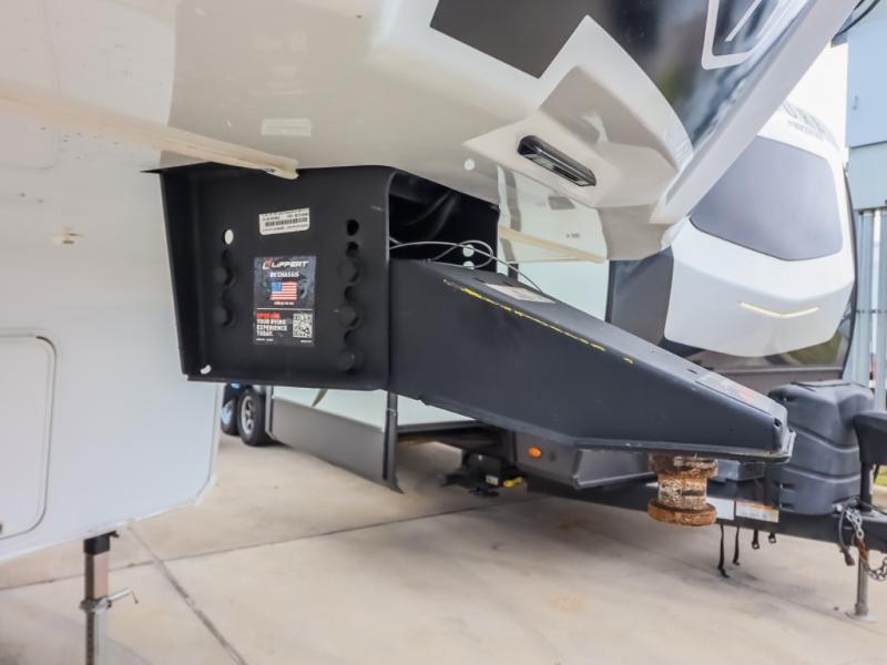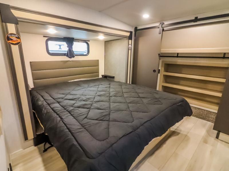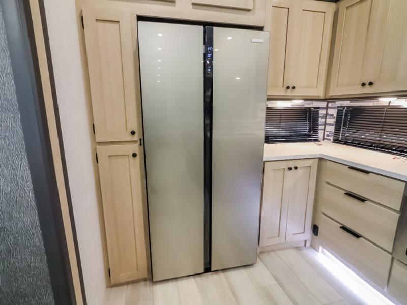 For the couple who love to cook, this fifth wheel is the perfect choice! There is generous counter space in the rear kitchen, along with overhead cabinetry, and a hi-top table and chairs for dining space. Beside the table is a desk with a chair and oversized opening windows so you can still enjoy nature views if you have to work. When it's time to relax, the tri-fold sofa and theater seating in the living room will do the trick, or you can head outdoors to enjoy the two power awnings. A full bath will let you freshen up before bed, and speaking of bedtime, the king bed slide out in the front bedroom is sure to bring comfort. There is also a walk-in wardrobe with washer and dryer prep and a dresser to keep your space tidy!