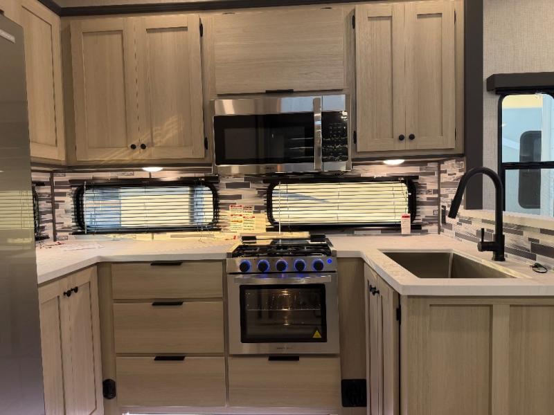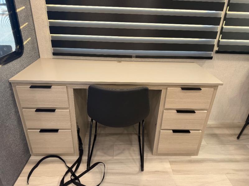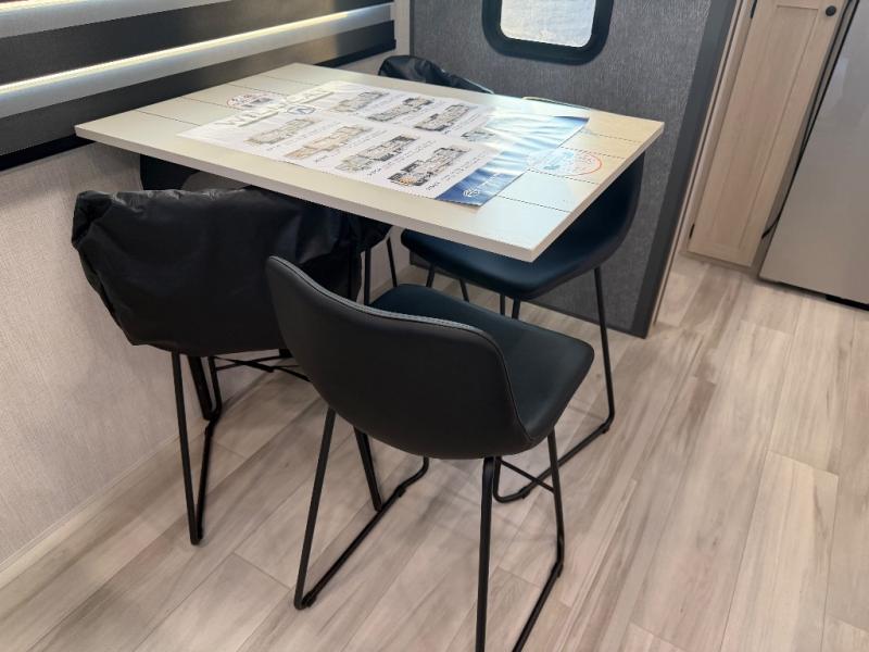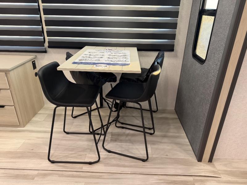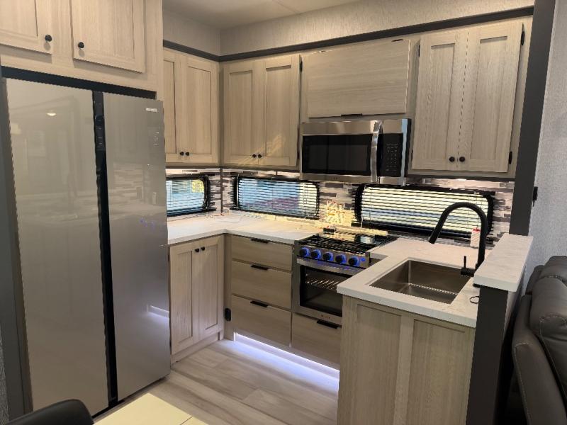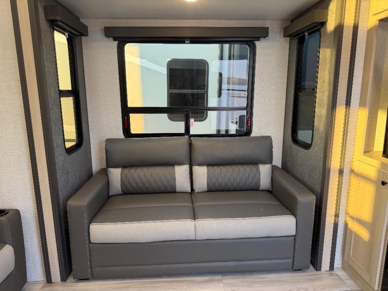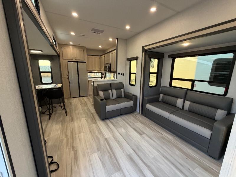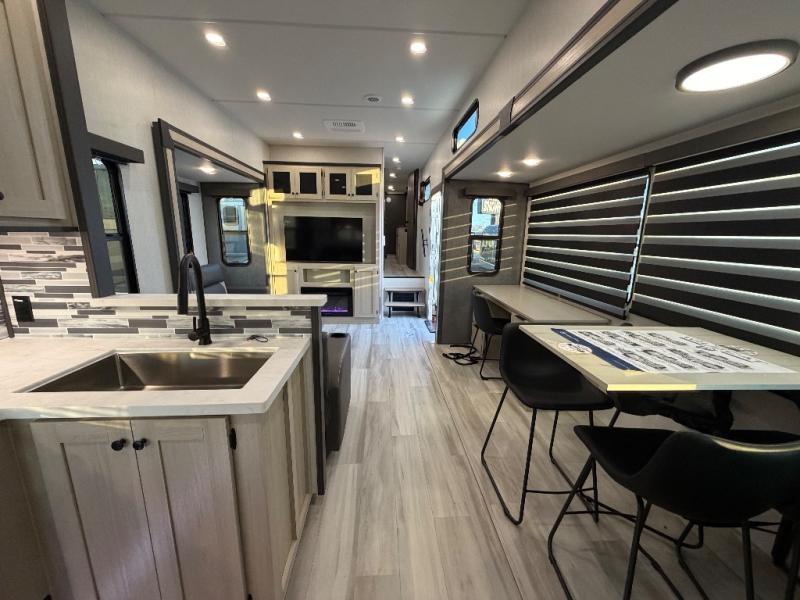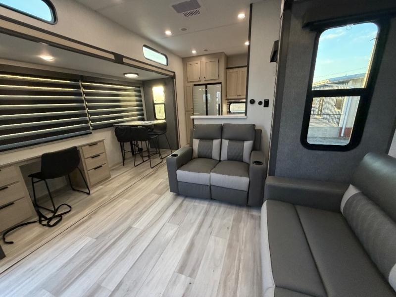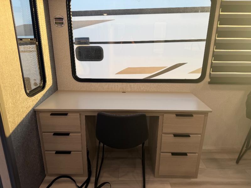 For the couple who love to cook, this fifth wheel is the perfect choice! There is generous counter space in the rear kitchen, along with overhead cabinetry, and a hi-top table and chairs for dining space. Beside the table is a desk with a chair and oversized opening windows so you can still enjoy nature views if you have to work. When it's time to relax, the tri-fold sofa and theater seating in the living room will do the trick, or you can head outdoors to enjoy the two power awnings. A full bath will let you freshen up before bed, and speaking of bedtime, the king bed slide out in the front bedroom is sure to bring comfort. There is also a walk-in wardrobe with washer and dryer prep and a dresser to keep your space tidy!
