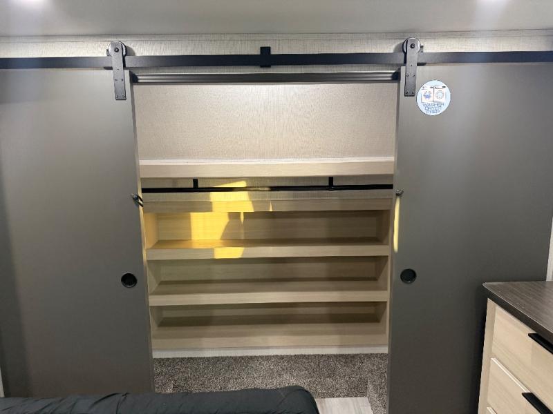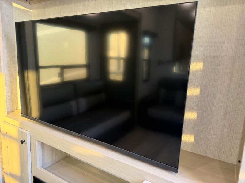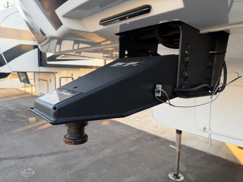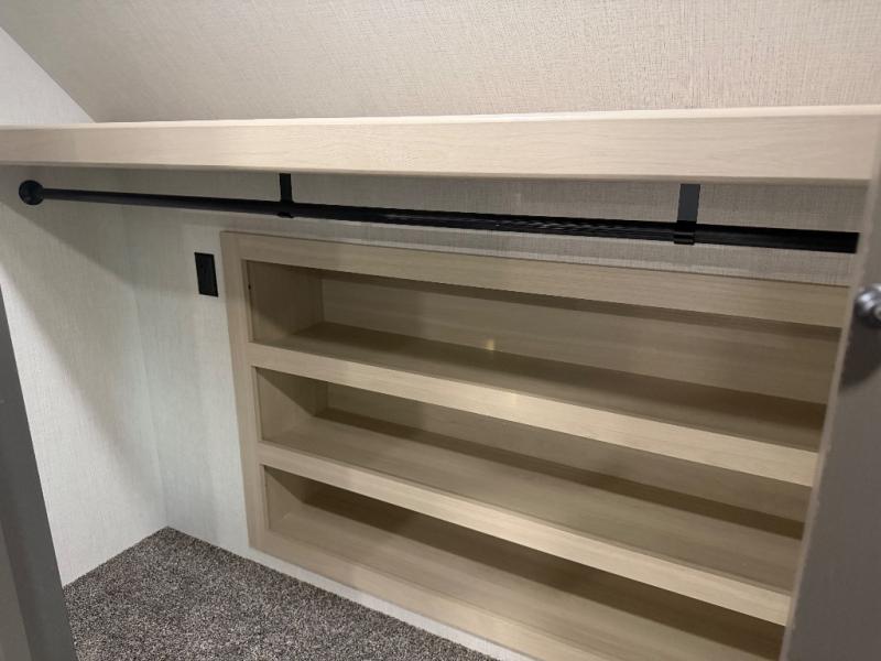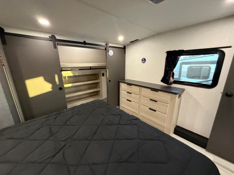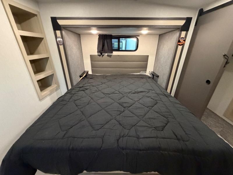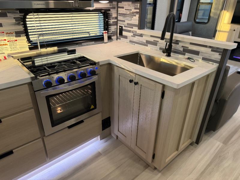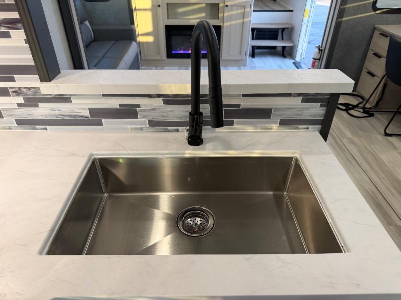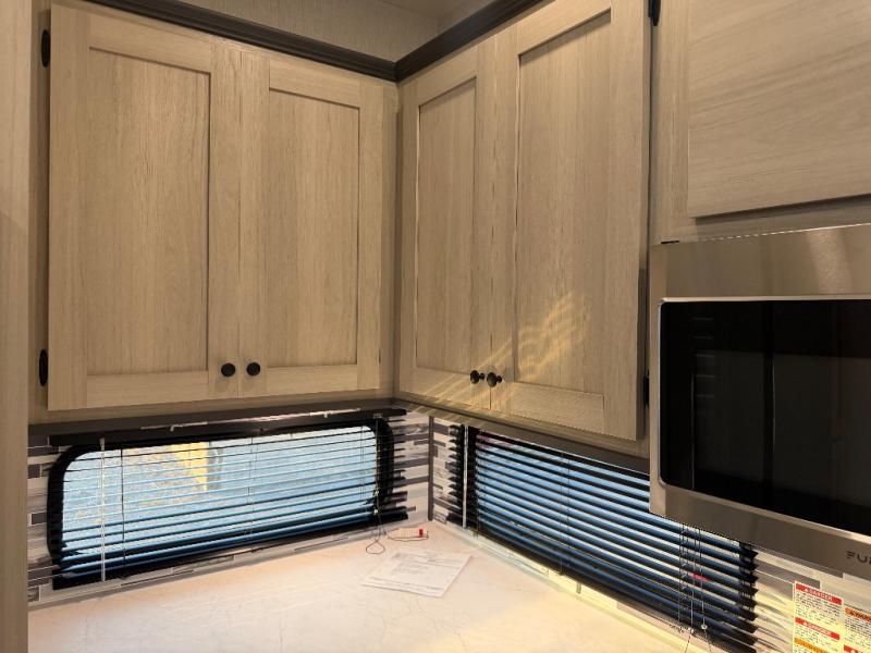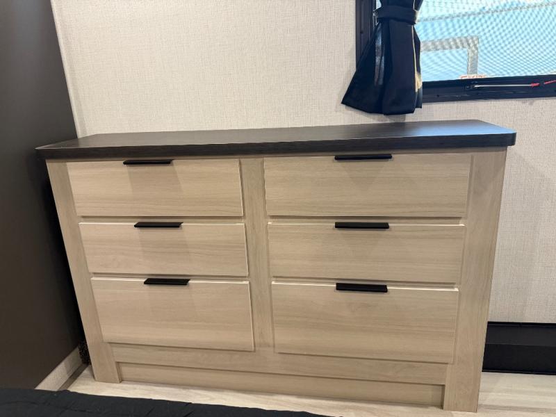 For the couple who love to cook, this fifth wheel is the perfect choice! There is generous counter space in the rear kitchen, along with overhead cabinetry, and a hi-top table and chairs for dining space. Beside the table is a desk with a chair and oversized opening windows so you can still enjoy nature views if you have to work. When it's time to relax, the tri-fold sofa and theater seating in the living room will do the trick, or you can head outdoors to enjoy the two power awnings. A full bath will let you freshen up before bed, and speaking of bedtime, the king bed slide out in the front bedroom is sure to bring comfort. There is also a walk-in wardrobe with washer and dryer prep and a dresser to keep your space tidy!