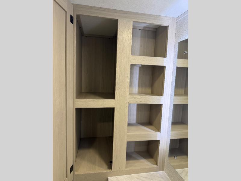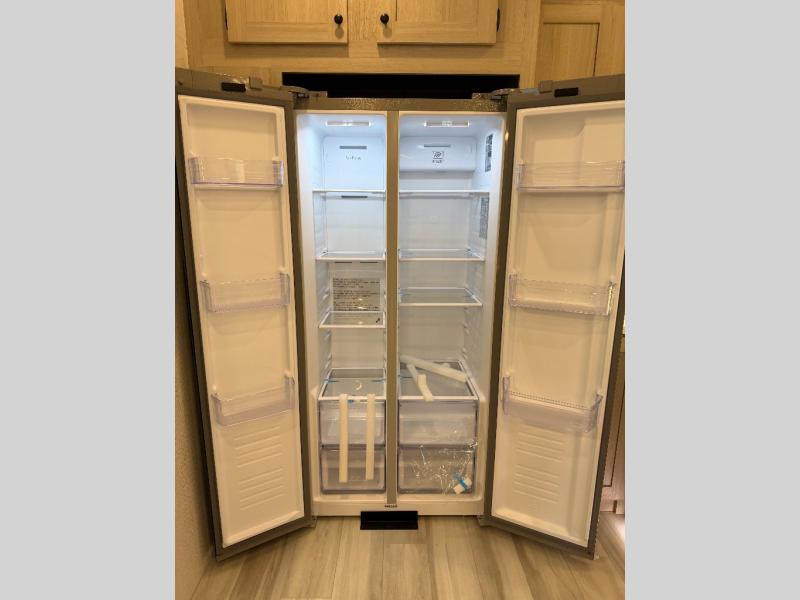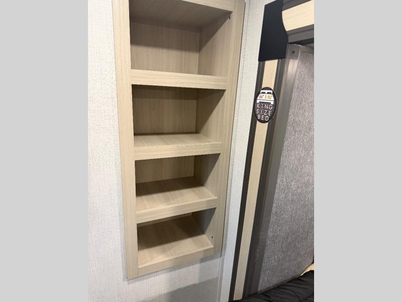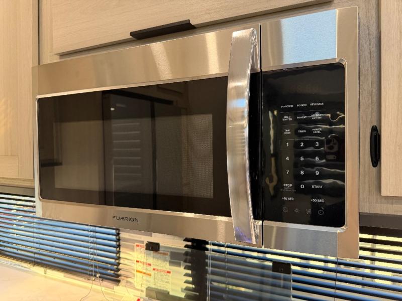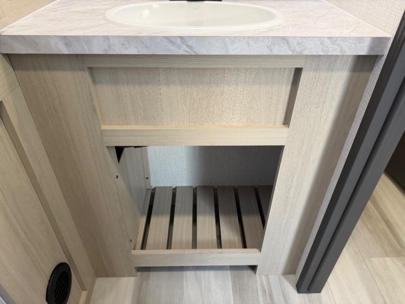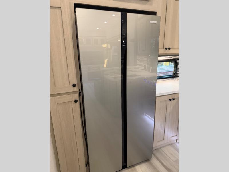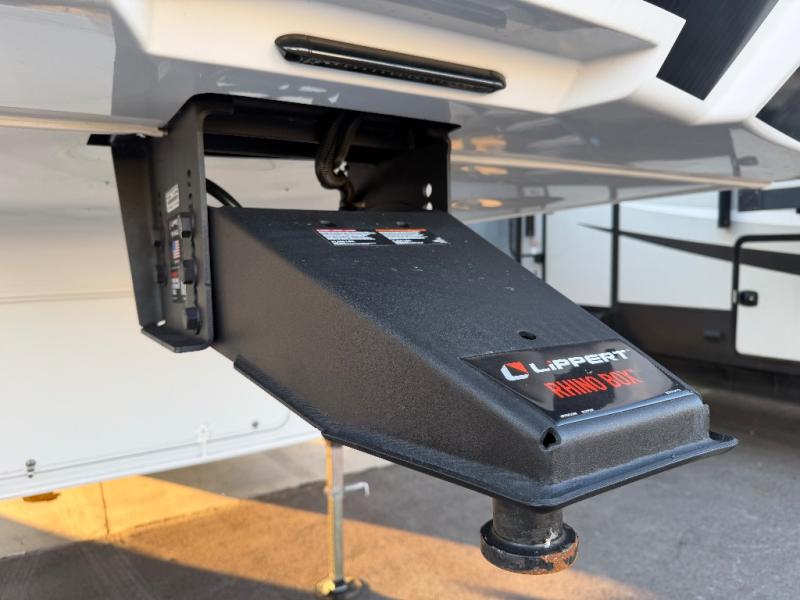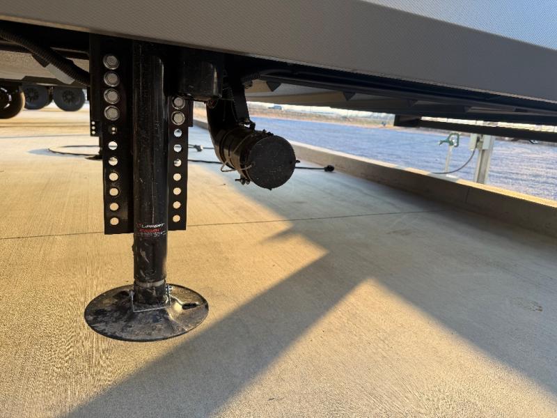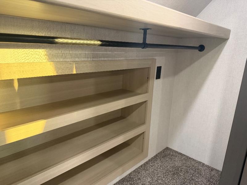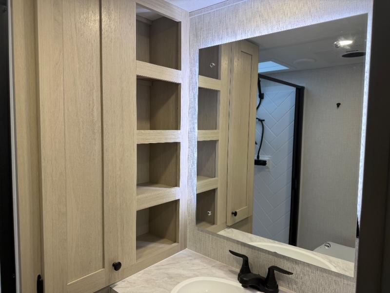 For the couple who love to cook, this fifth wheel is the perfect choice! There is generous counter space in the rear kitchen, along with overhead cabinetry, and a hi-top table and chairs for dining space. Beside the table is a desk with a chair and oversized opening windows so you can still enjoy nature views if you have to work. When it's time to relax, the tri-fold sofa and theater seating in the living room will do the trick, or you can head outdoors to enjoy the two power awnings. A full bath will let you freshen up before bed, and speaking of bedtime, the king bed slide out in the front bedroom is sure to bring comfort. There is also a walk-in wardrobe with washer and dryer prep and a dresser to keep your space tidy!