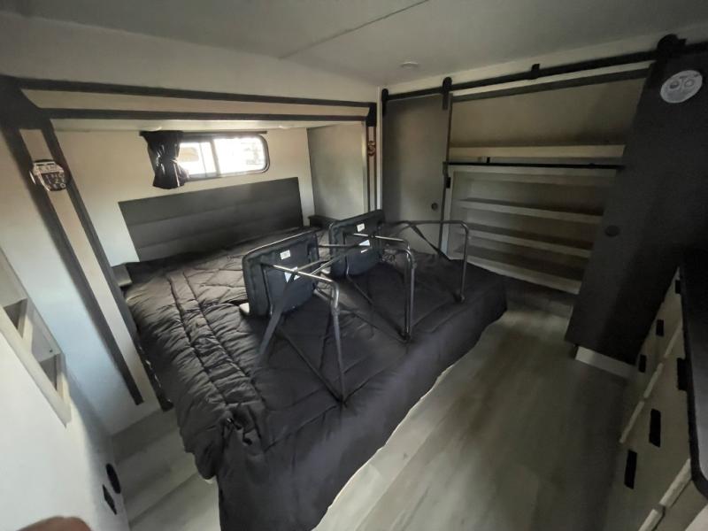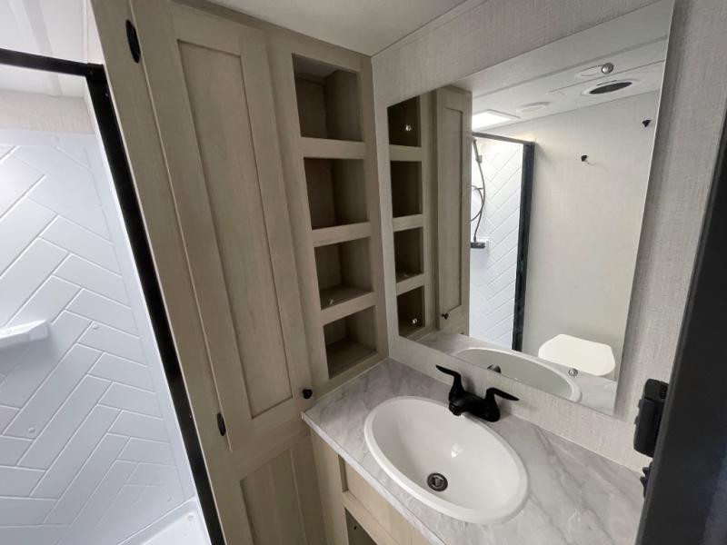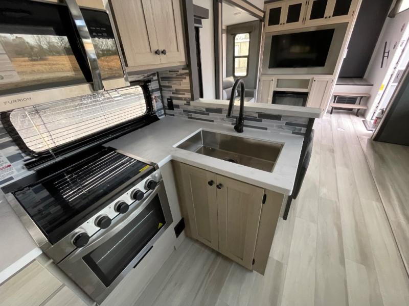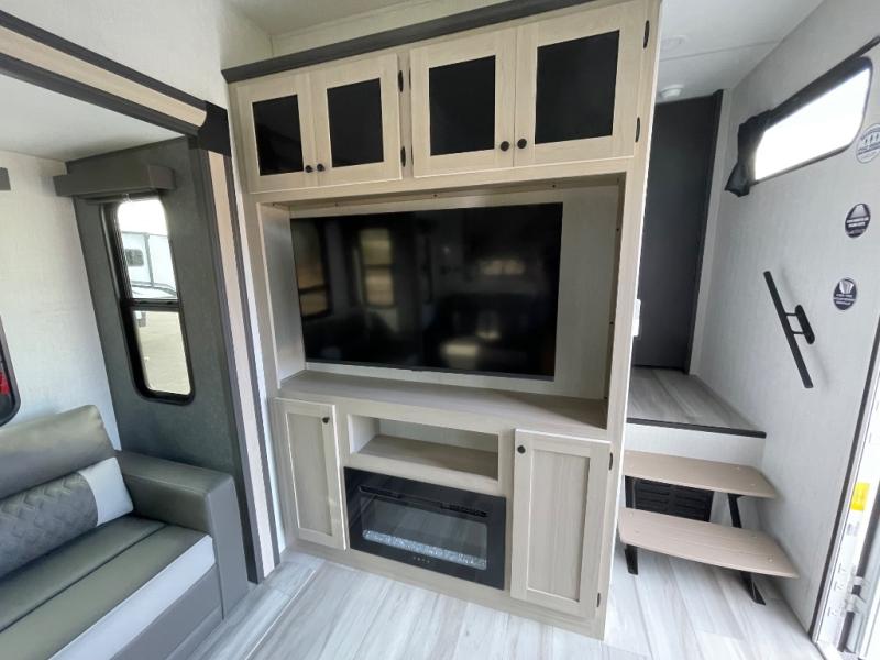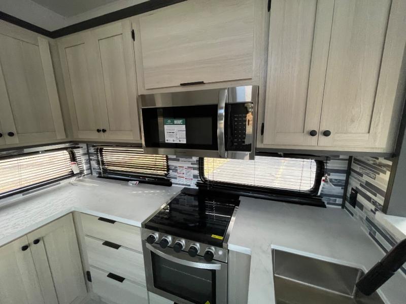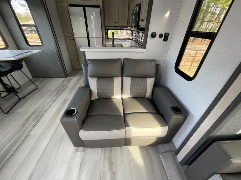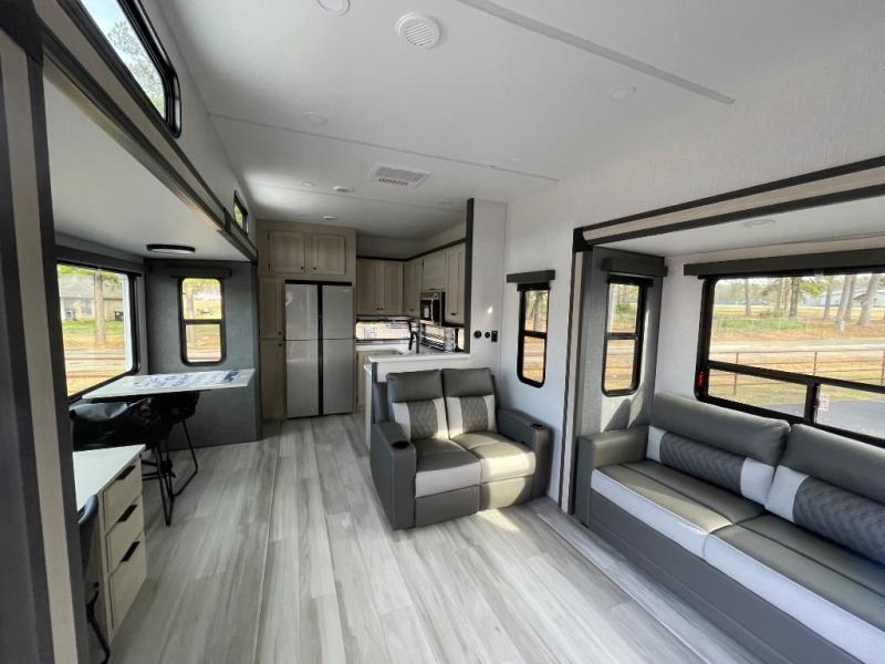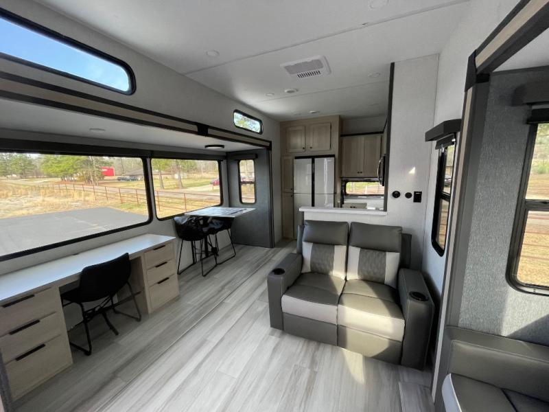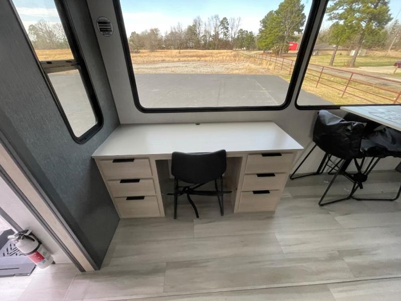 For the couple who love to cook, this fifth wheel is the perfect choice! There is generous counter space in the rear kitchen, along with overhead cabinetry, and a hi-top table and chairs for dining space. Beside the table is a desk with a chair and oversized opening windows so you can still enjoy nature views if you have to work. When it's time to relax, the tri-fold sofa and theater seating in the living room will do the trick, or you can head outdoors to enjoy the two power awnings. A full bath will let you freshen up before bed, and speaking of bedtime, the king bed slide out in the front bedroom is sure to bring comfort. There is also a walk-in wardrobe with washer and dryer prep and a dresser to keep your space tidy!