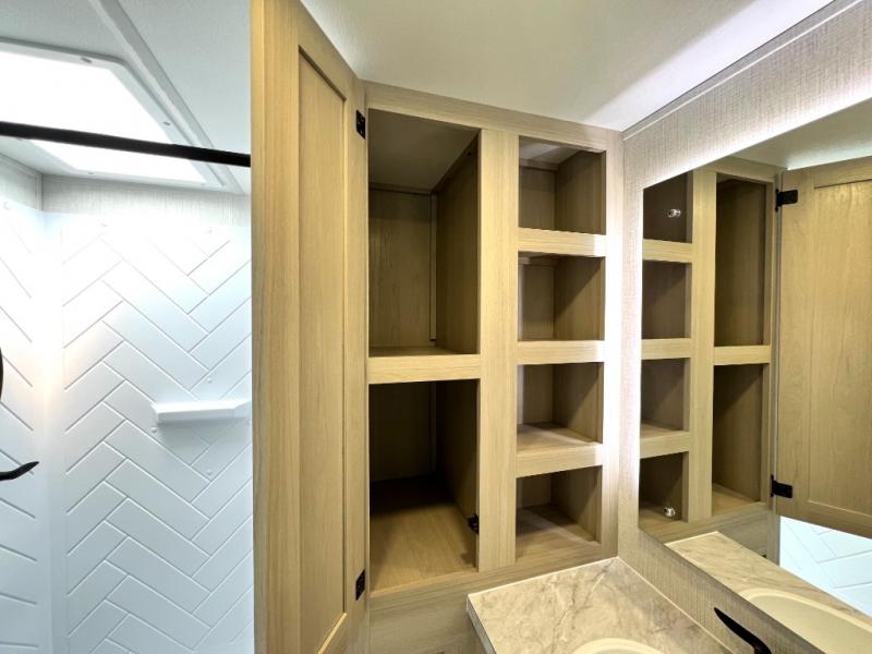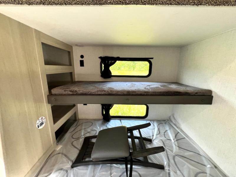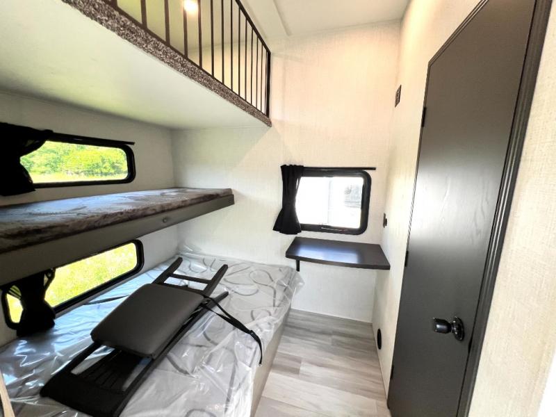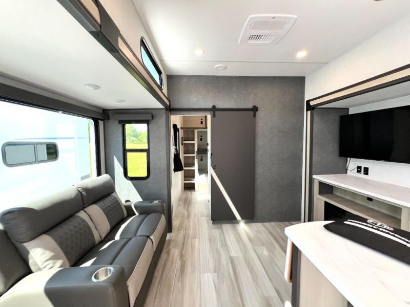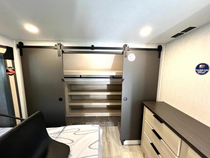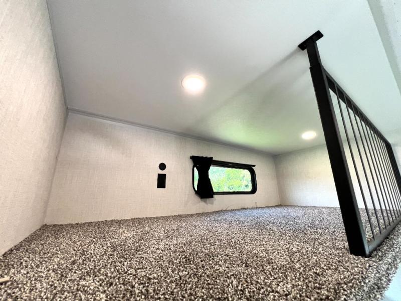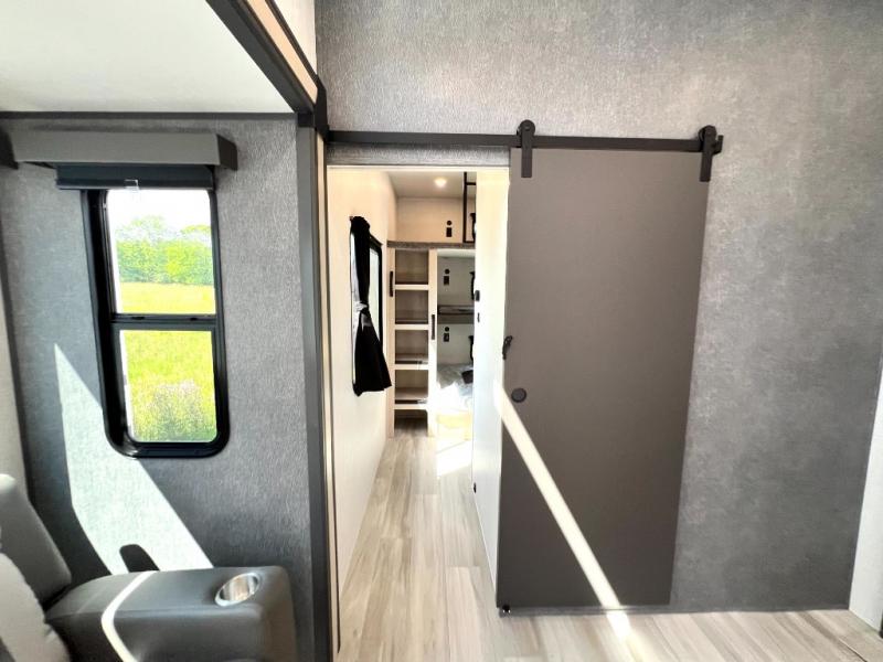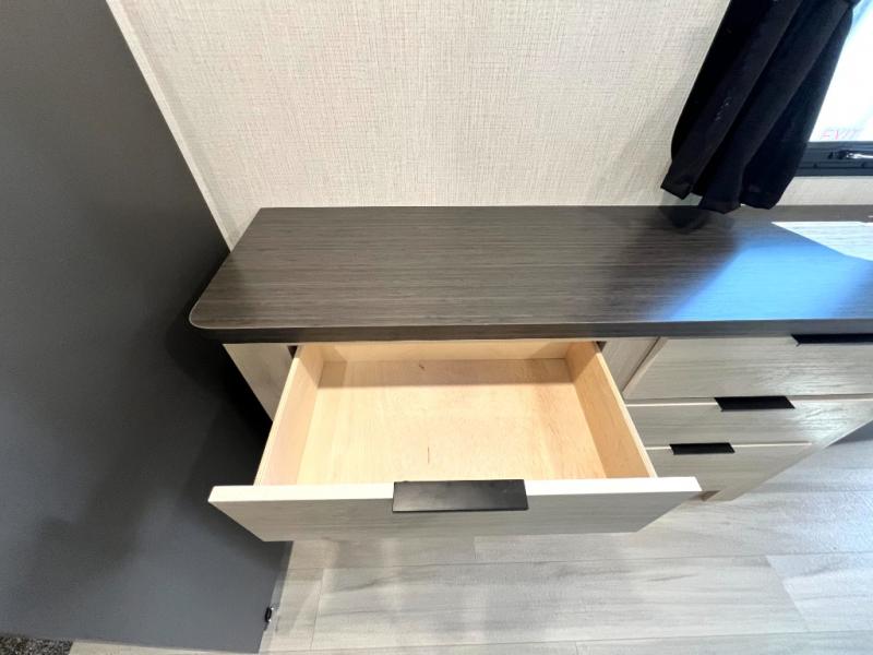 This thoughtfully designed fifth wheel that effortlessly balances privacy, functionality, and social comfort. At the rear we have a bunk house featuring a spacious 54x74-inch bed, accompanied by an upper bunk and a loft, perfect for kids, guests, or a private reading nook. A desk offers a dedicated workspace, while the full bathroom ensures comfort without sacrificing convenience. Moving forward, you'll find dual opposing slides that open up to create a large living area, ideal for gathering, dining, or catching up on entertainment. Here, a kitchen island provides a chef-centric workspace, along with two pantries to keep everything in reach. Toward the front, a serene king-size bedroom awaits, offering a luxurious retreat with a large walk-in closet and dresser providing abundant storage for clothes and essentials.