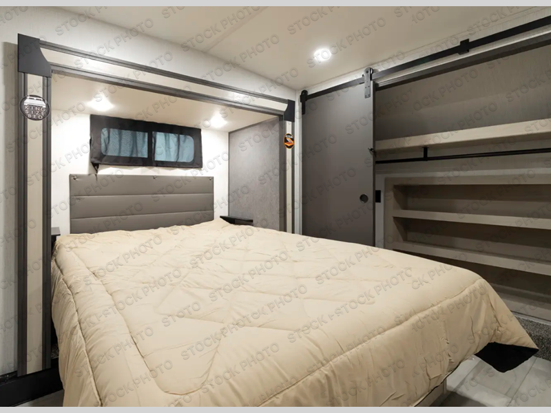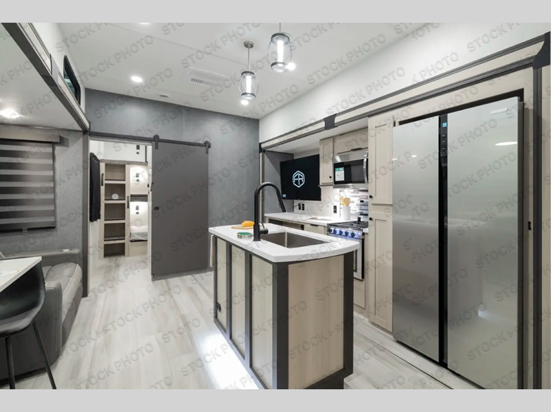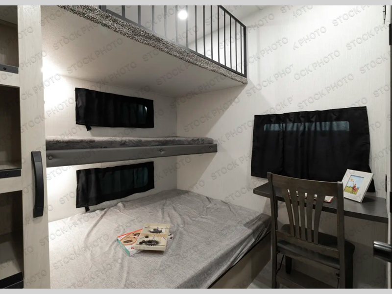 This thoughtfully designed fifth wheel that effortlessly balances privacy, functionality, and social comfort. At the rear we have a bunk house featuring a spacious 54x74-inch bed, accompanied by an upper bunk and a loft, perfect for kids, guests, or a private reading nook. A desk offers a dedicated workspace, while the full bathroom ensures comfort without sacrificing convenience. Moving forward, you'll find dual opposing slides that open up to create a large living area, ideal for gathering, dining, or catching up on entertainment. Here, a kitchen island provides a chef-centric workspace, along with two pantries to keep everything in reach. Toward the front, a serene king-size bedroom awaits, offering a luxurious retreat with a large walk-in closet and dresser providing abundant storage for clothes and essentials.