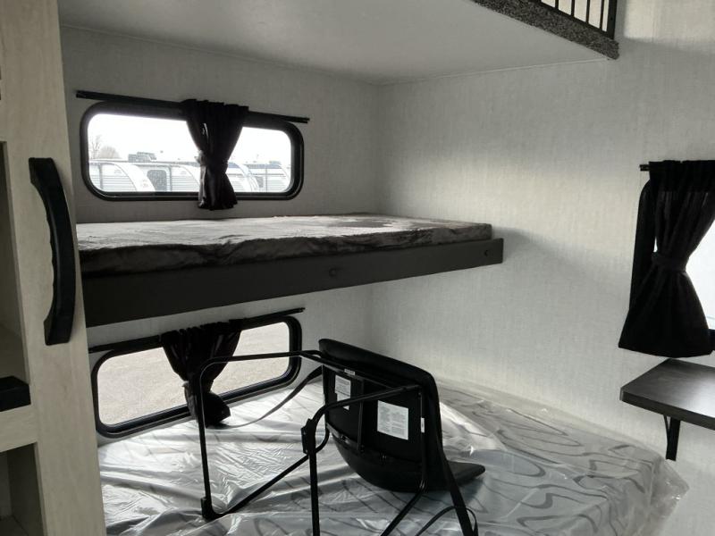 This thoughtfully designed fifth wheel that effortlessly balances privacy, functionality, and social comfort. At the rear we have a bunk house featuring a spacious 54x74-inch bed, accompanied by an upper bunk and a loft, perfect for kids, guests, or a private reading nook. A desk offers a dedicated workspace, while the full bathroom ensures comfort without sacrificing convenience. Moving forward, you'll find dual opposing slides that open up to create a large living area, ideal for gathering, dining, or catching up on entertainment. Here, a kitchen island provides a chef-centric workspace, along with two pantries to keep everything in reach. Toward the front, a serene king-size bedroom awaits, offering a luxurious retreat with a large walk-in closet and dresser providing abundant storage for clothes and essentials.