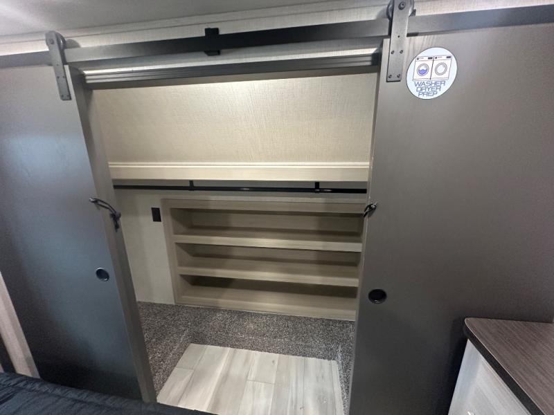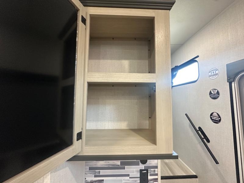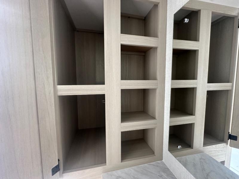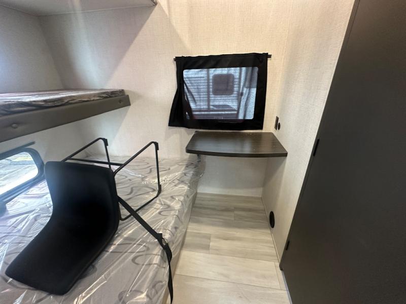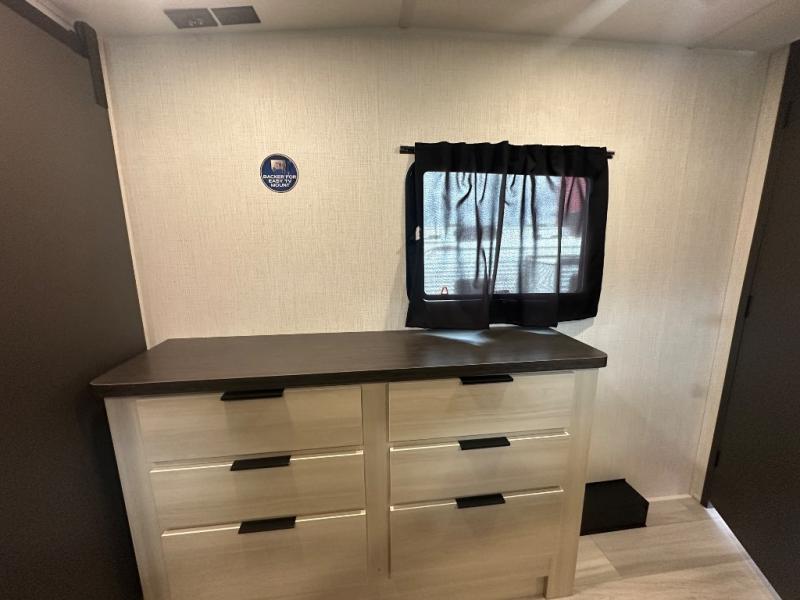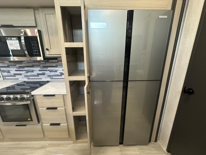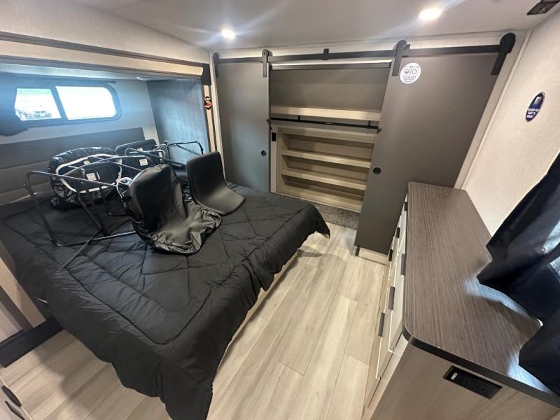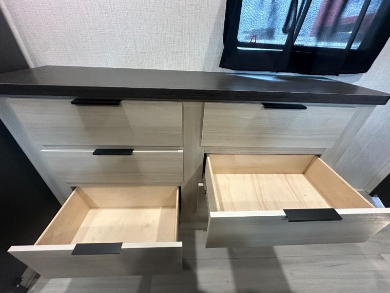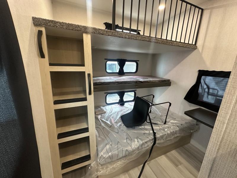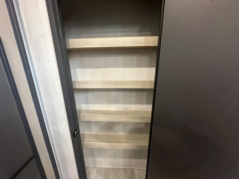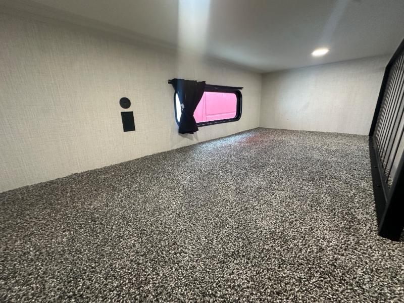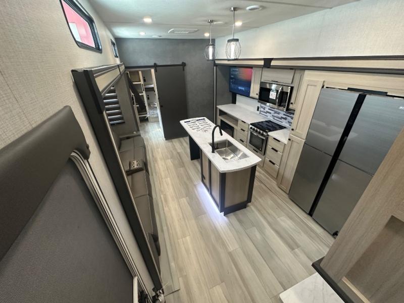 This thoughtfully designed fifth wheel that effortlessly balances privacy, functionality, and social comfort. At the rear we have a bunk house featuring a spacious 54x74-inch bed, accompanied by an upper bunk and a loft, perfect for kids, guests, or a private reading nook. A desk offers a dedicated workspace, while the full bathroom ensures comfort without sacrificing convenience. Moving forward, you'll find dual opposing slides that open up to create a large living area, ideal for gathering, dining, or catching up on entertainment. Here, a kitchen island provides a chef-centric workspace, along with two pantries to keep everything in reach. Toward the front, a serene king-size bedroom awaits, offering a luxurious retreat with a large walk-in closet and dresser providing abundant storage for clothes and essentials.