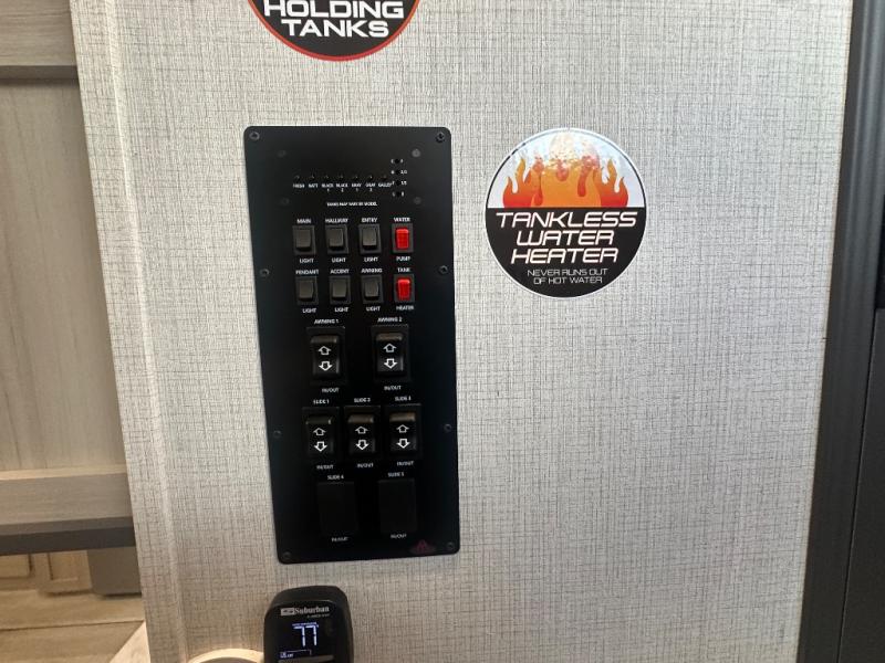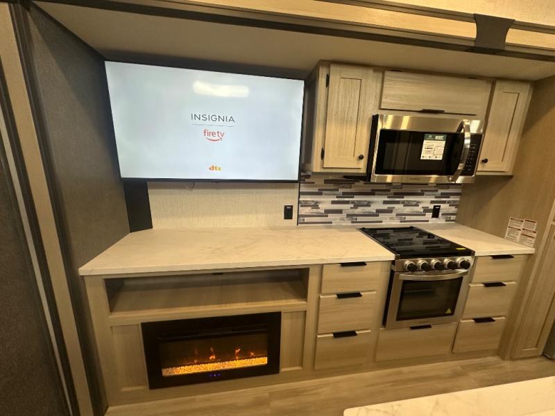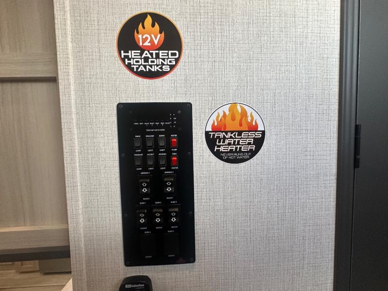 With any Wildcat fifth wheel by Forest River you will enjoy affordable luxury at every turn. These models are constructed with residential fiberglass insulation in the roof and floor, a 4'x6' sectioned underbelly armor, and a vacuum bonded, welded aluminum structure for added strength and durability. You will also find seamless roto-cast holding tanks, an outdoor shower, and 4-point auto leveling for quick and easy setup. Each model includes a best-in-class, high-efficiency 35,000 BTU furnace, along with an electric fireplace with thermostat control and remote, plus a 60,000 BTU tankless water heater for added convenience. There are carpet-free living spaces, residential backsplash, motion lighting throughout, and many more comforts!