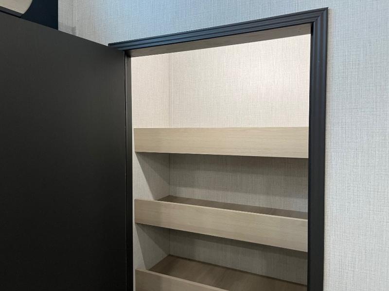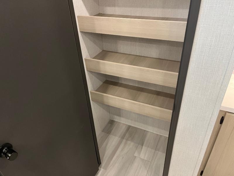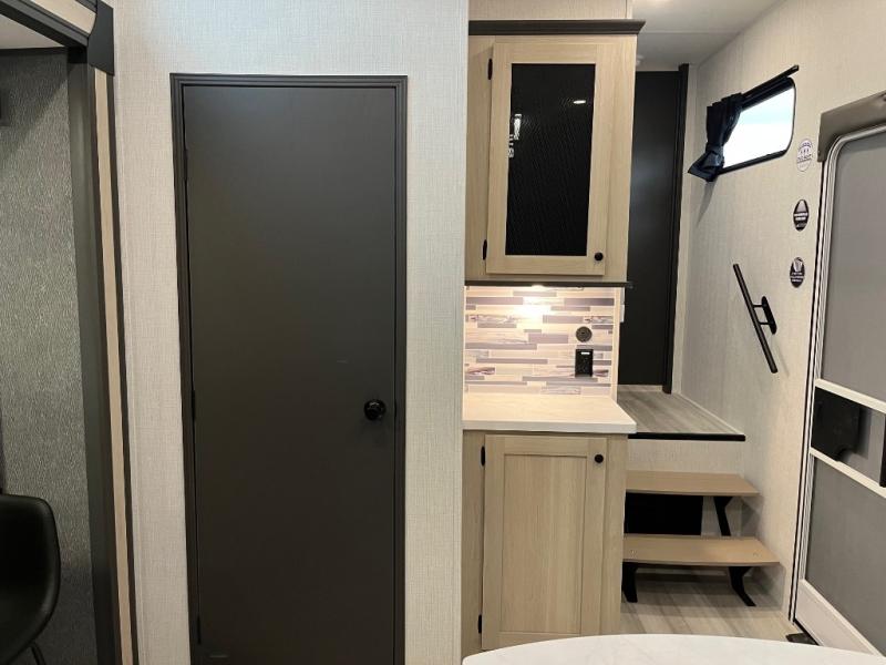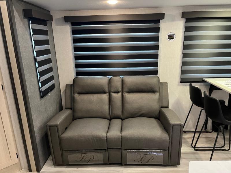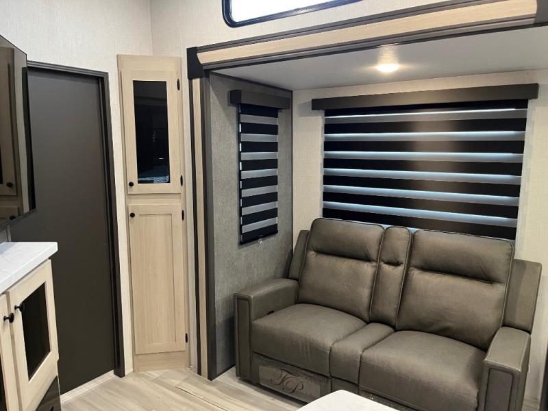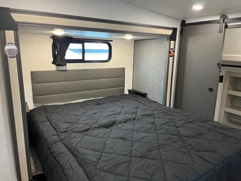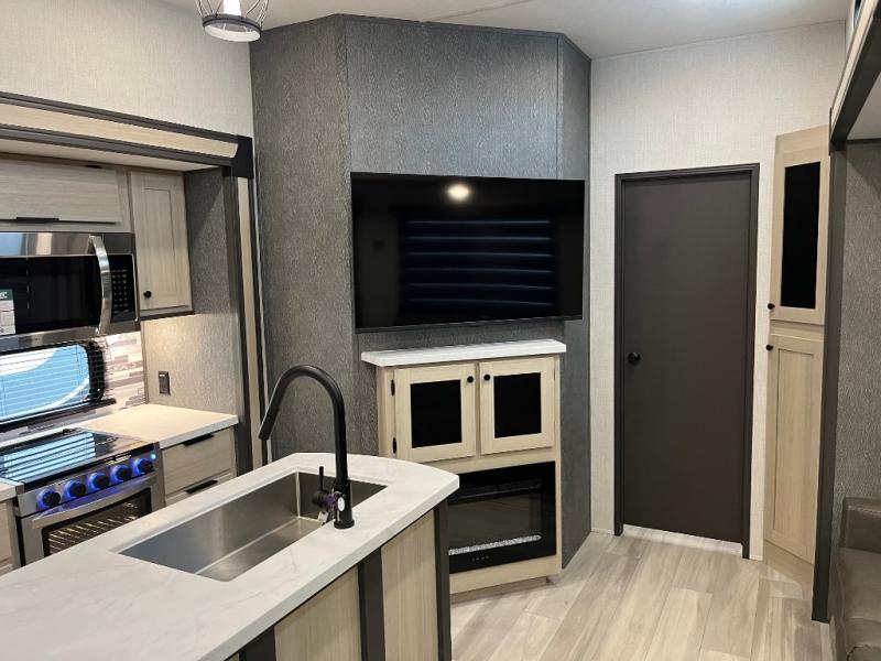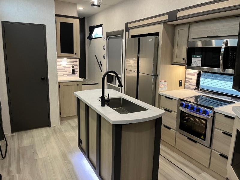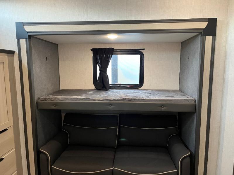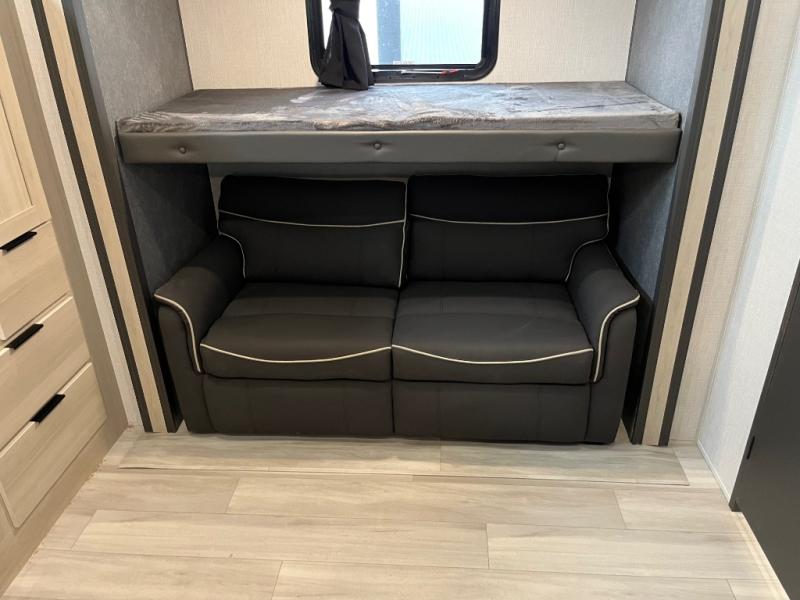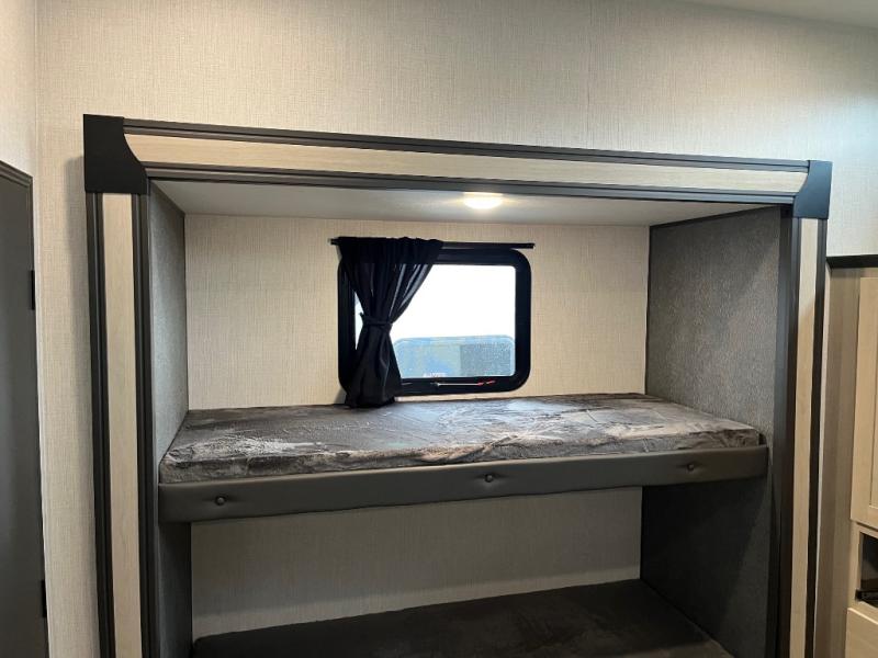 This thoughtfully designed fifth wheel that effortlessly balances privacy, functionality, and social comfort. At the rear we have a bunk house featuring a spacious 54x74-inch bed, accompanied by an upper bunk and a loft, perfect for kids, guests, or a private reading nook. A desk offers a dedicated workspace, while the full bathroom ensures comfort without sacrificing convenience. Moving forward, you'll find dual opposing slides that open up to create a large living area, ideal for gathering, dining, or catching up on entertainment. Here, a kitchen island provides a chef-centric workspace, along with two pantries to keep everything in reach. Toward the front, a serene king-size bedroom awaits, offering a luxurious retreat with a large walk-in closet and dresser providing abundant storage for clothes and essentials.