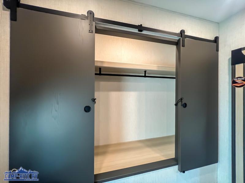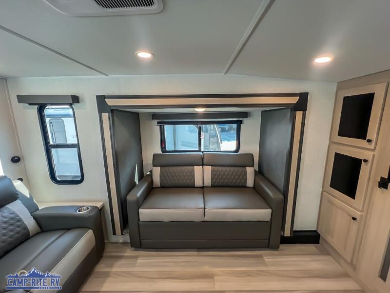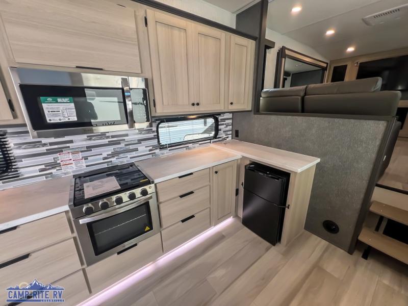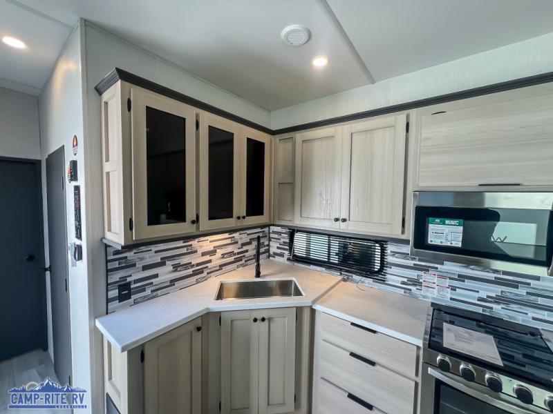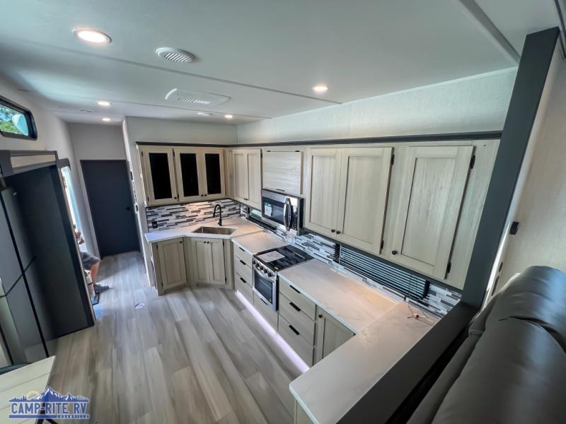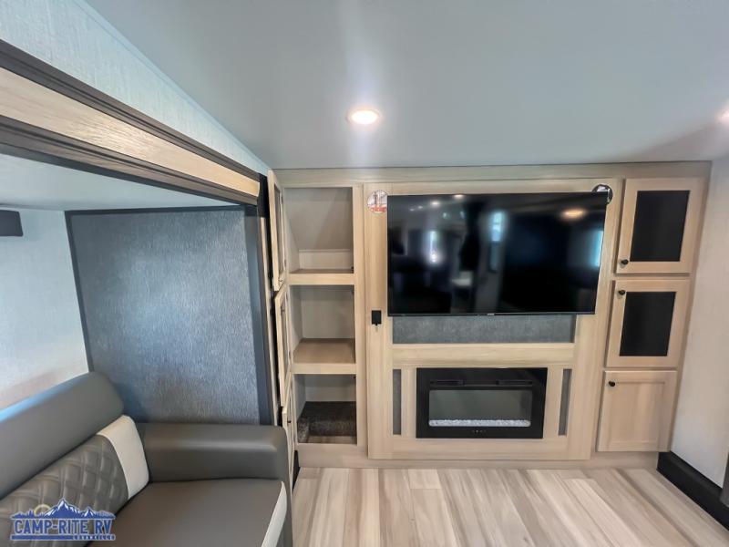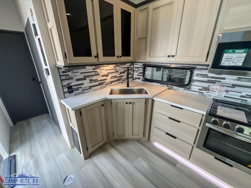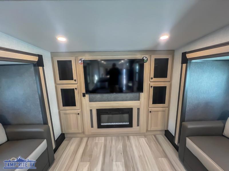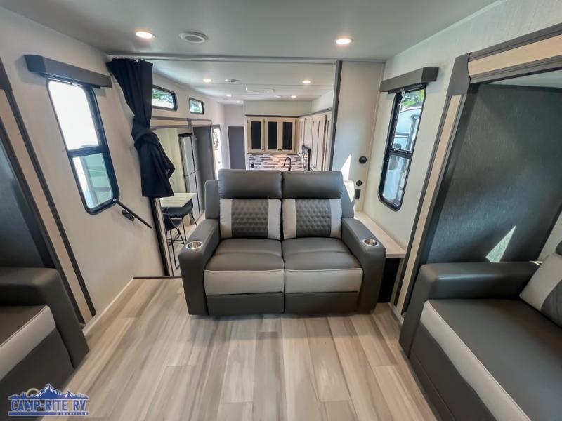 This fifth wheel is packed with features to make each trip enjoyable! The middle kitchen might be your favorite room with wrap-around counter space, a pantry, and a 16 cu. ft. 12V refrigerator for food storage. You can dine at the hi-top table and chairs here, or sit in the front living area on the dual sofas and theater seating! This area can become your guests bedroom at night since there are dual opposing slides and wardrobe storage for their things. You will also find a full-length wardrobe in the rear private bedroom, along with a king bed slide out, plus washer and dryer prep! And of course there is a full bath so everyone can stay clean each day!