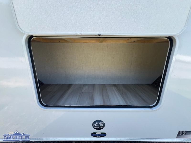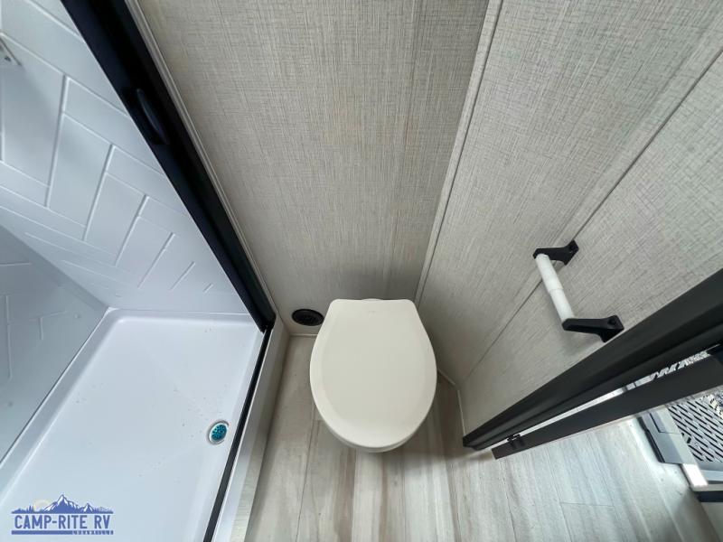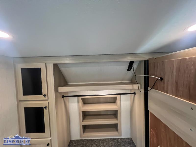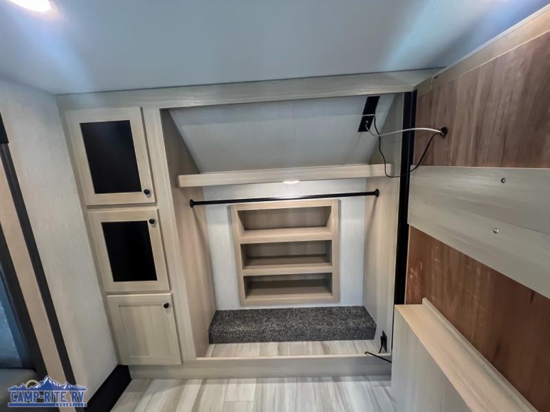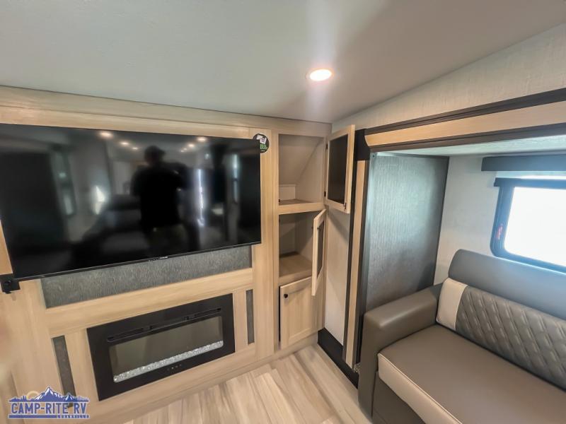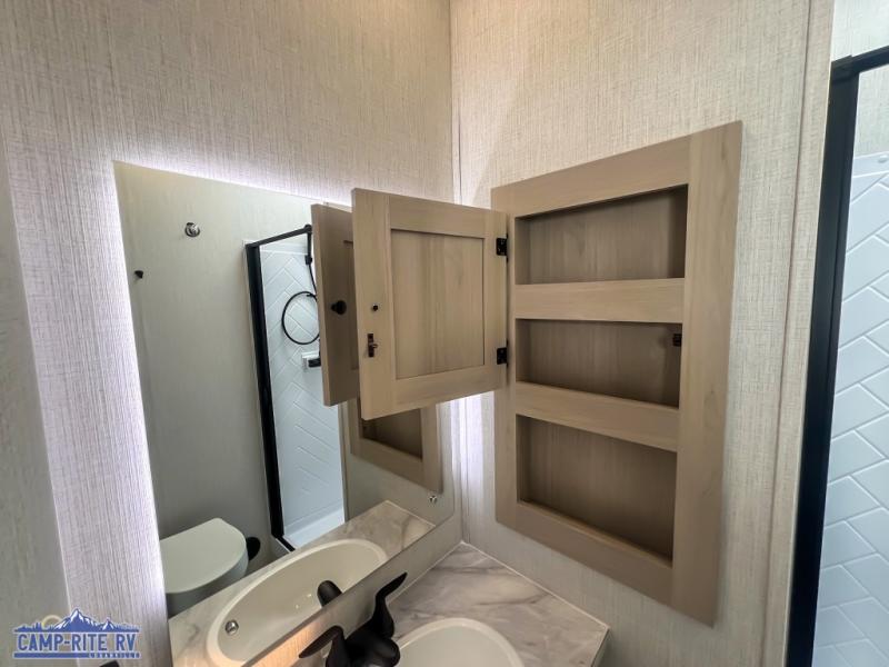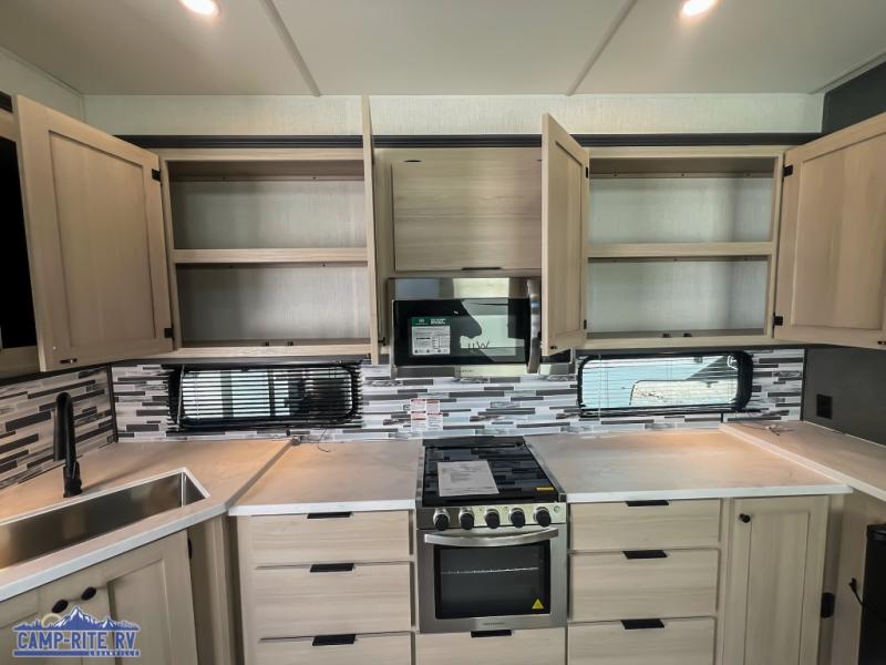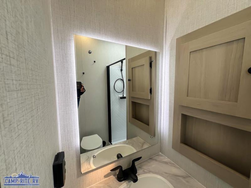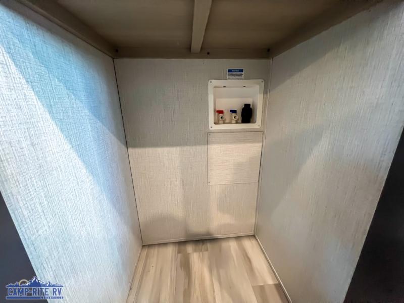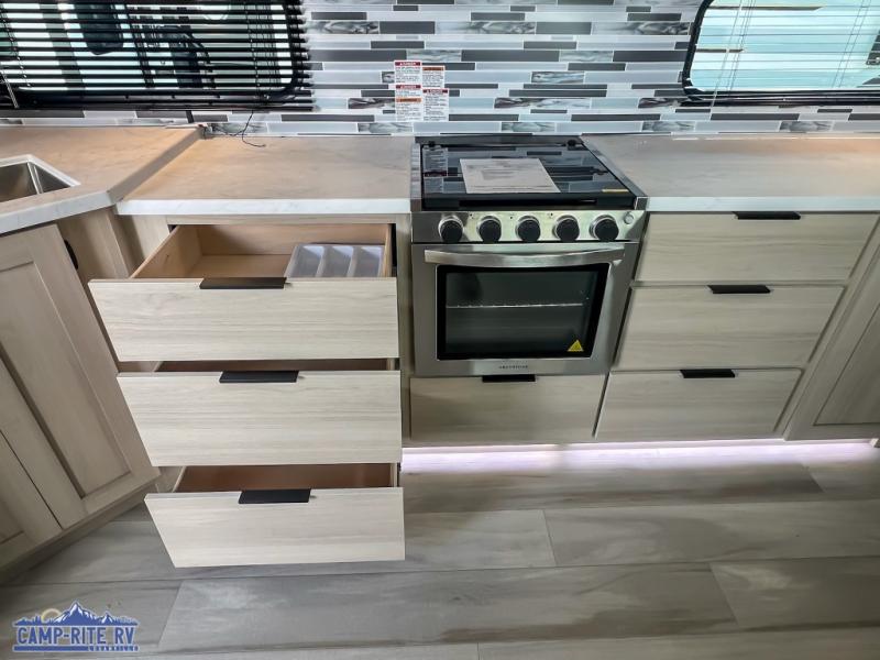 This fifth wheel is packed with features to make each trip enjoyable! The middle kitchen might be your favorite room with wrap-around counter space, a pantry, and a 16 cu. ft. 12V refrigerator for food storage. You can dine at the hi-top table and chairs here, or sit in the front living area on the dual sofas and theater seating! This area can become your guests bedroom at night since there are dual opposing slides and wardrobe storage for their things. You will also find a full-length wardrobe in the rear private bedroom, along with a king bed slide out, plus washer and dryer prep! And of course there is a full bath so everyone can stay clean each day!