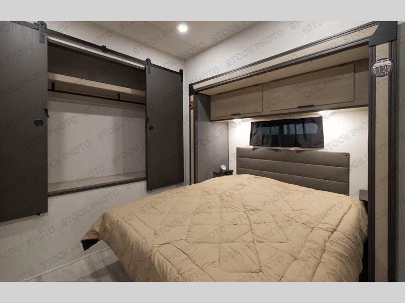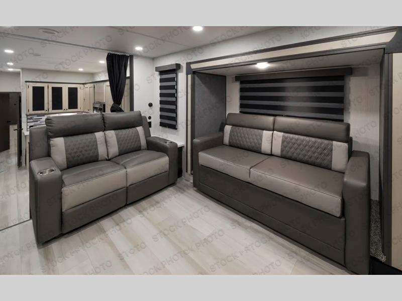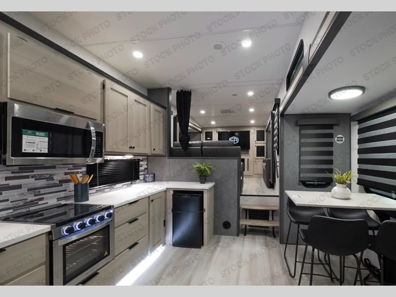 This fifth wheel is packed with features to make each trip enjoyable! The middle kitchen might be your favorite room with wrap-around counter space, a pantry, and a 16 cu. ft. 12V refrigerator for food storage. You can dine at the hi-top table and chairs here, or sit in the front living area on the dual sofas and theater seating! This area can become your guests bedroom at night since there are dual opposing slides and wardrobe storage for their things. You will also find a full-length wardrobe in the rear private bedroom, along with a king bed slide out, plus washer and dryer prep! And of course there is a full bath so everyone can stay clean each day!