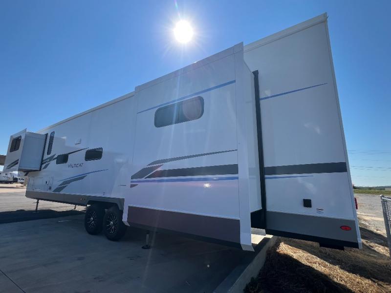 With any Wildcat fifth wheel by Forest River you will enjoy affordable luxury at every turn. These models are constructed with residential fiberglass insulation in the roof and floor, a sectioned ABS plastic underbelly armor, and a vacuum bonded, welded aluminum structure for added strength and durability. You will also find seamless roto-cast holding tanks, an outdoor shower, and 4-point auto leveling for quick and easy setup. Each model includes a best-in-class, high-efficiency 35,000 BTU furnace, along with a 18,000 BTU ducted A/C, with second and third A/C prep, plus an on-demand tankless water heater for added convenience. There are carpet-free living spaces, residential backsplash, motion lighting throughout, and many more comforts!