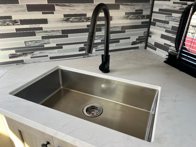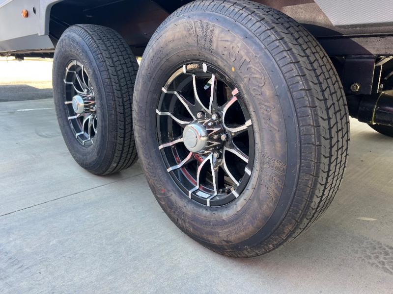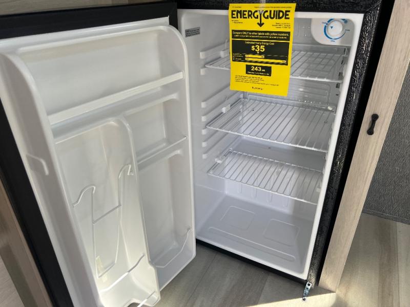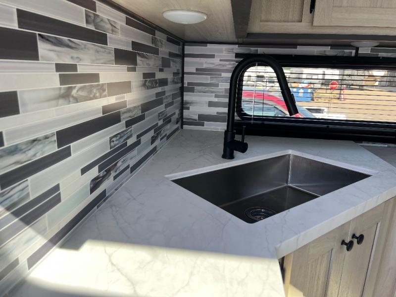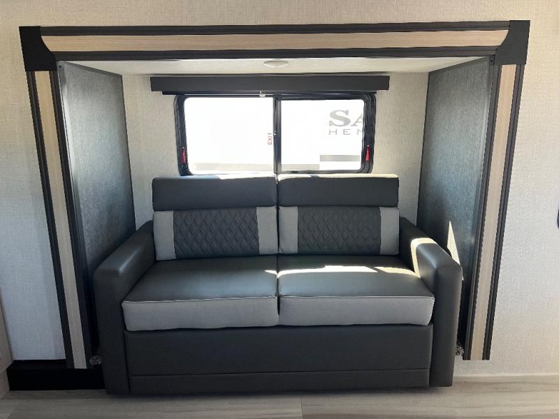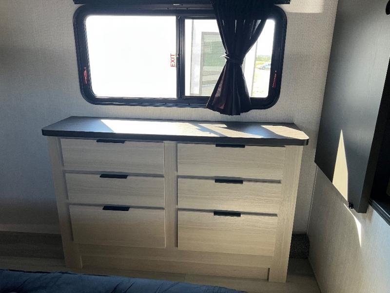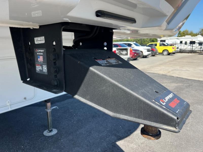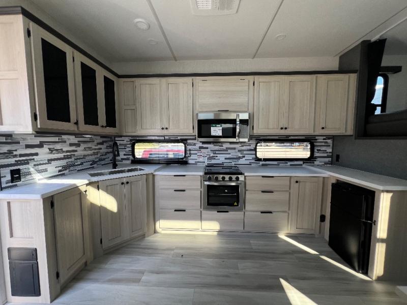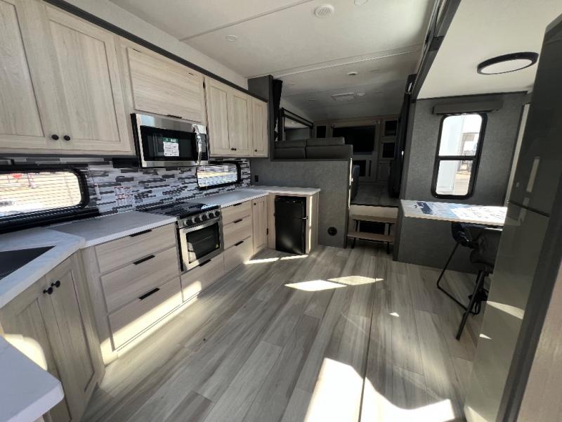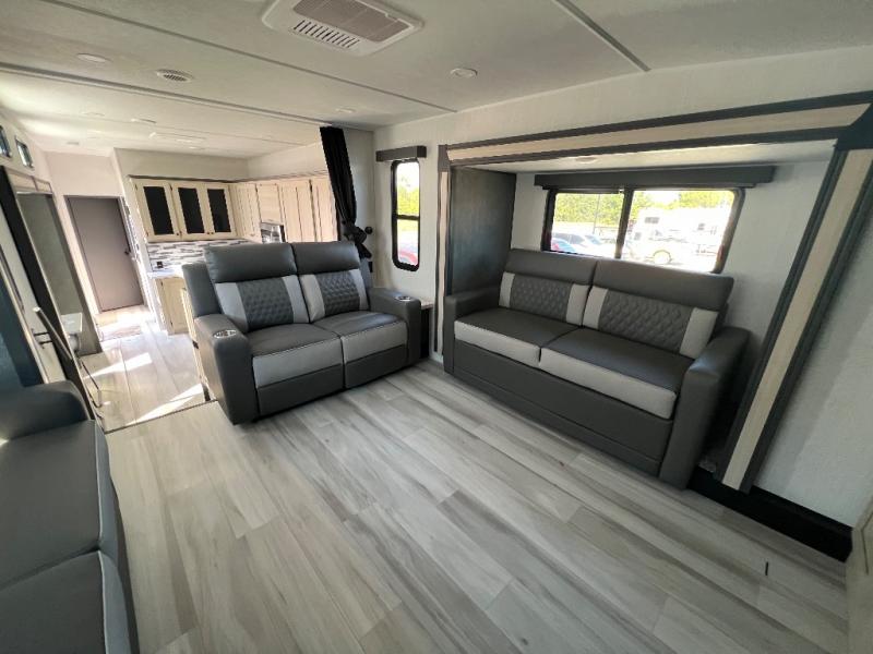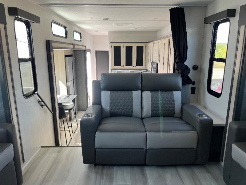 This fifth wheel is packed with features to make each trip enjoyable! The middle kitchen might be your favorite room with wrap-around counter space, a pantry, and a 16 cu. ft. 12V refrigerator for food storage. You can dine at the hi-top table and chairs here, or sit in the front living area on the dual sofas and theater seating! This area can become your guests bedroom at night since there are dual opposing slides and wardrobe storage for their things. You will also find a full-length wardrobe in the rear private bedroom, along with a king bed slide out, plus washer and dryer prep! And of course there is a full bath so everyone can stay clean each day!
