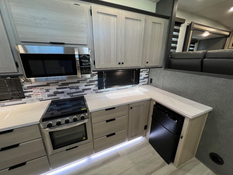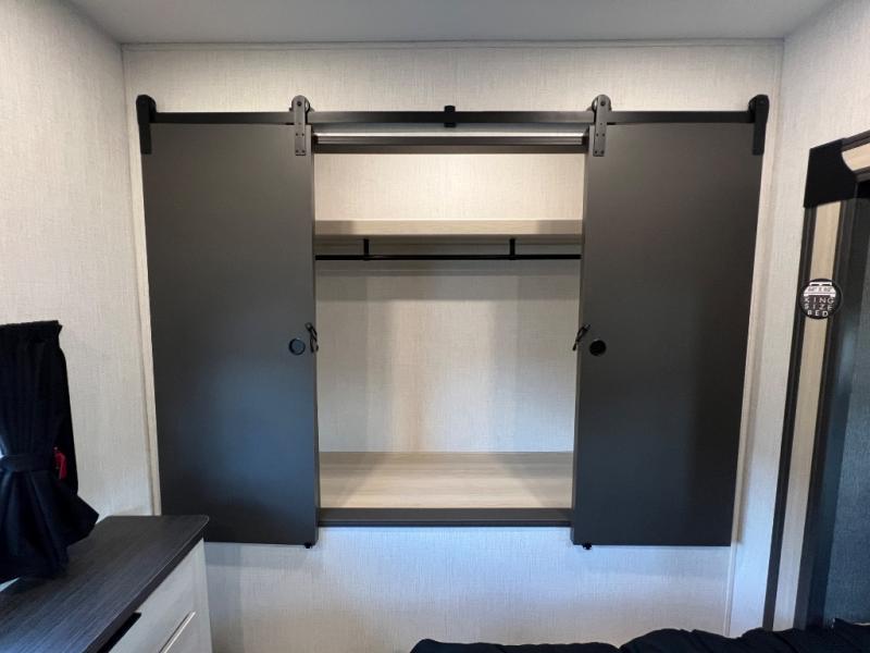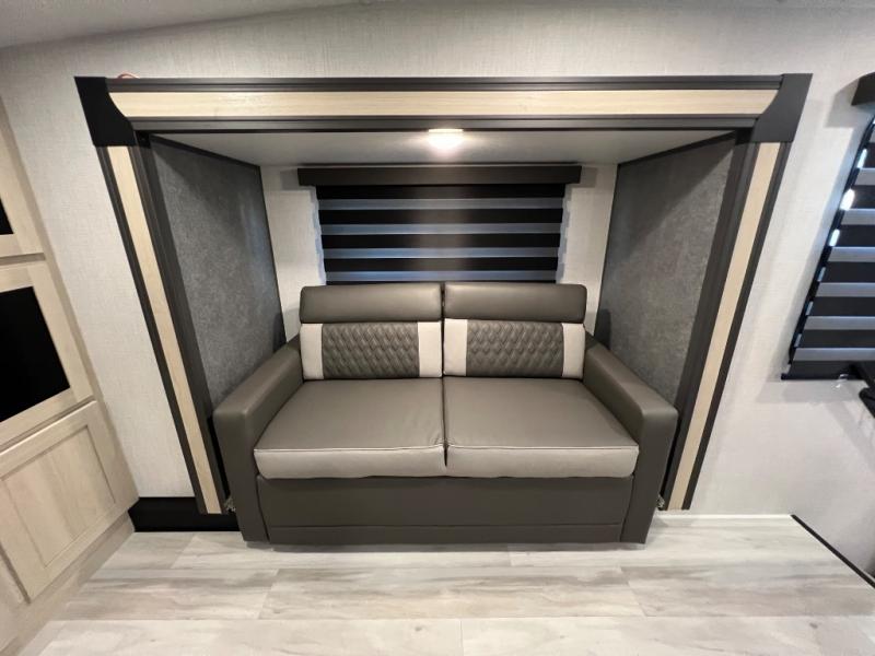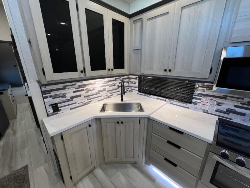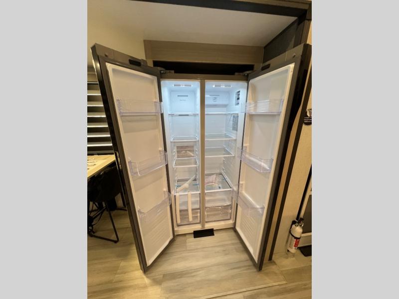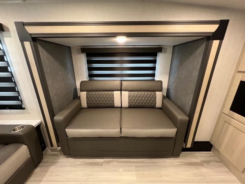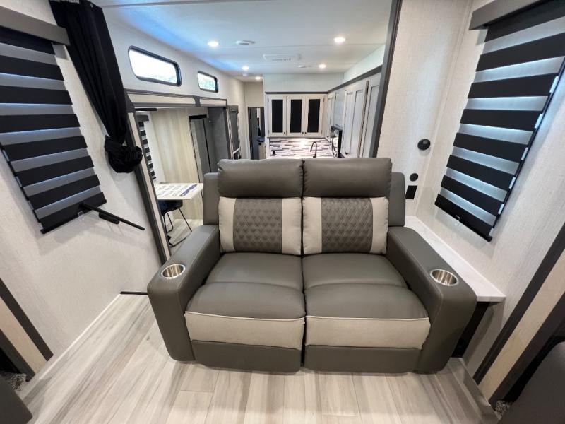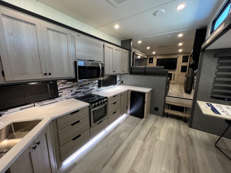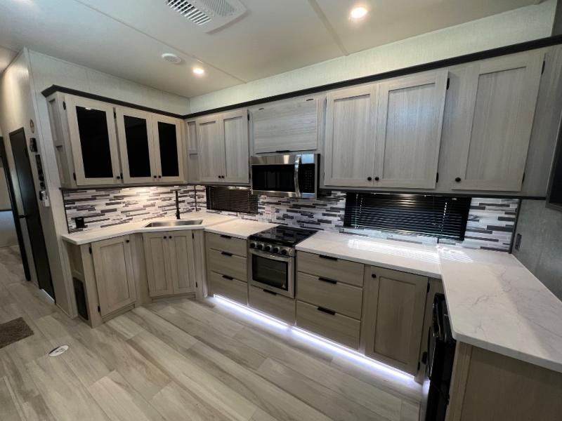 This fifth wheel is packed with features to make each trip enjoyable! The middle kitchen might be your favorite room with wrap-around counter space, a pantry, and a 16 cu. ft. 12V refrigerator for food storage. You can dine at the hi-top table and chairs here, or sit in the front living area on the dual sofas and theater seating! This area can become your guests bedroom at night since there are dual opposing slides and wardrobe storage for their things. You will also find a full-length wardrobe in the rear private bedroom, along with a king bed slide out, plus washer and dryer prep! And of course there is a full bath so everyone can stay clean each day!