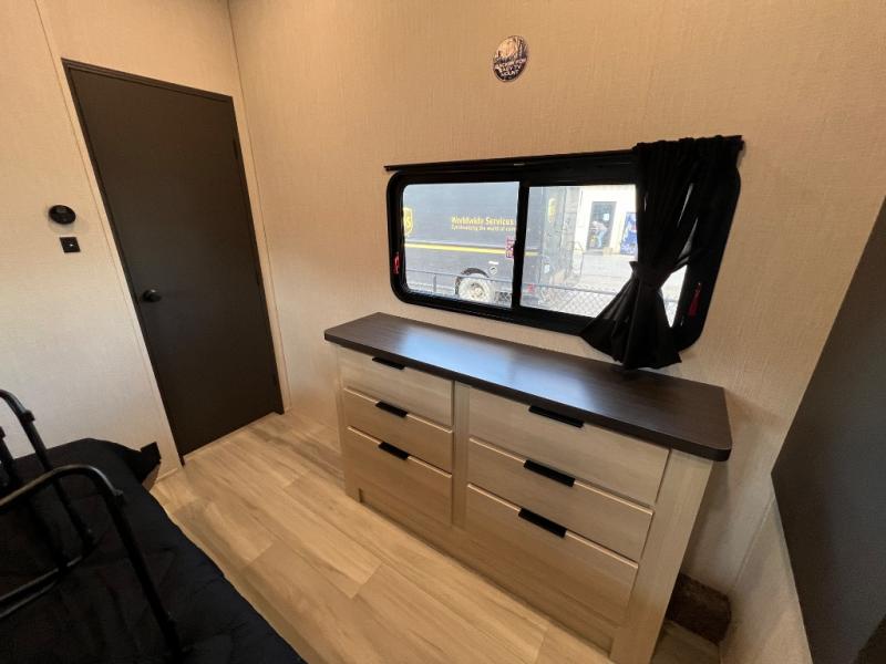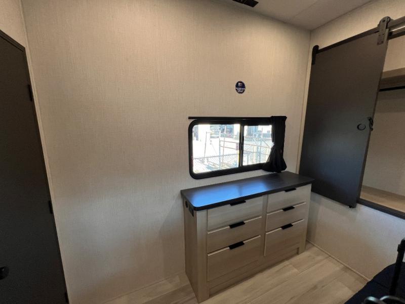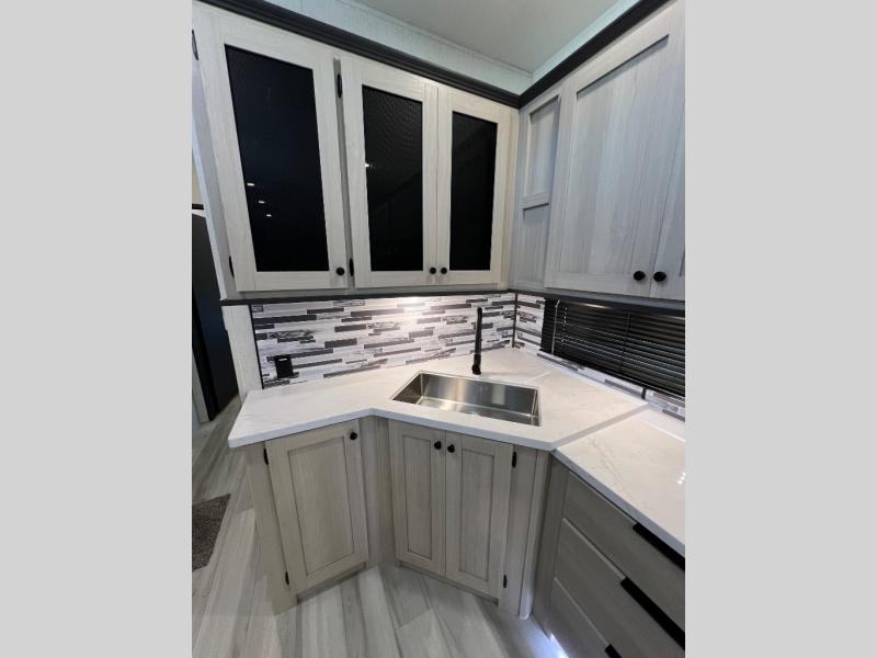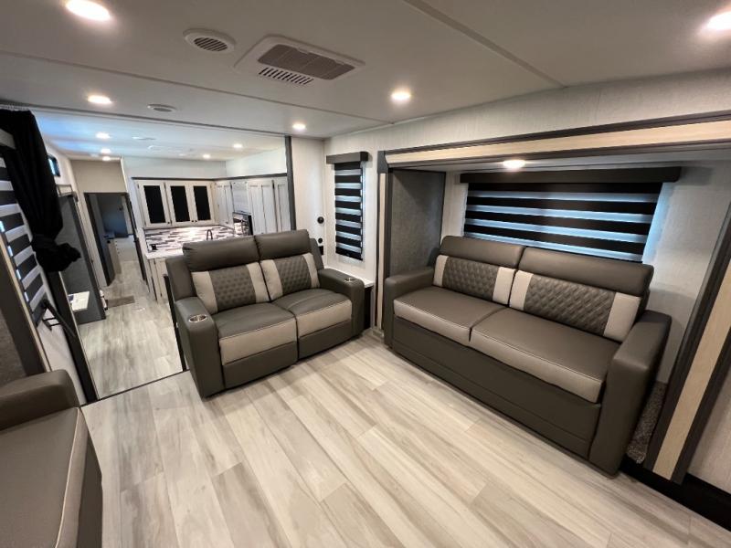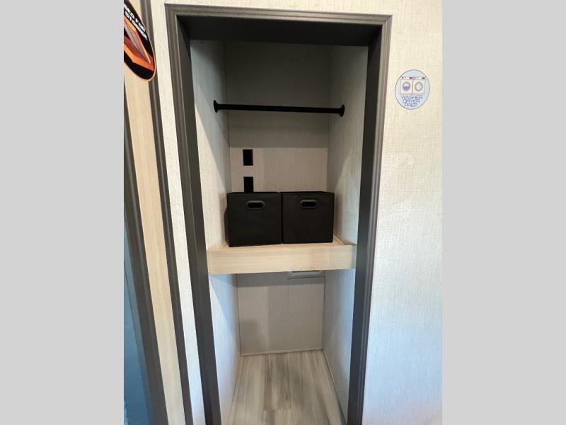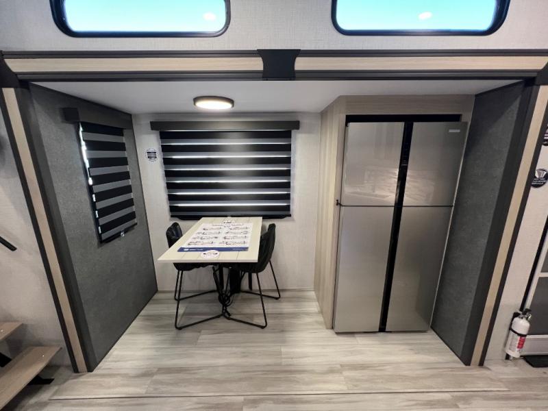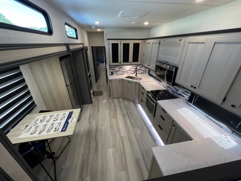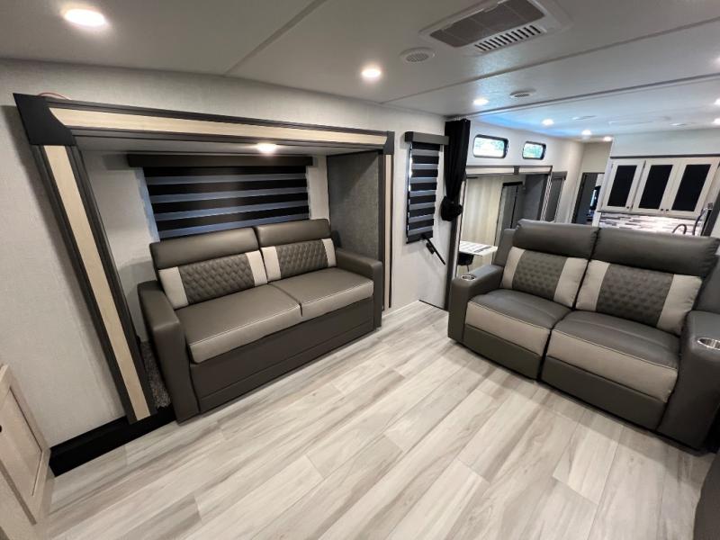 This fifth wheel is packed with features to make each trip enjoyable! The middle kitchen might be your favorite room with wrap-around counter space, a pantry, and a 16 cu. ft. 12V refrigerator for food storage. You can dine at the hi-top table and chairs here, or sit in the front living area on the dual sofas and theater seating! This area can become your guests bedroom at night since there are dual opposing slides and wardrobe storage for their things. You will also find a full-length wardrobe in the rear private bedroom, along with a king bed slide out, plus washer and dryer prep! And of course there is a full bath so everyone can stay clean each day!