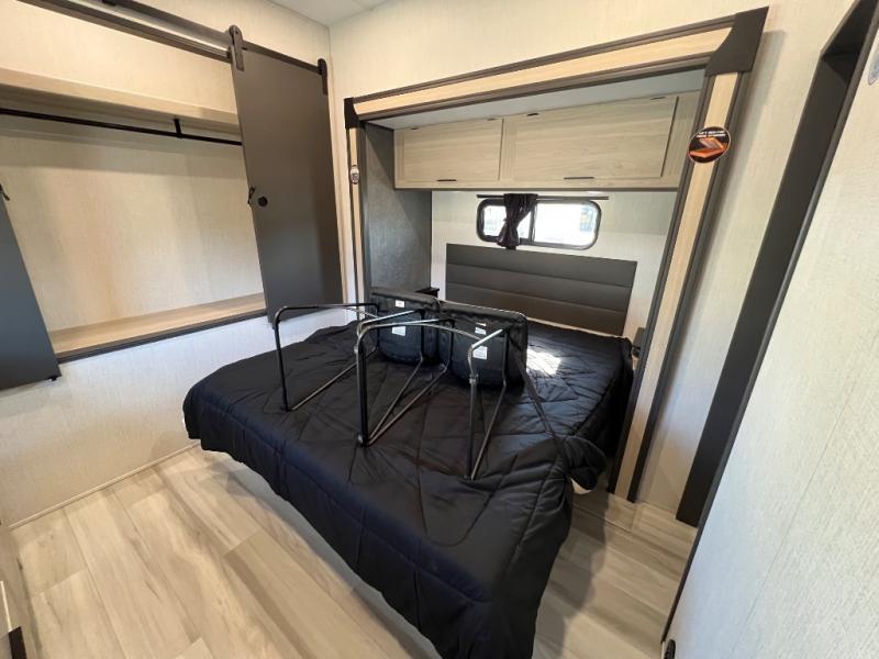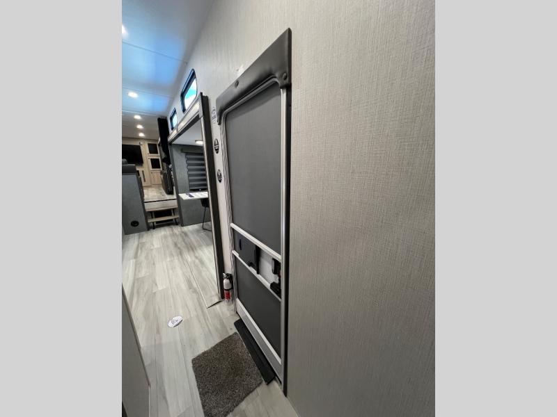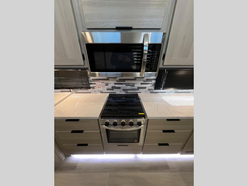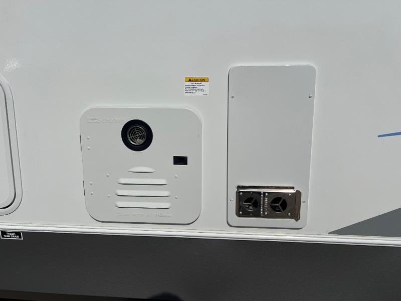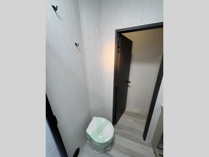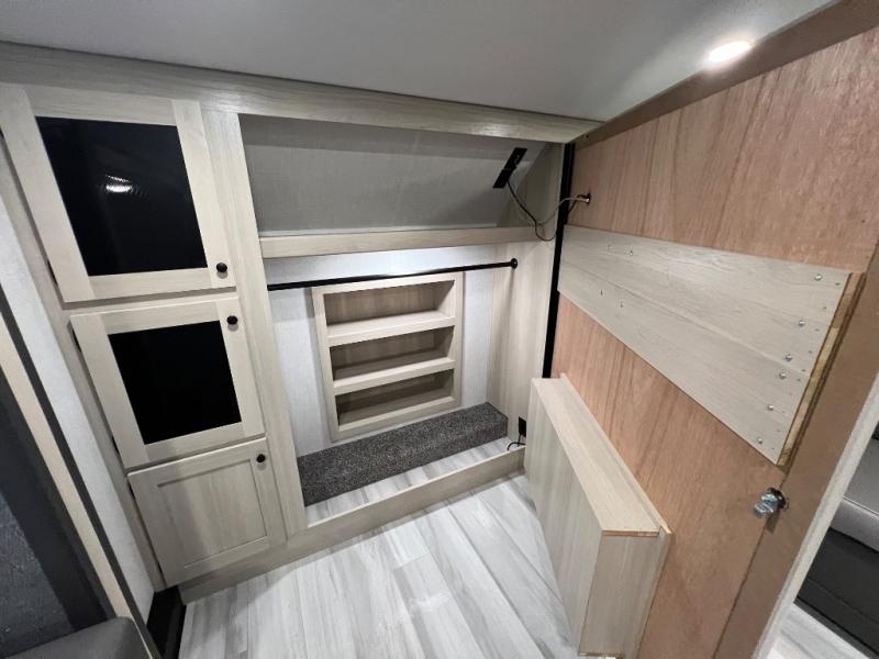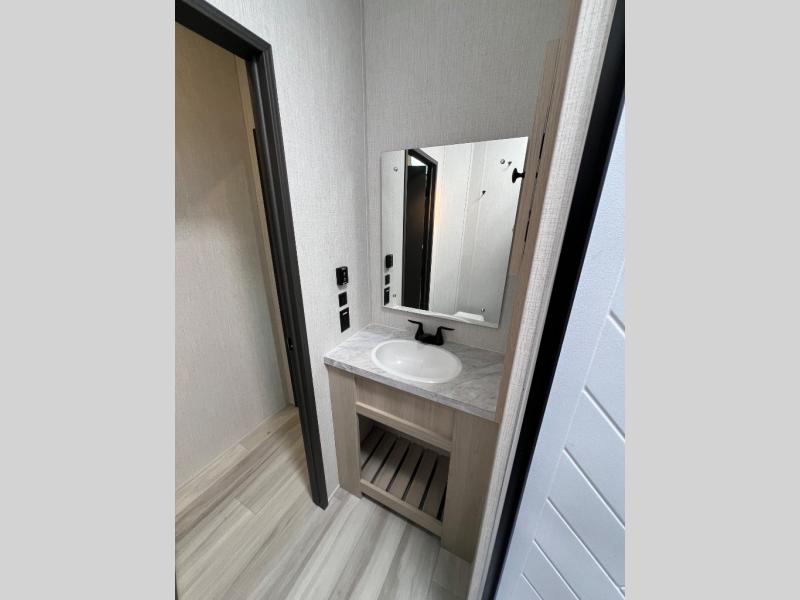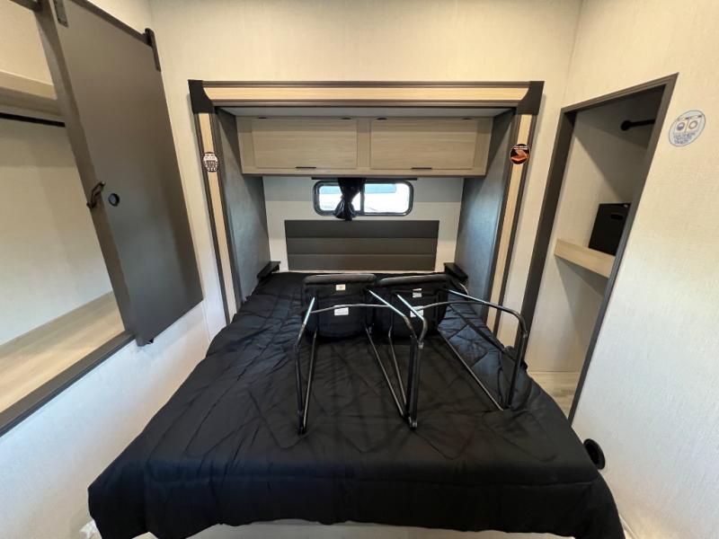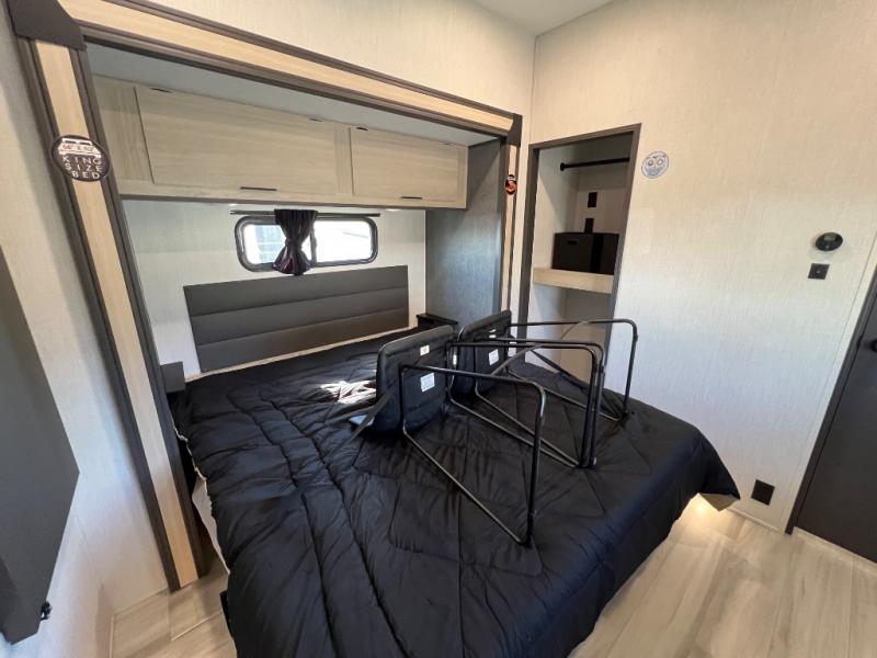 This fifth wheel is packed with features to make each trip enjoyable! The middle kitchen might be your favorite room with wrap-around counter space, a pantry, and a 16 cu. ft. 12V refrigerator for food storage. You can dine at the hi-top table and chairs here, or sit in the front living area on the dual sofas and theater seating! This area can become your guests bedroom at night since there are dual opposing slides and wardrobe storage for their things. You will also find a full-length wardrobe in the rear private bedroom, along with a king bed slide out, plus washer and dryer prep! And of course there is a full bath so everyone can stay clean each day!