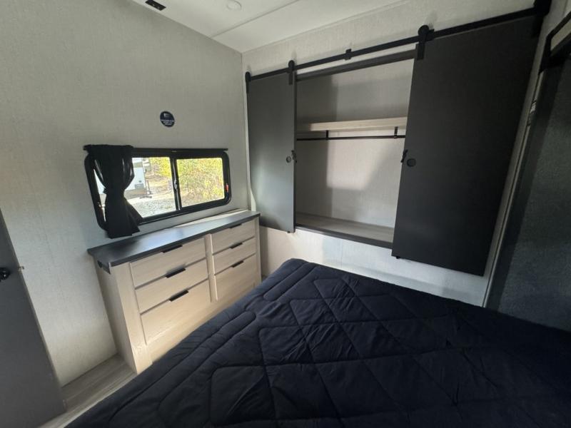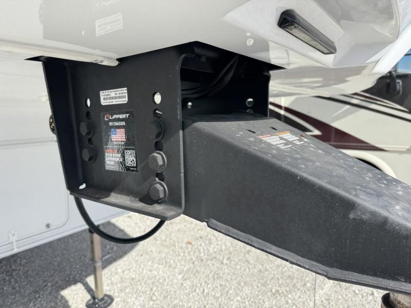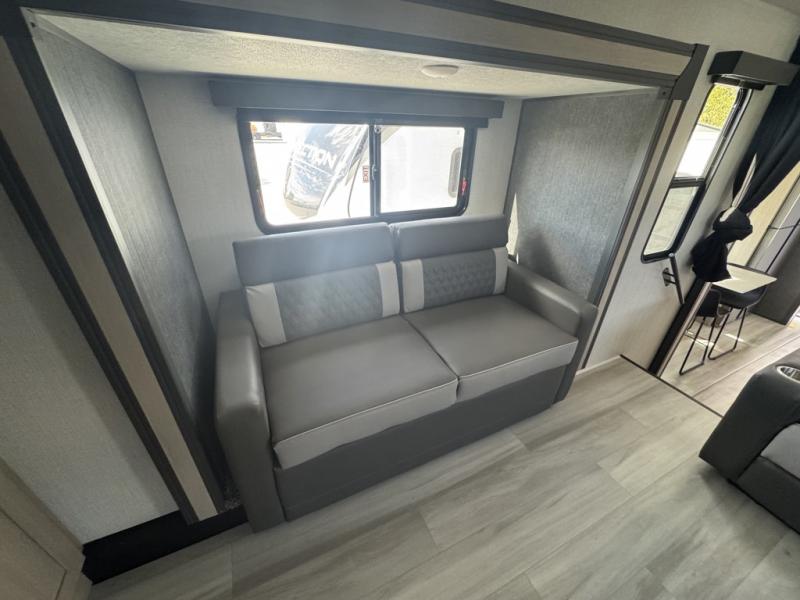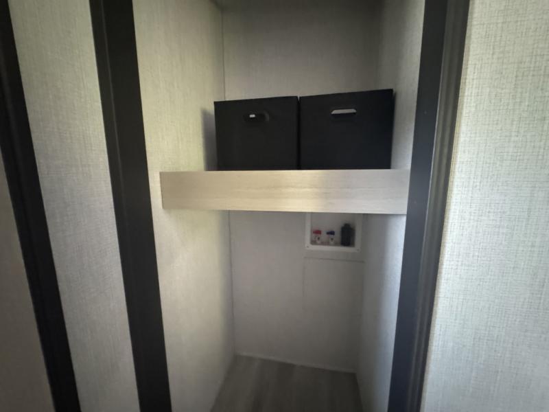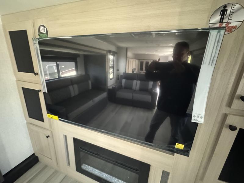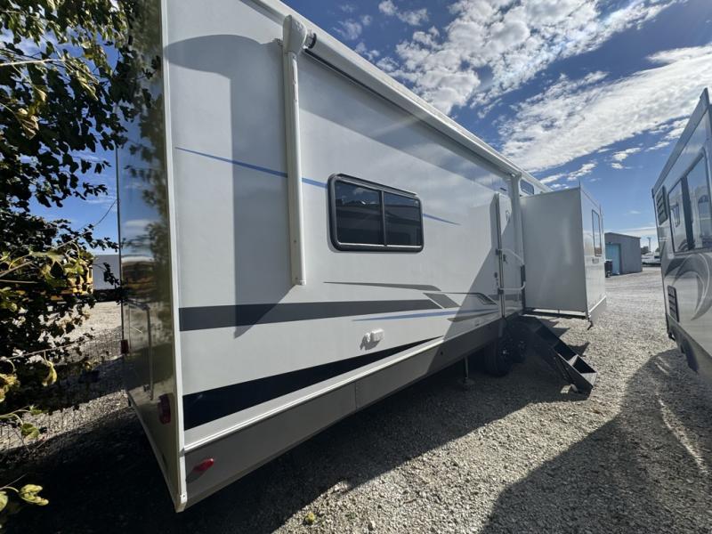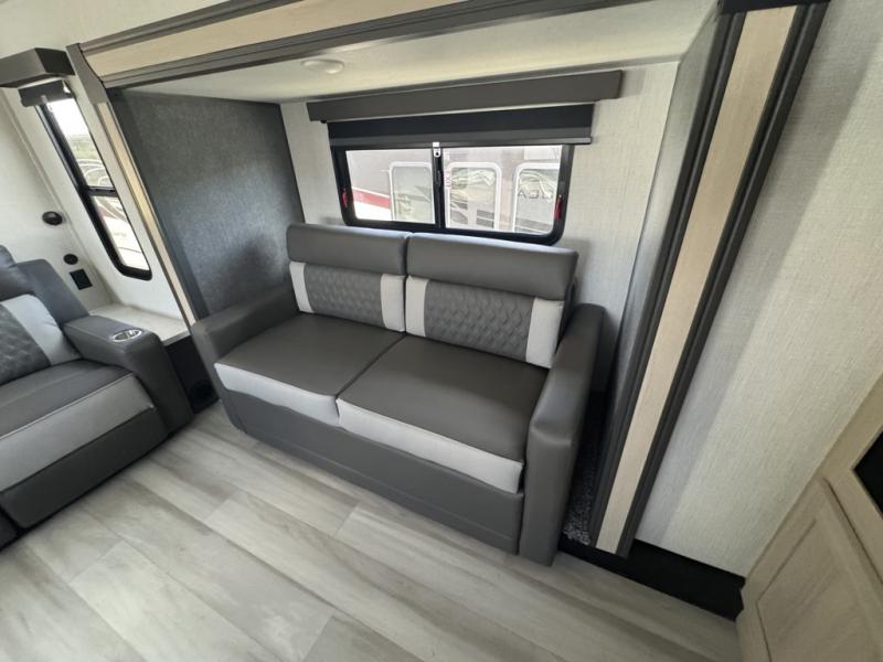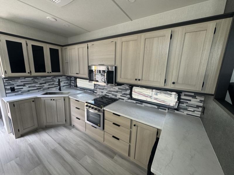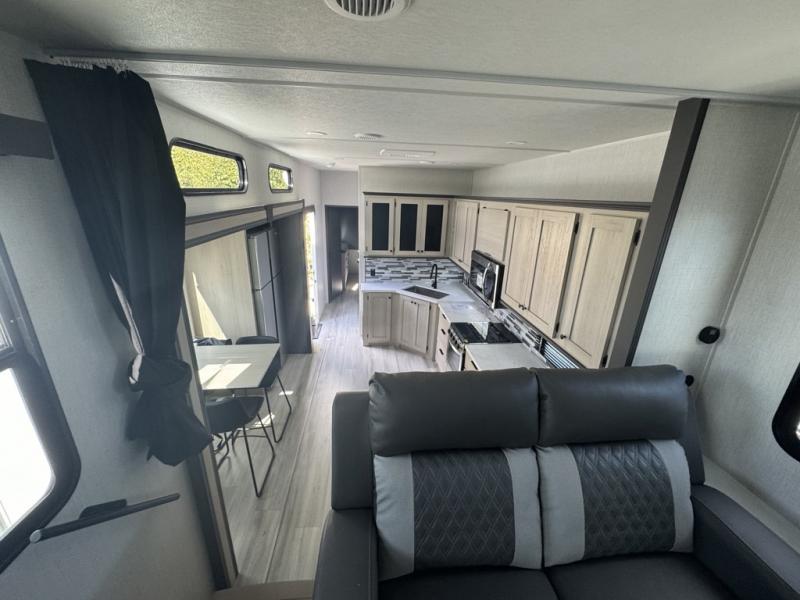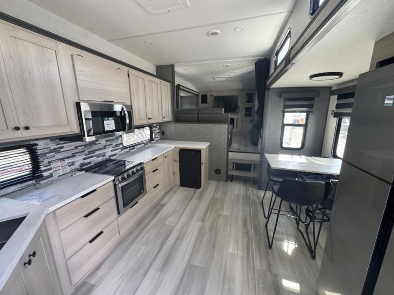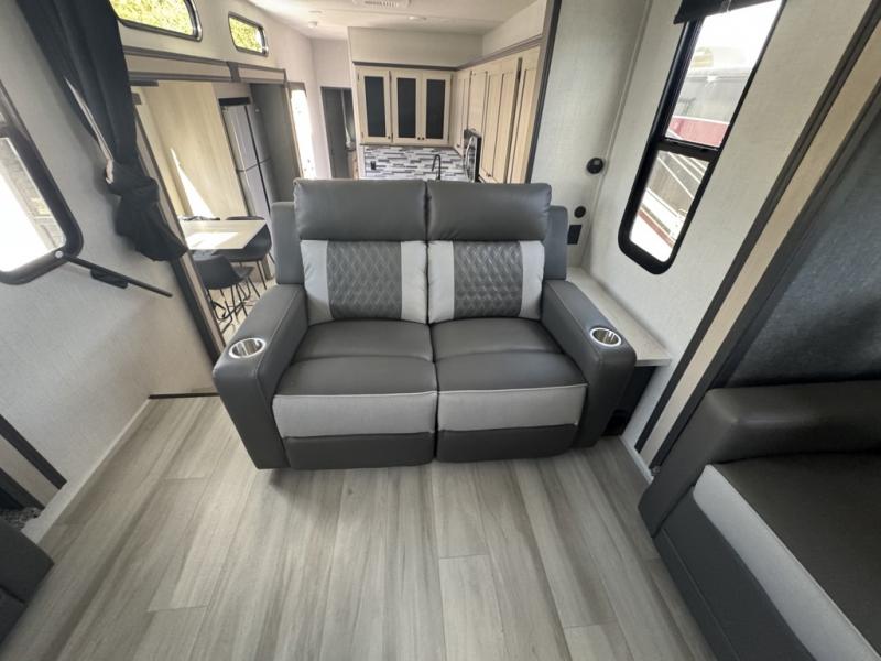 This fifth wheel is packed with features to make each trip enjoyable! The middle kitchen might be your favorite room with wrap-around counter space, a pantry, and a 16 cu. ft. 12V refrigerator for food storage. You can dine at the hi-top table and chairs here, or sit in the front living area on the dual sofas and theater seating! This area can become your guests bedroom at night since there are dual opposing slides and wardrobe storage for their things. You will also find a full-length wardrobe in the rear private bedroom, along with a king bed slide out, plus washer and dryer prep! And of course there is a full bath so everyone can stay clean each day!