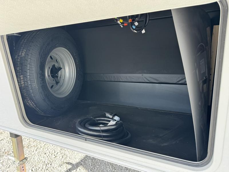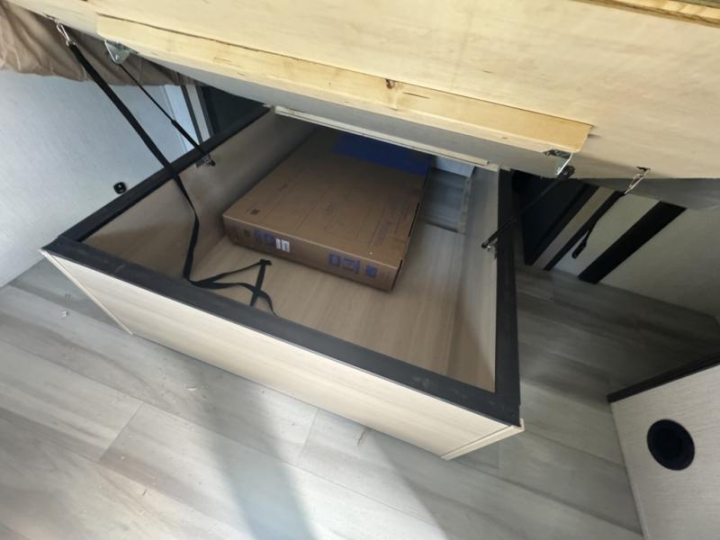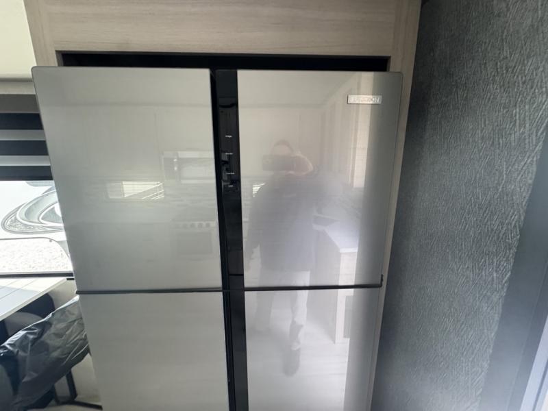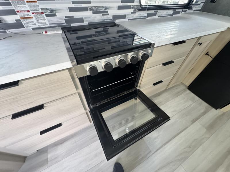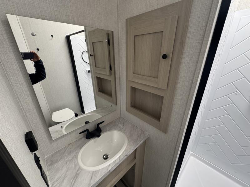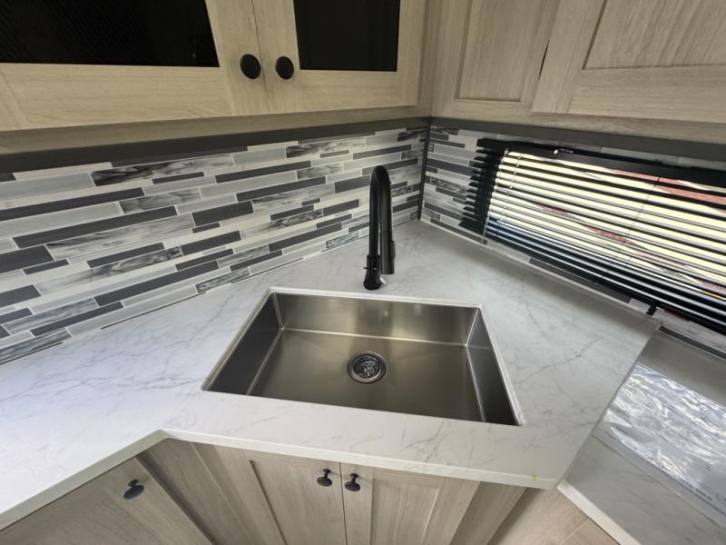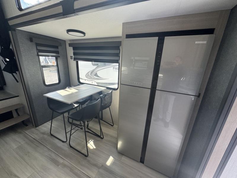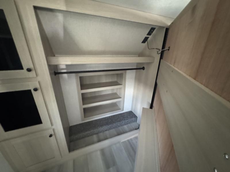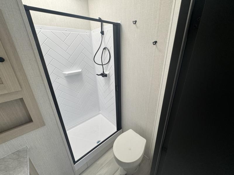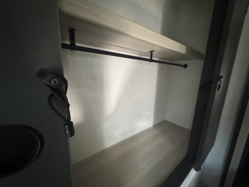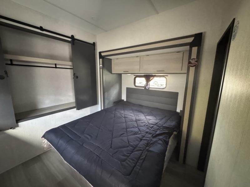 This fifth wheel is packed with features to make each trip enjoyable! The middle kitchen might be your favorite room with wrap-around counter space, a pantry, and a 16 cu. ft. 12V refrigerator for food storage. You can dine at the hi-top table and chairs here, or sit in the front living area on the dual sofas and theater seating! This area can become your guests bedroom at night since there are dual opposing slides and wardrobe storage for their things. You will also find a full-length wardrobe in the rear private bedroom, along with a king bed slide out, plus washer and dryer prep! And of course there is a full bath so everyone can stay clean each day!