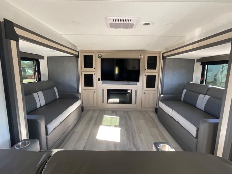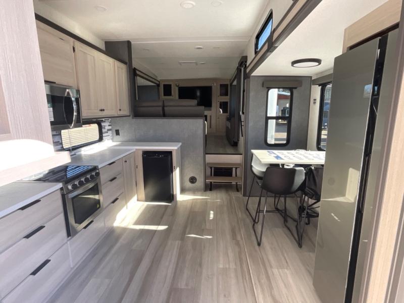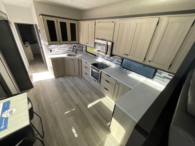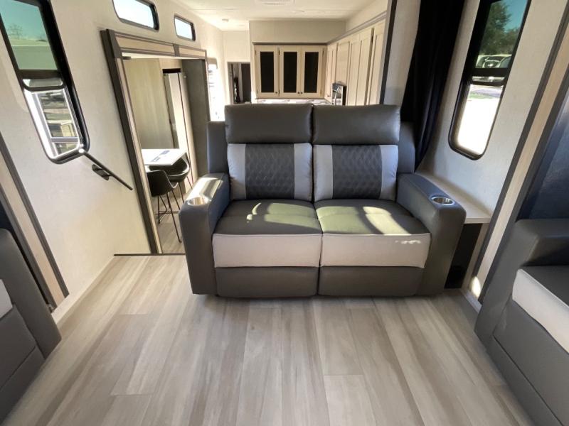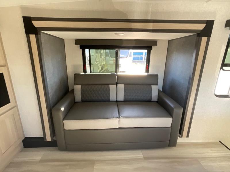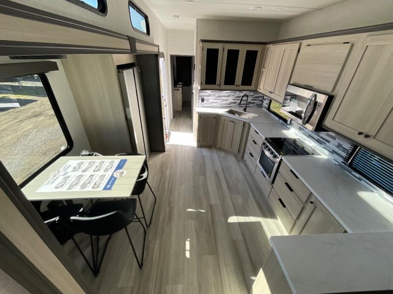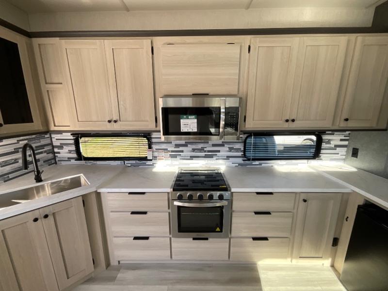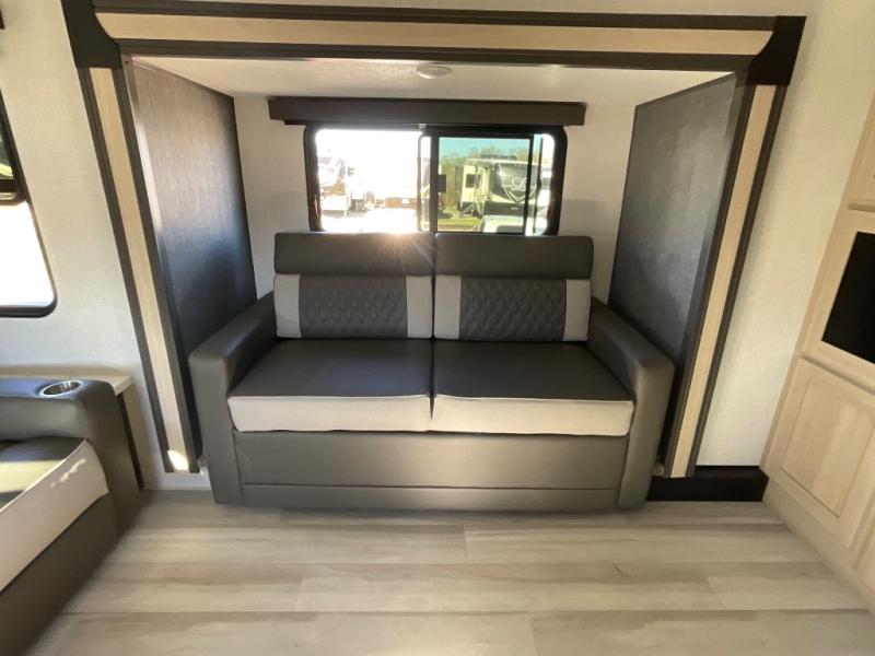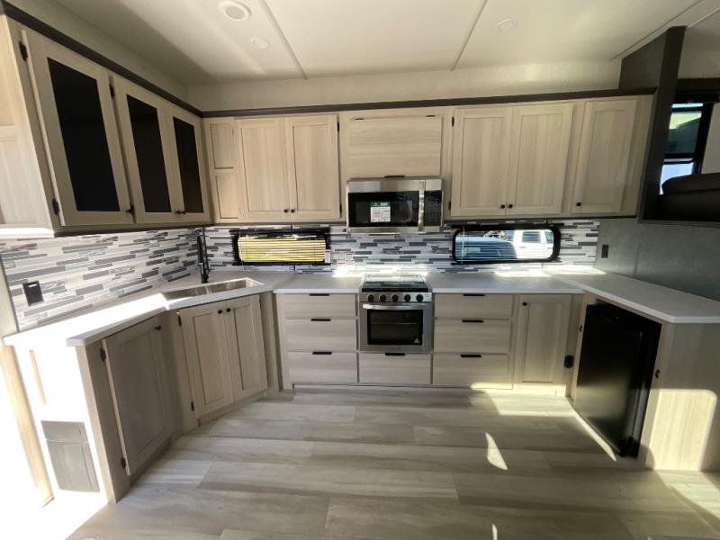 This fifth wheel is packed with features to make each trip enjoyable! The middle kitchen might be your favorite room with wrap-around counter space, a pantry, and a 16 cu. ft. 12V refrigerator for food storage. You can dine at the hi-top table and chairs here, or sit in the front living area on the dual sofas and theater seating! This area can become your guests bedroom at night since there are dual opposing slides and wardrobe storage for their things. You will also find a full-length wardrobe in the rear private bedroom, along with a king bed slide out, plus washer and dryer prep! And of course there is a full bath so everyone can stay clean each day!
