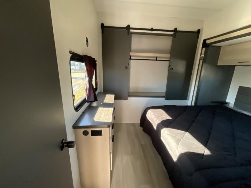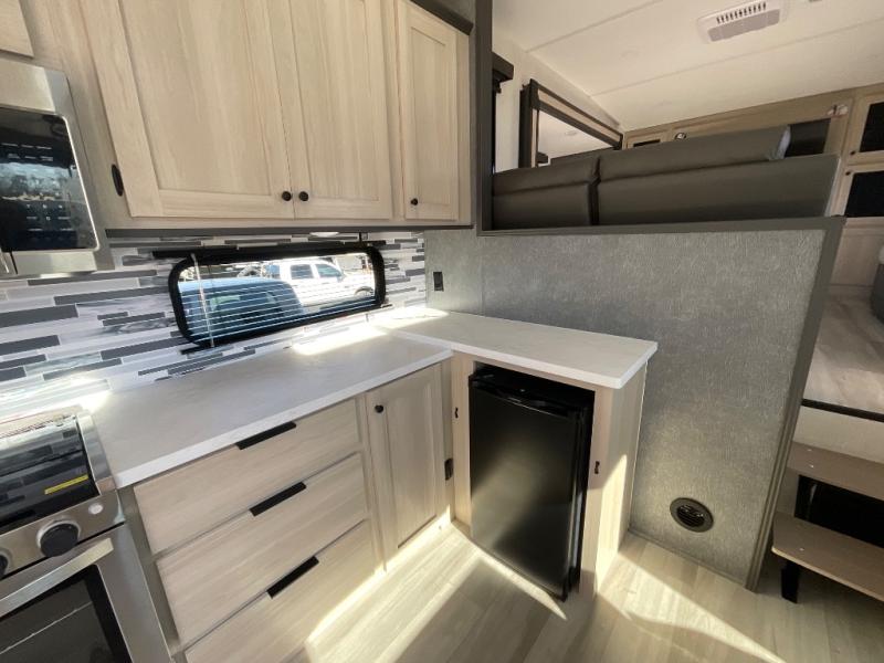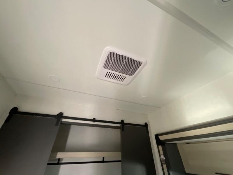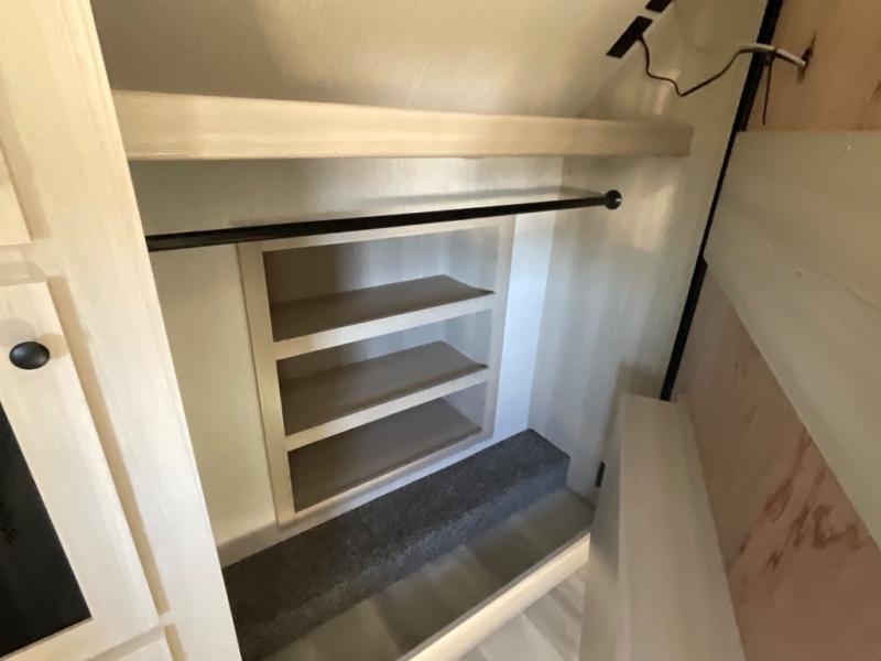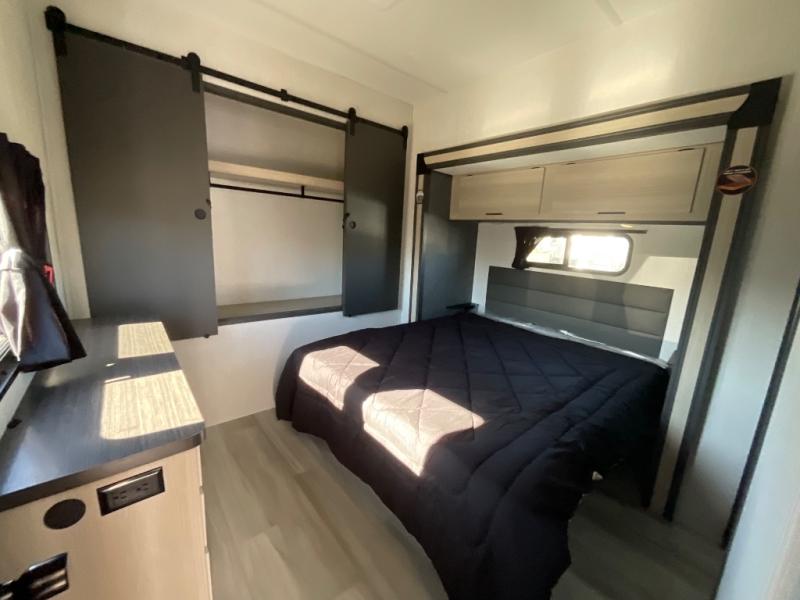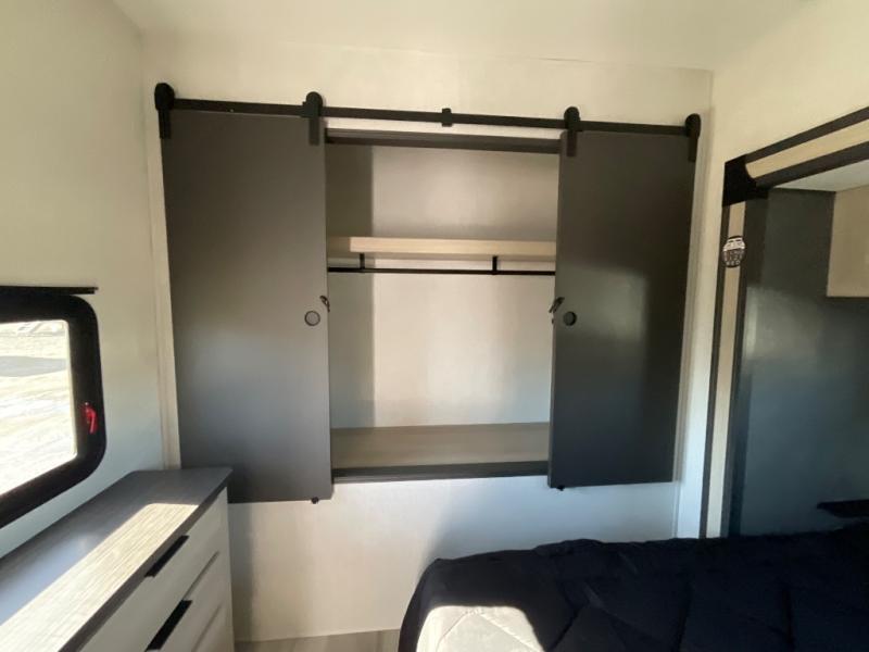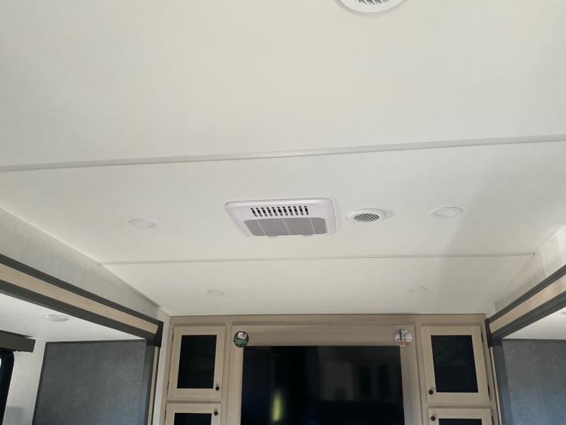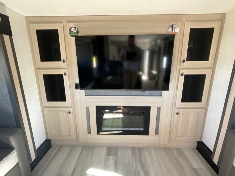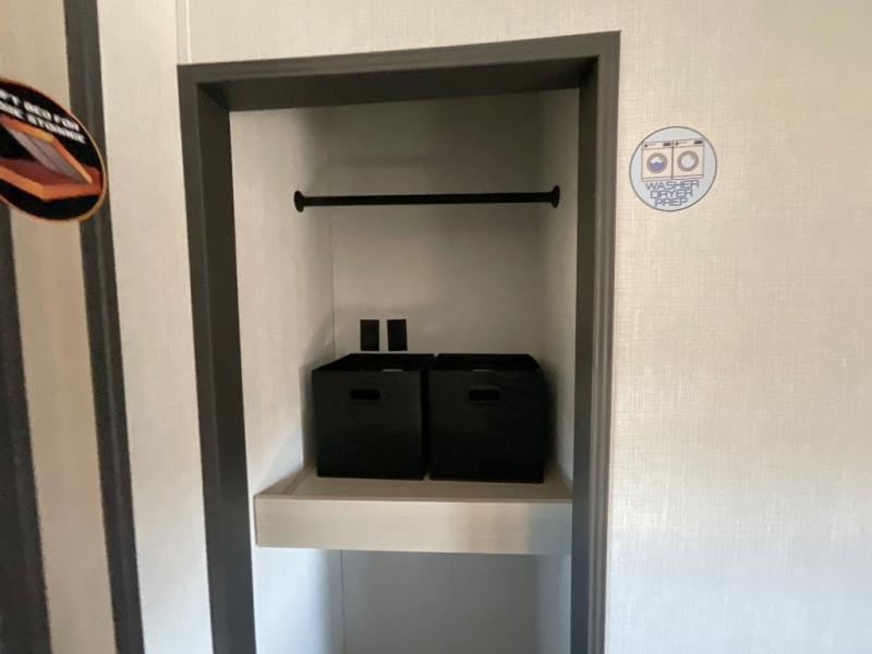This fifth wheel is packed with features to make each trip enjoyable! The middle kitchen might be your favorite room with wrap-around counter space, a pantry, and a 16 cu. ft. 12V refrigerator for food storage. You can dine at the hi-top table and chairs here, or sit in the front living area on the dual sofas and theater seating! This area can become your guests bedroom at night since there are dual opposing slides and wardrobe storage for their things. You will also find a full-length wardrobe in the rear private bedroom, along with a king bed slide out, plus washer and dryer prep! And of course there is a full bath so everyone can stay clean each day!