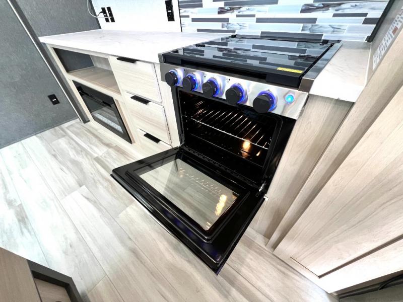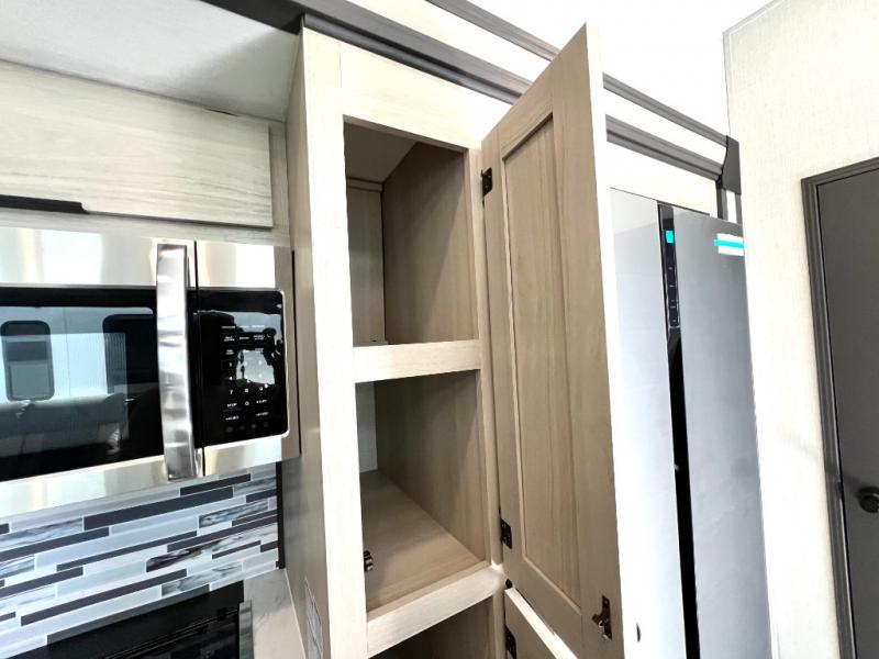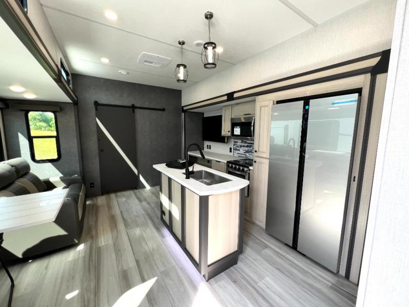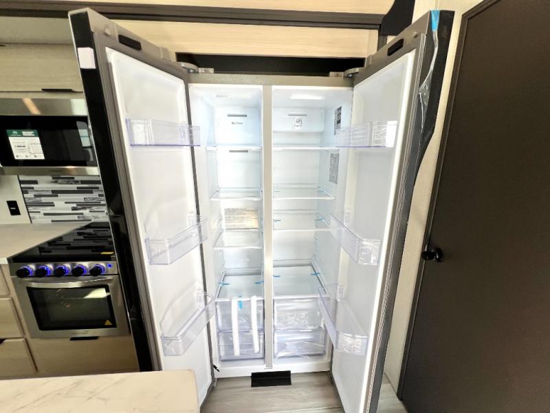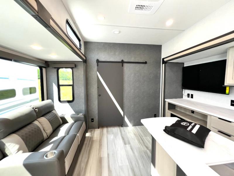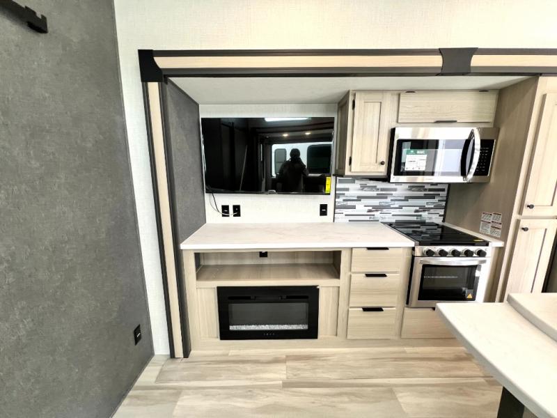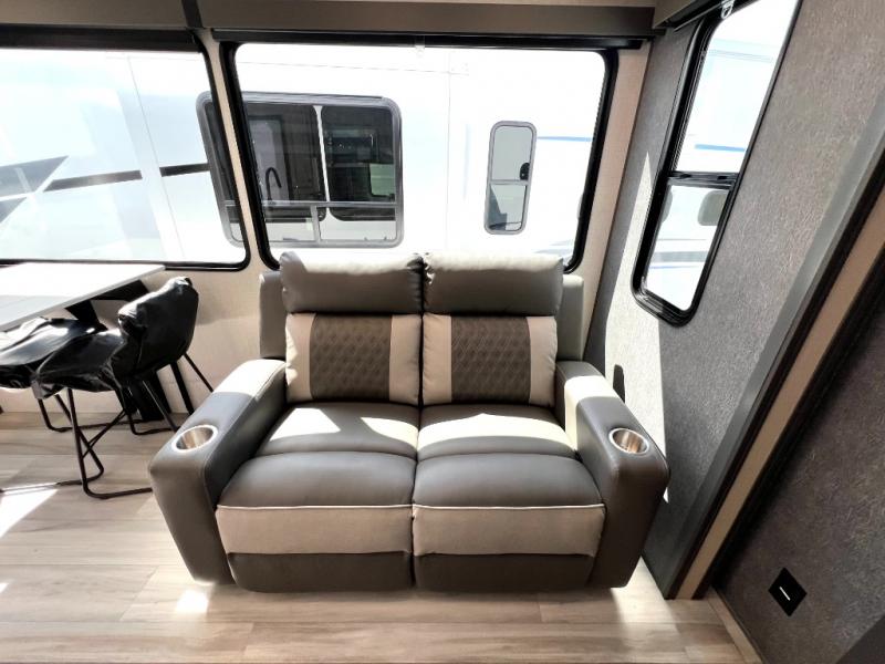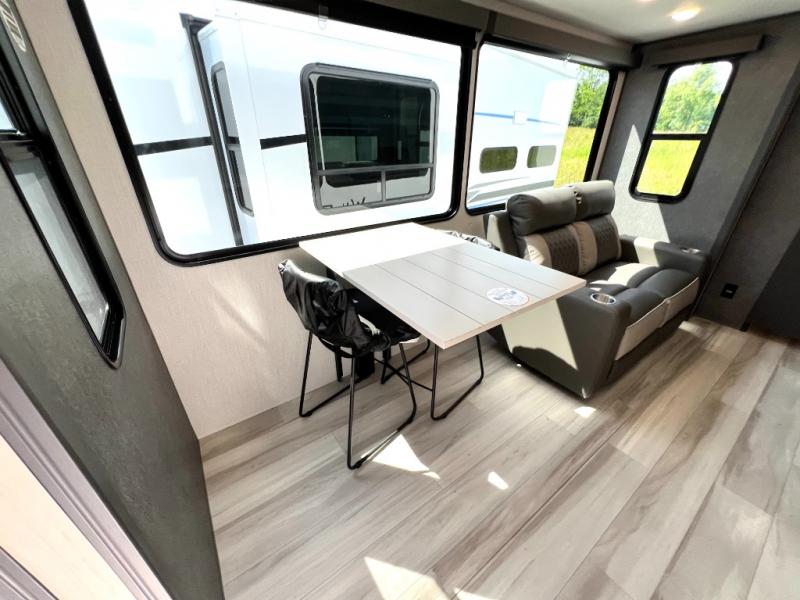 If you're ready for fun, look for further than this dual entry fifth wheel! It will be so easy to travel with friends and family since there is a master bedroom with a king bed and a full rear bath, plus a front bunkhouse suite with bunk beds, a queen bed, and a second full bath! The chef of your crew can whip up breakfast in the morning on the 21" 2-in-1 oven range or in the over-the-range microwave. There is also a 16 cu. ft. 12V refrigerator and walk-in pantry for food storage! The theater seating and table with chairs sit across from the entertainment center and fireplace for easy viewing in the evening, or you may just find yourselves outdoors visiting with campground neighbors!