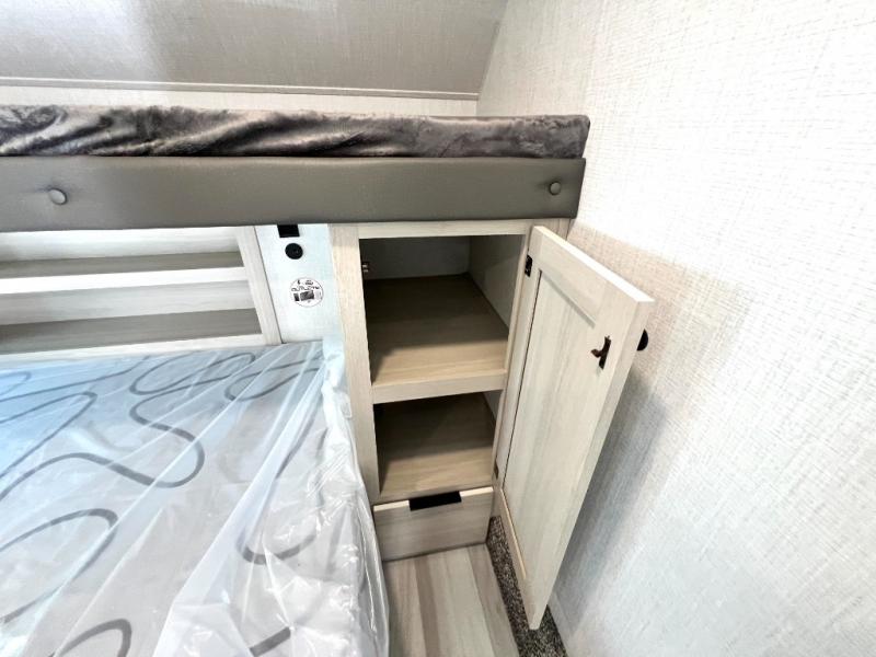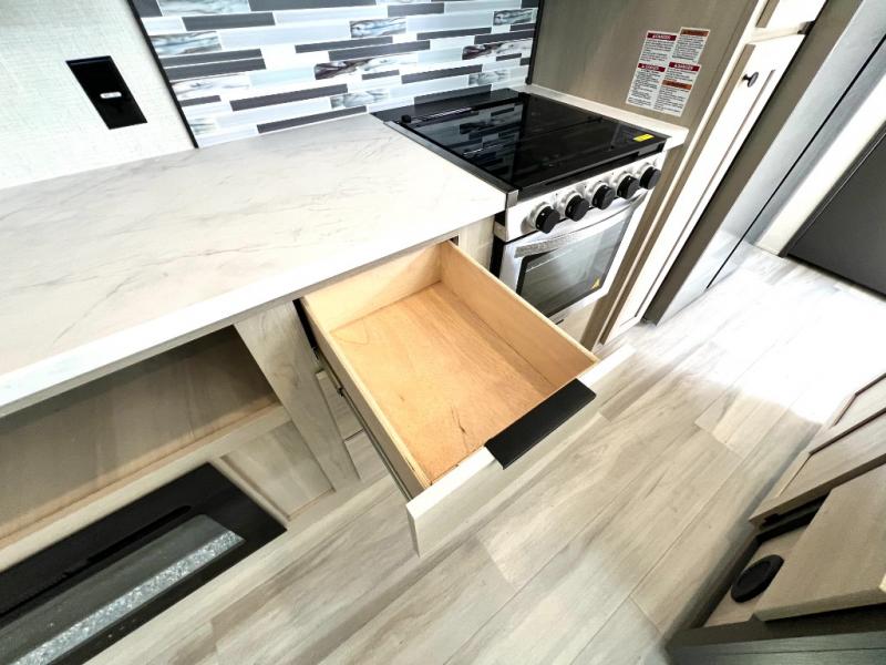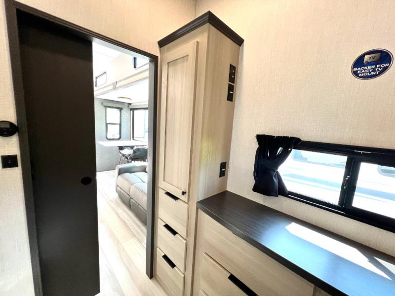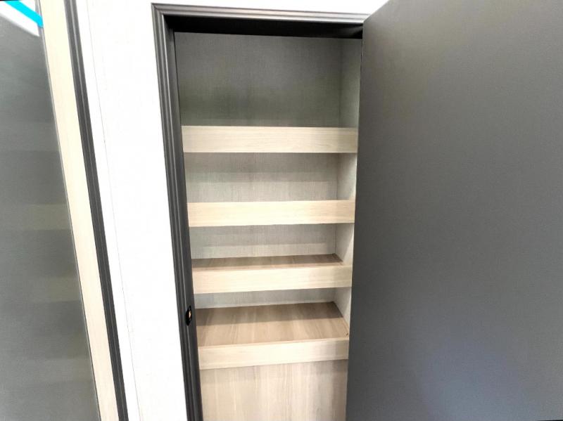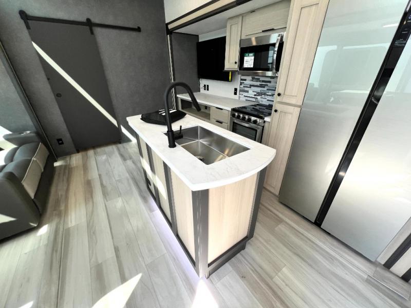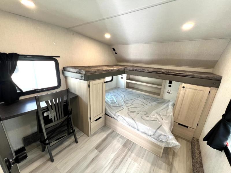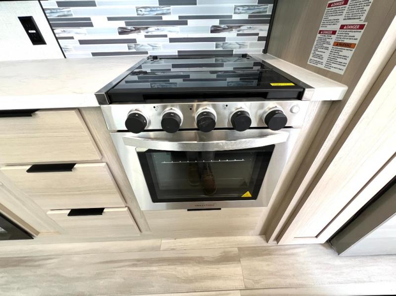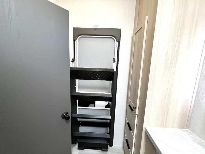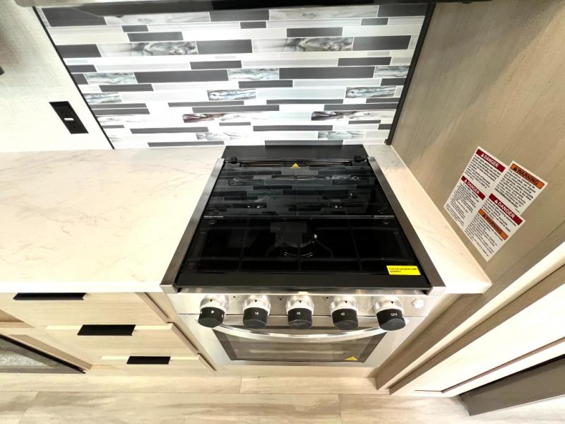 If you're ready for fun, look for further than this dual entry fifth wheel! It will be so easy to travel with friends and family since there is a master bedroom with a king bed and a full rear bath, plus a front bunkhouse suite with bunk beds, a queen bed, and a second full bath! The chef of your crew can whip up breakfast in the morning on the 21" 2-in-1 oven range or in the over-the-range microwave. There is also a 16 cu. ft. 12V refrigerator and walk-in pantry for food storage! The theater seating and table with chairs sit across from the entertainment center and fireplace for easy viewing in the evening, or you may just find yourselves outdoors visiting with campground neighbors!