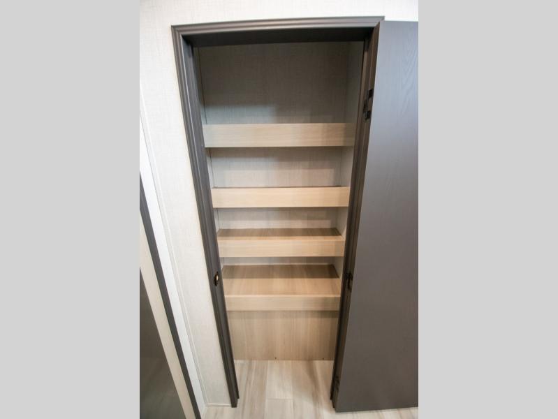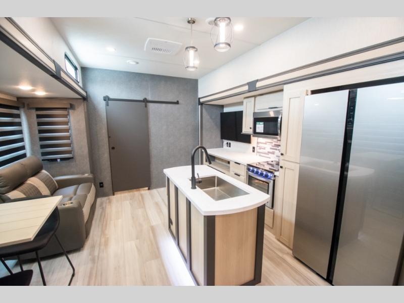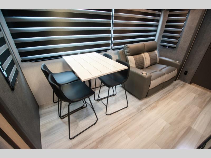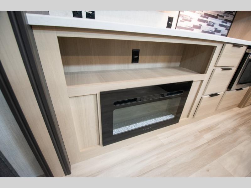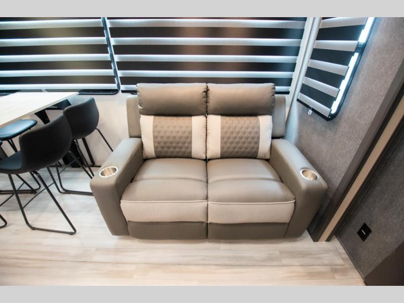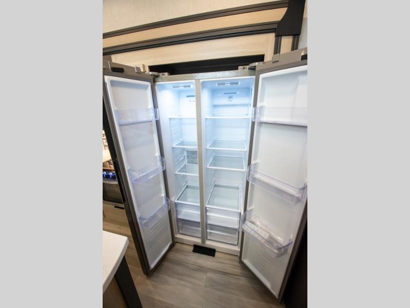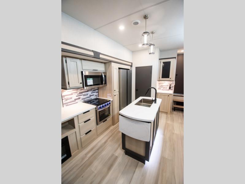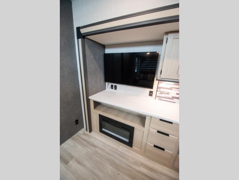 If you're ready for fun, look for further than this dual entry fifth wheel! It will be so easy to travel with friends and family since there is a master bedroom with a king bed and a full rear bath, plus a front bunkhouse suite with bunk beds, a queen bed, and a second full bath! The chef of your crew can whip up breakfast in the morning on the 21" 2-in-1 oven range or in the over-the-range microwave. There is also a 16 cu. ft. 12V refrigerator and walk-in pantry for food storage! The theater seating and table with chairs sit across from the entertainment center and fireplace for easy viewing in the evening, or you may just find yourselves outdoors visiting with campground neighbors!