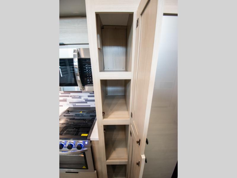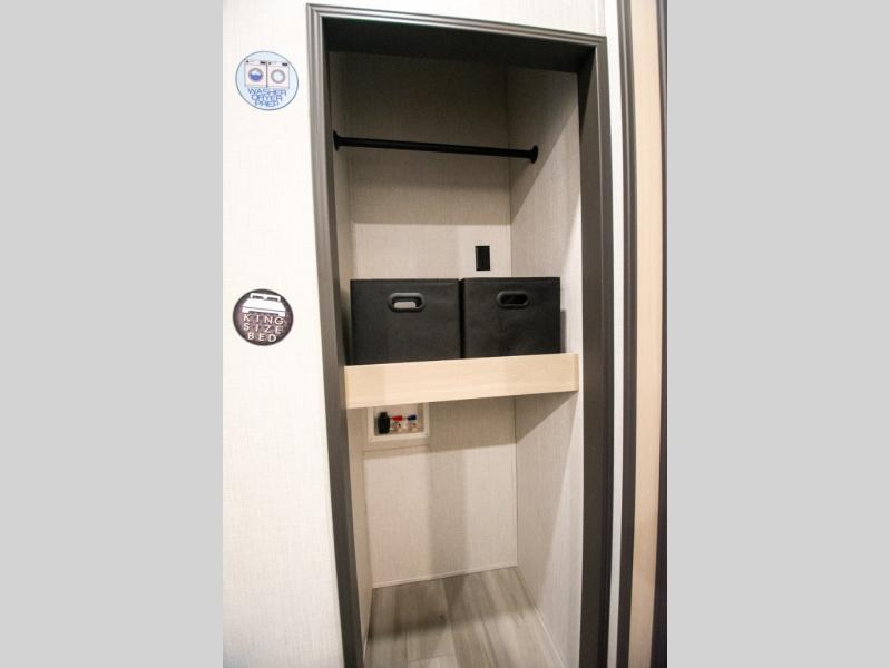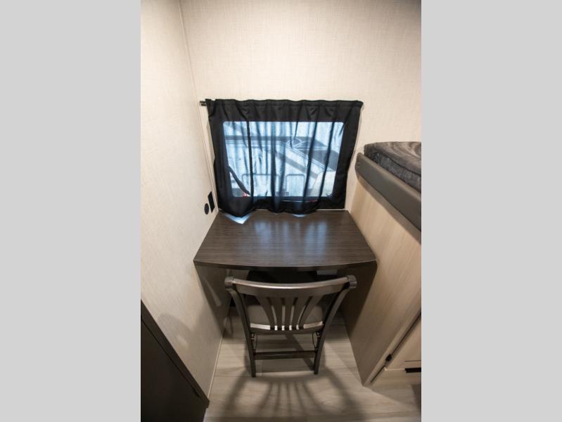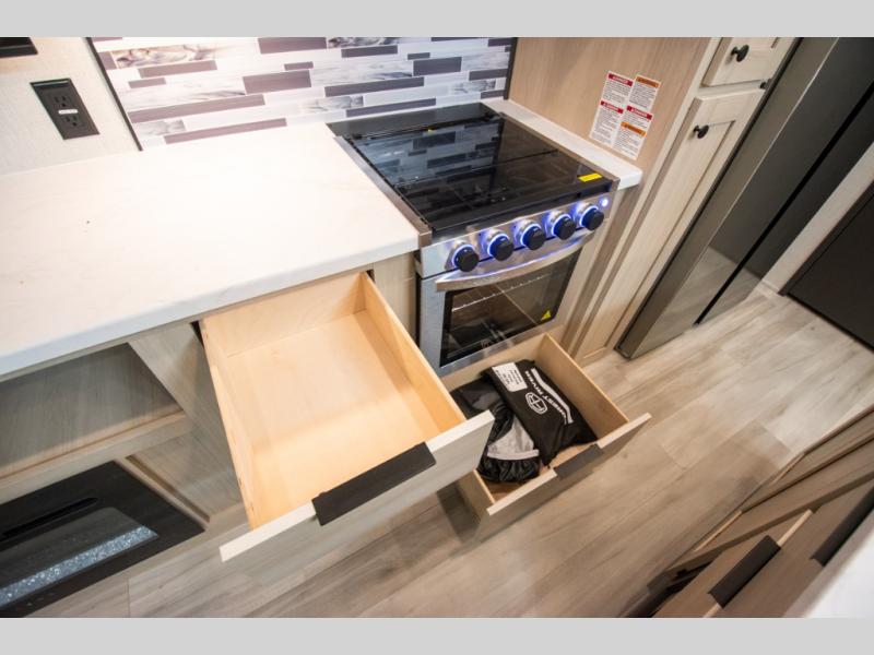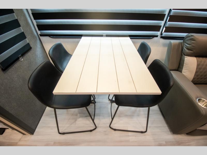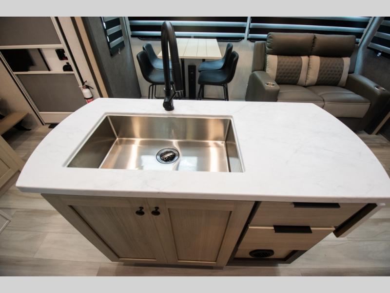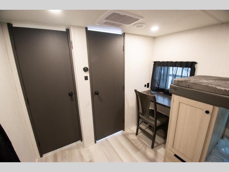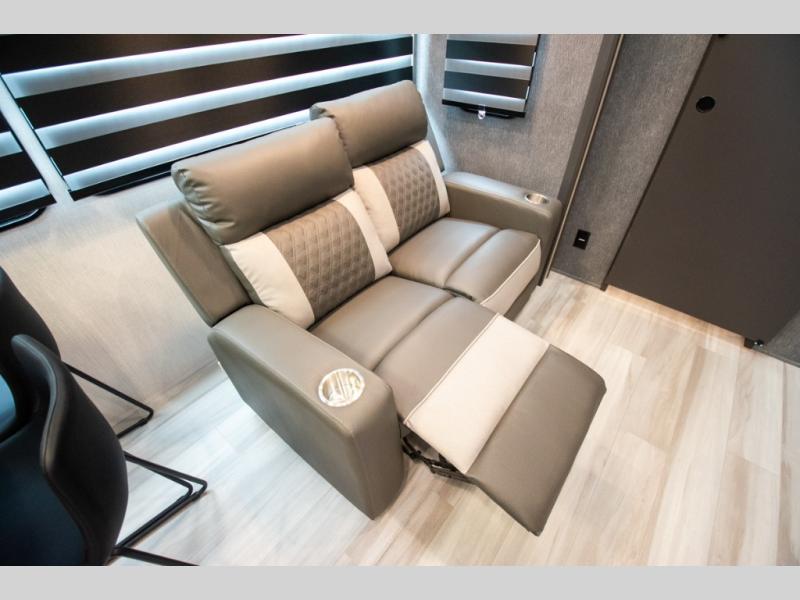 If you're ready for fun, look for further than this dual entry fifth wheel! It will be so easy to travel with friends and family since there is a master bedroom with a king bed and a full rear bath, plus a front bunkhouse suite with bunk beds, a queen bed, and a second full bath! The chef of your crew can whip up breakfast in the morning on the 21" 2-in-1 oven range or in the over-the-range microwave. There is also a 16 cu. ft. 12V refrigerator and walk-in pantry for food storage! The theater seating and table with chairs sit across from the entertainment center and fireplace for easy viewing in the evening, or you may just find yourselves outdoors visiting with campground neighbors!