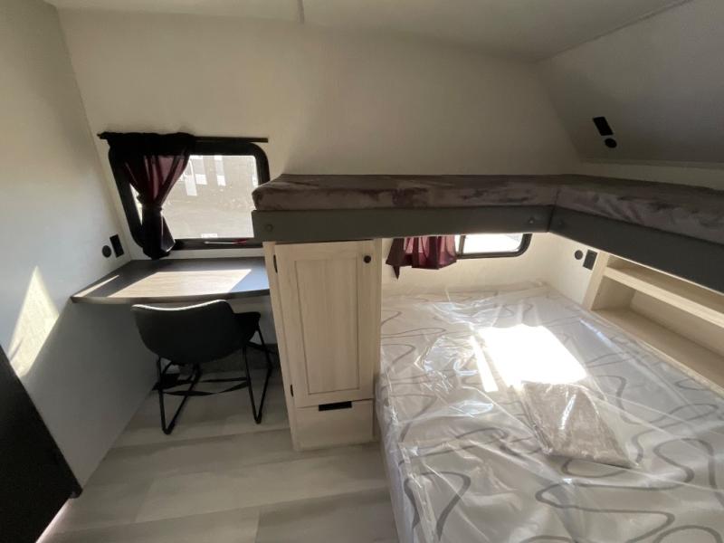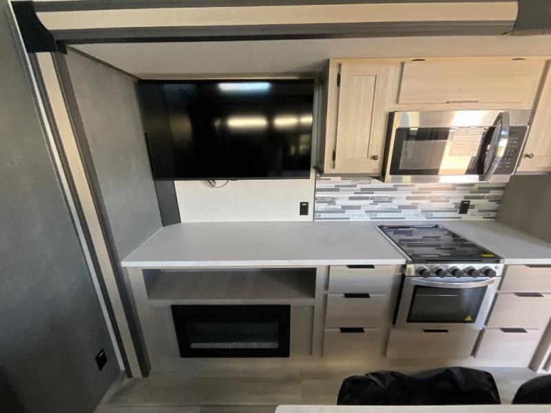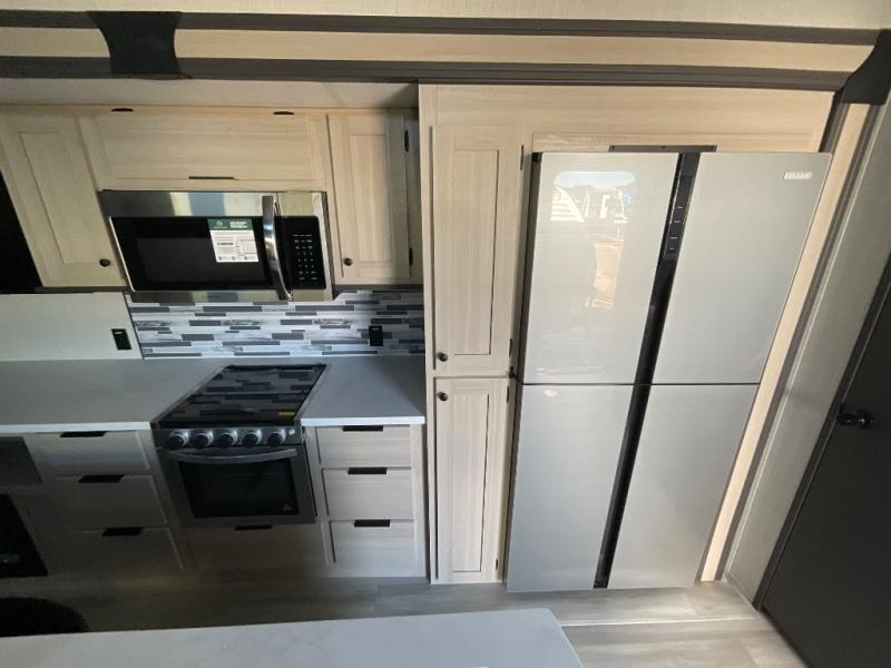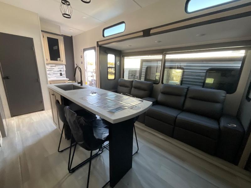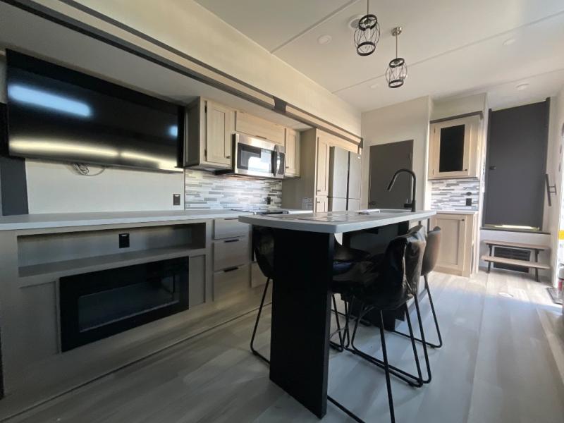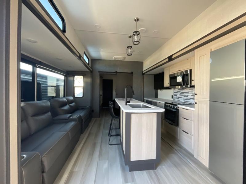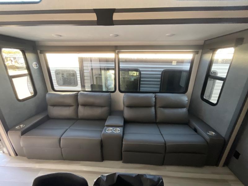 If you're ready for fun, look for further than this dual entry fifth wheel! It will be so easy to travel with friends and family since there is a master bedroom with a king bed and a full rear bath, plus a front bunkhouse suite with bunk beds, a queen bed, and a second full bath! The chef of your crew can whip up breakfast in the morning on the 21" 2-in-1 oven range or in the over-the-range microwave. There is also a 16 cu. ft. 12V refrigerator and walk-in pantry for food storage! The theater seating and table with chairs sit across from the entertainment center and fireplace for easy viewing in the evening, or you may just find yourselves outdoors visiting with campground neighbors!