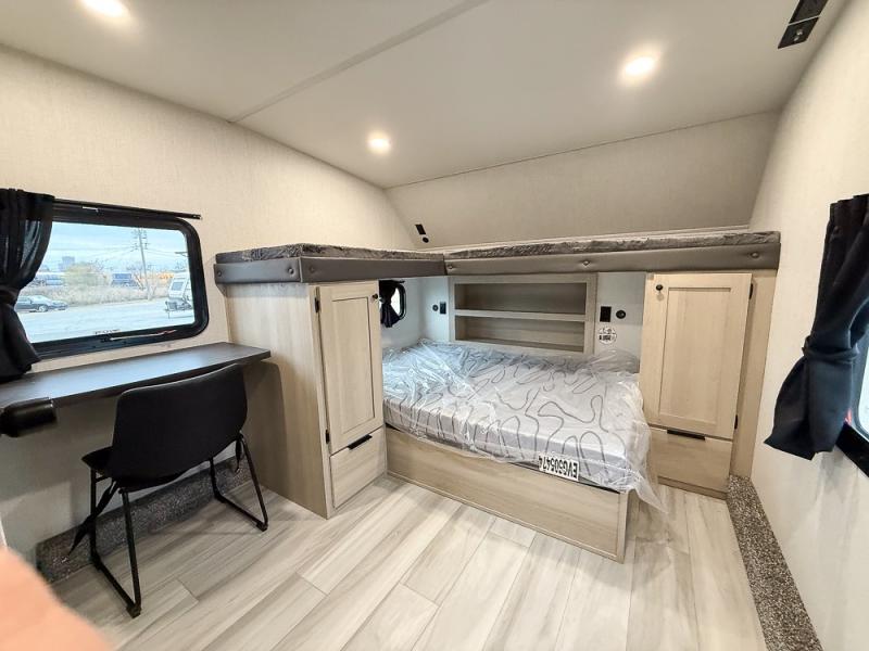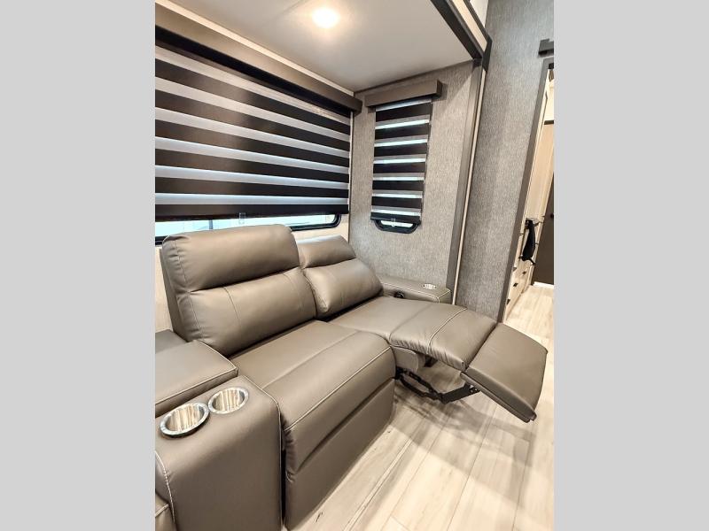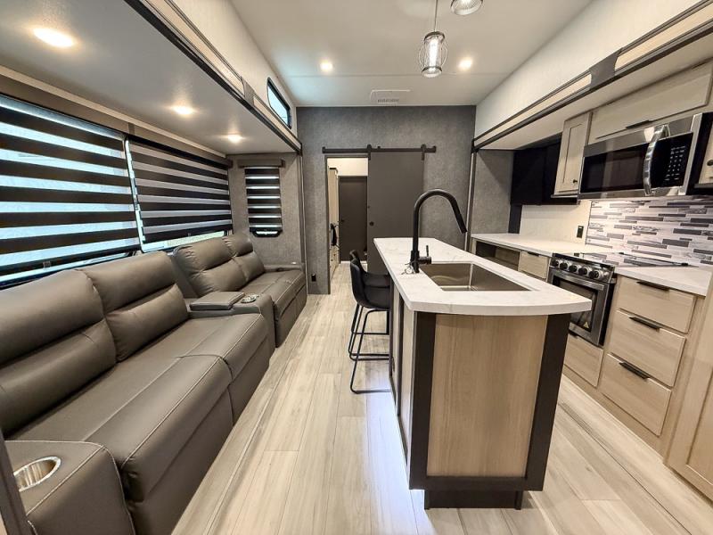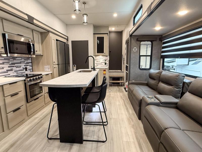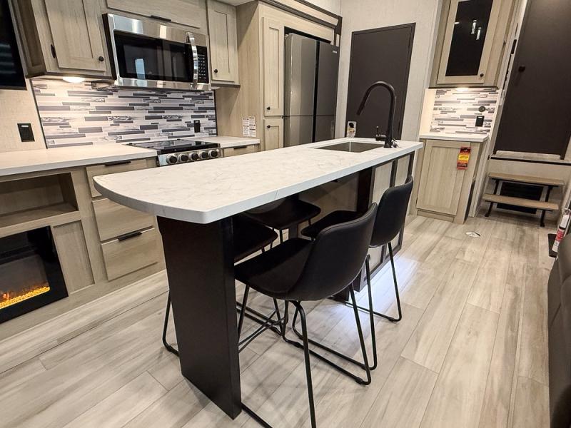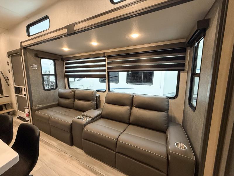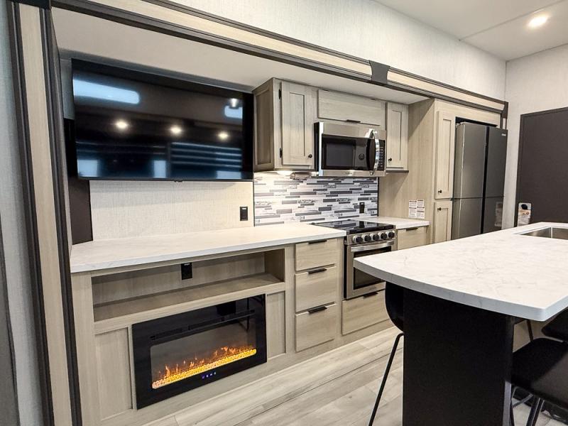 If you're ready for fun, look for further than this dual entry fifth wheel! It will be so easy to travel with friends and family since there is a master bedroom with a king bed and a full rear bath, plus a front bunkhouse suite with bunk beds, a queen bed, and a second full bath! The chef of your crew can whip up breakfast in the morning on the 21" 2-in-1 oven range or in the over-the-range microwave. There is also a 16 cu. ft. 12V refrigerator and walk-in pantry for food storage! The super sofa and table with chairs sit across from the entertainment center and fireplace for easy viewing in the evening, or you may just find yourselves outdoors visiting with campground neighbors!