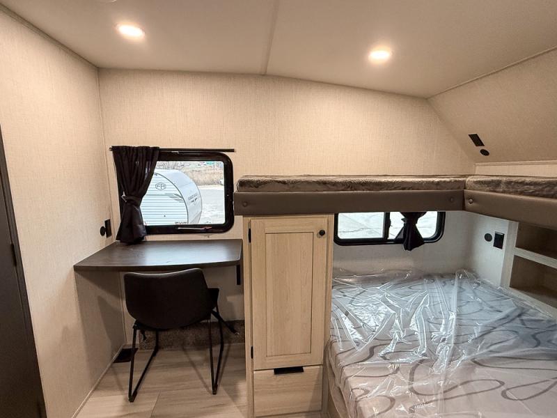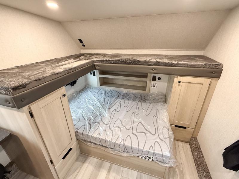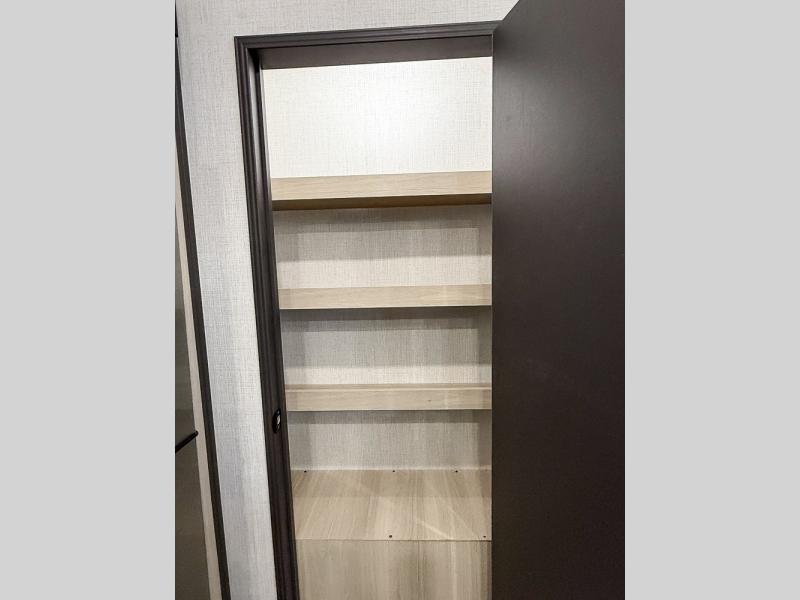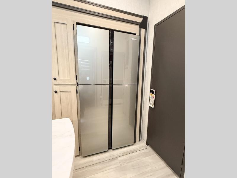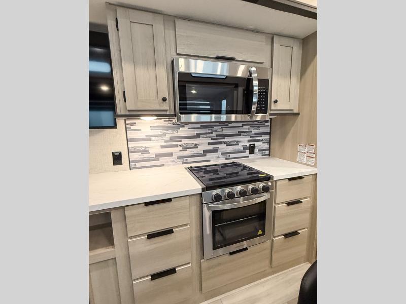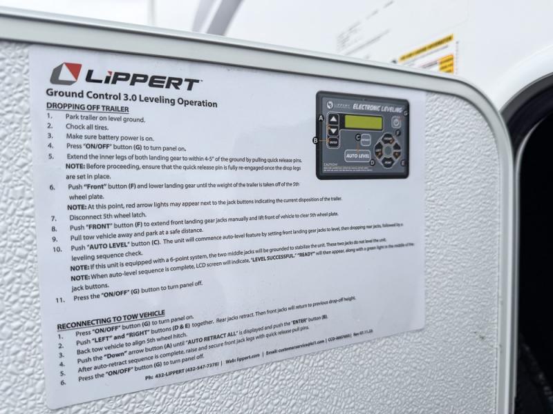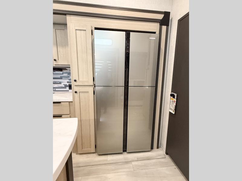 If you're ready for fun, look for further than this dual entry fifth wheel! It will be so easy to travel with friends and family since there is a master bedroom with a king bed and a full rear bath, plus a front bunkhouse suite with bunk beds, a queen bed, and a second full bath! The chef of your crew can whip up breakfast in the morning on the 21" 2-in-1 oven range or in the over-the-range microwave. There is also a 16 cu. ft. 12V refrigerator and walk-in pantry for food storage! The super sofa and table with chairs sit across from the entertainment center and fireplace for easy viewing in the evening, or you may just find yourselves outdoors visiting with campground neighbors!