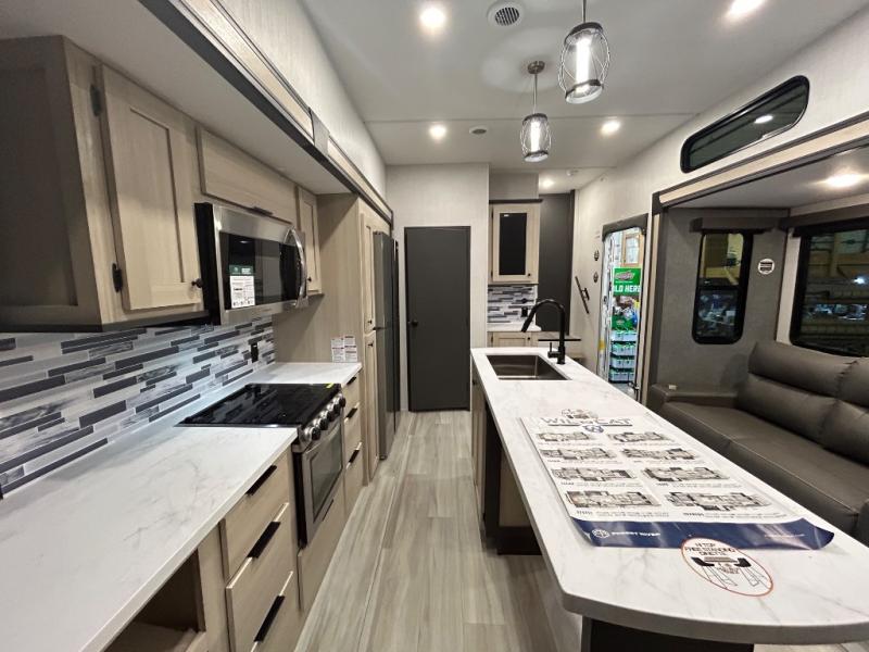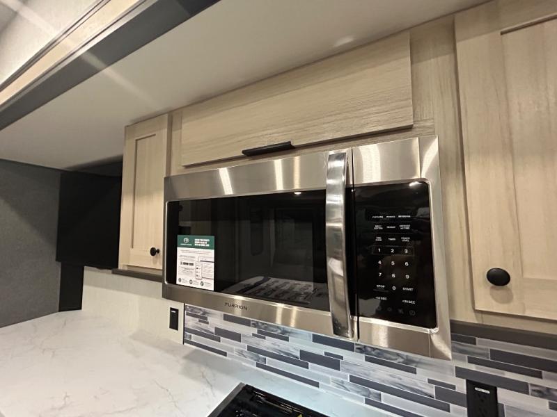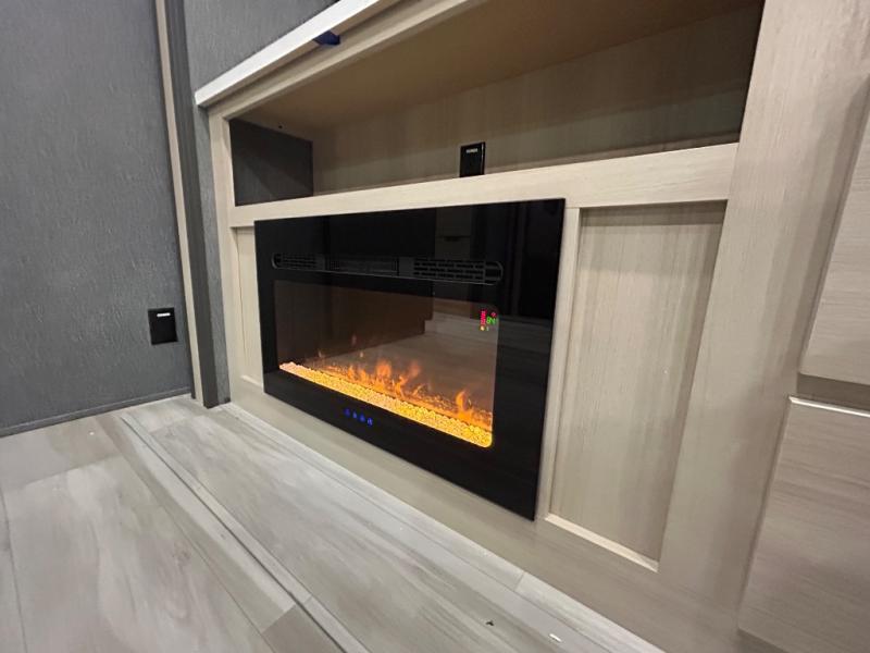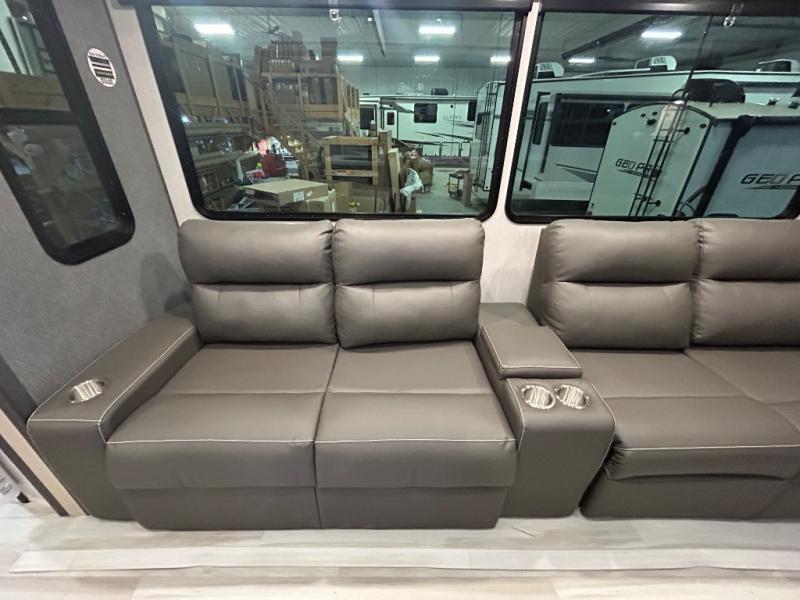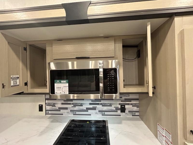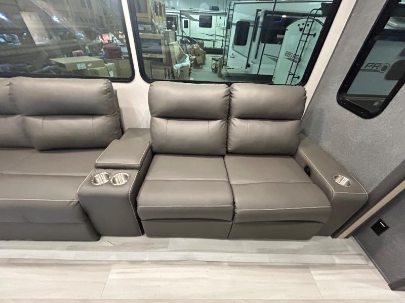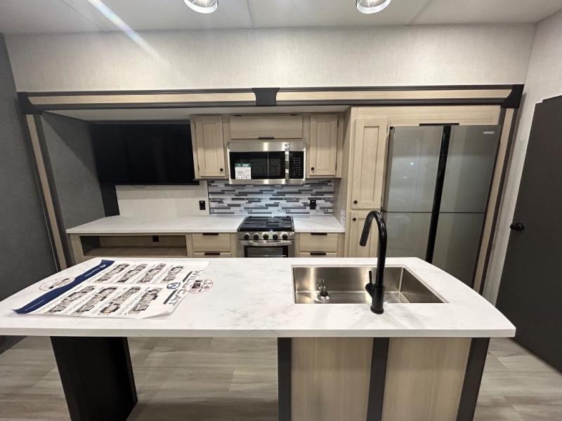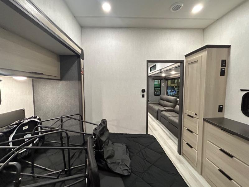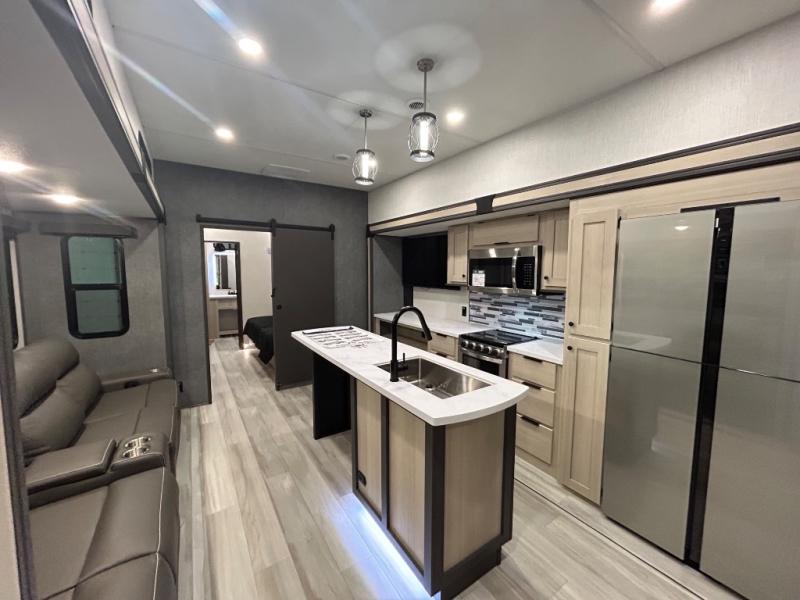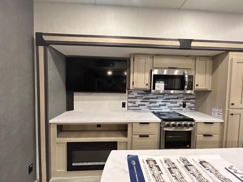 If you're ready for fun, look for further than this dual entry fifth wheel! It will be so easy to travel with friends and family since there is a master bedroom with a king bed and a full rear bath, plus a front bunkhouse suite with bunk beds, a full bed, and a second full bath! The chef of your crew can whip up breakfast in the morning on the 21" 2-in-1 oven range or in the over-the-range microwave. There is also a 16 cu. ft. 12V refrigerator and pantry for food storage, along with a coffee bar for those slow mornings! The large super sofa sits in a slide out for added space and across from the entertainment center and fireplace for easy viewing in the evening, or you may just find yourselves outdoors visiting with campground neighbors!
