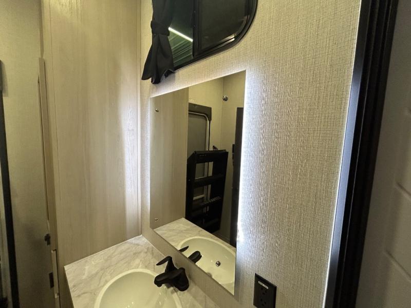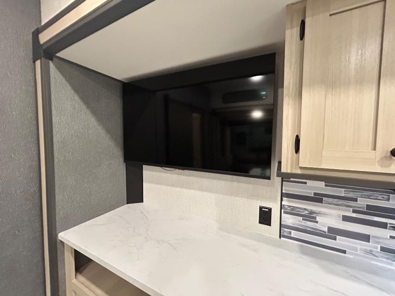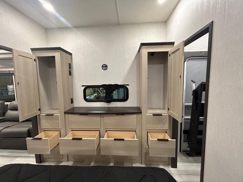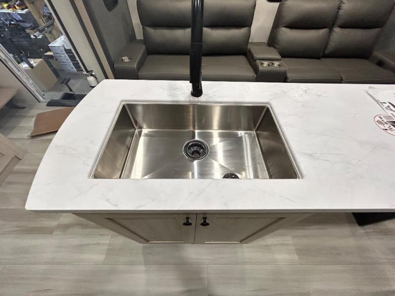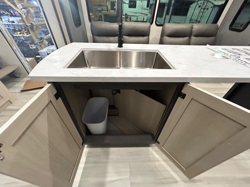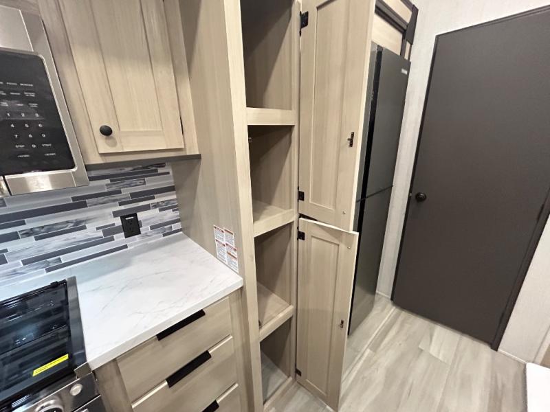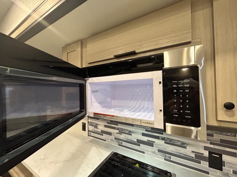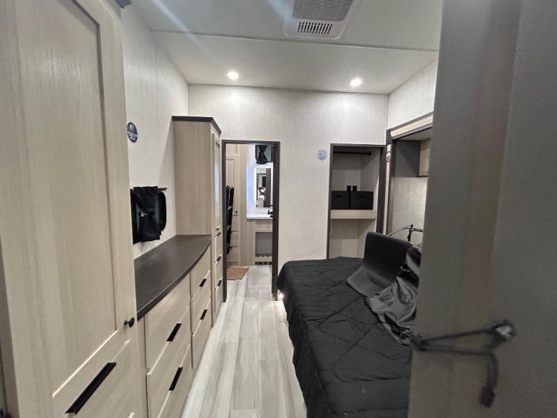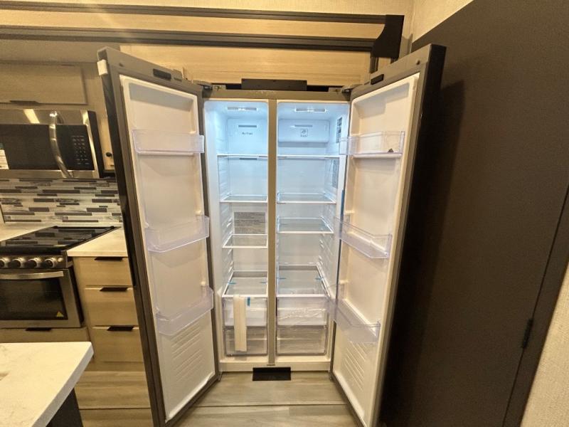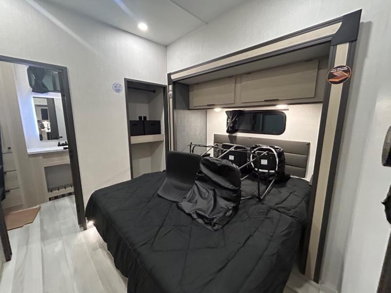 If you're ready for fun, look for further than this dual entry fifth wheel! It will be so easy to travel with friends and family since there is a master bedroom with a king bed and a full rear bath, plus a front bunkhouse suite with bunk beds, a full bed, and a second full bath! The chef of your crew can whip up breakfast in the morning on the 21" 2-in-1 oven range or in the over-the-range microwave. There is also a 16 cu. ft. 12V refrigerator and pantry for food storage, along with a coffee bar for those slow mornings! The large super sofa sits in a slide out for added space and across from the entertainment center and fireplace for easy viewing in the evening, or you may just find yourselves outdoors visiting with campground neighbors!