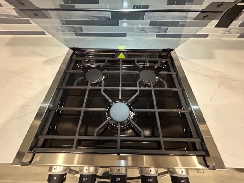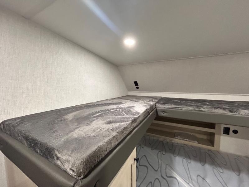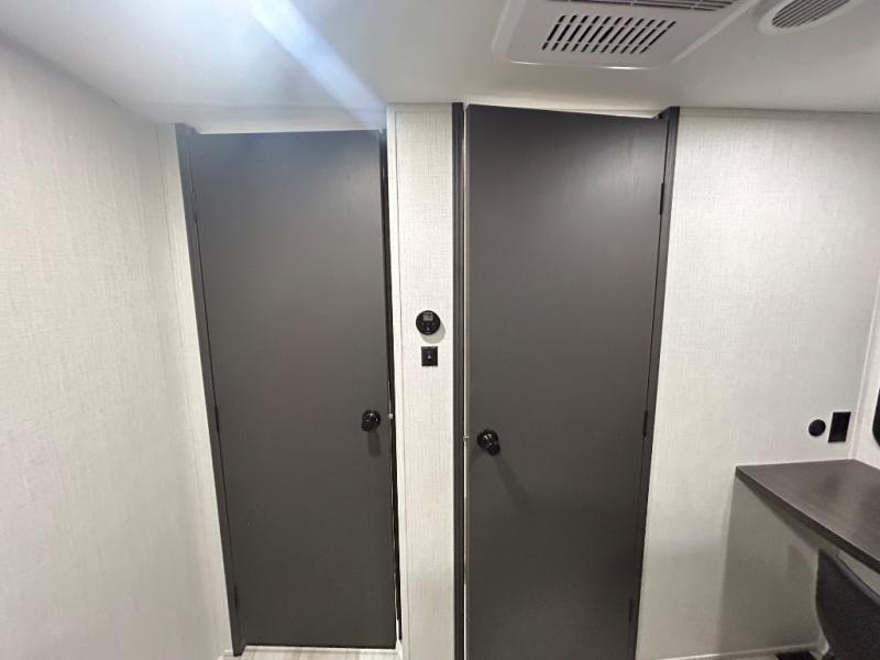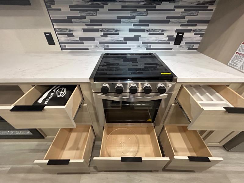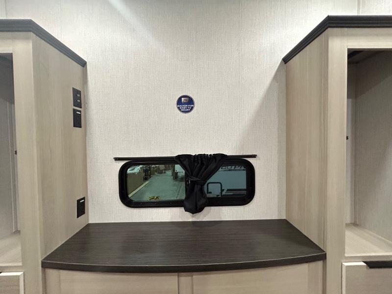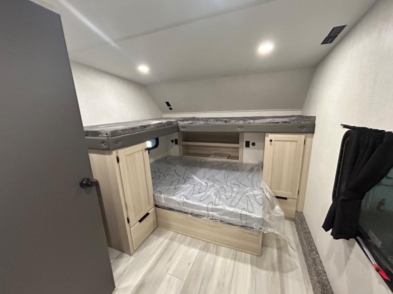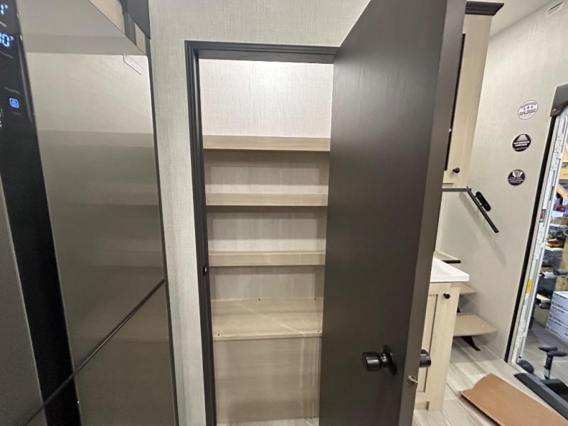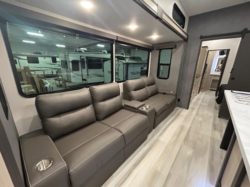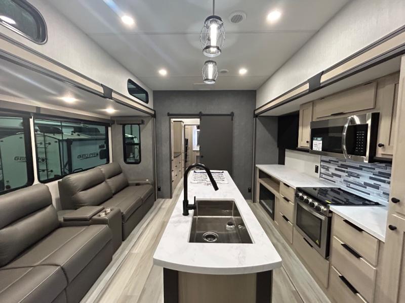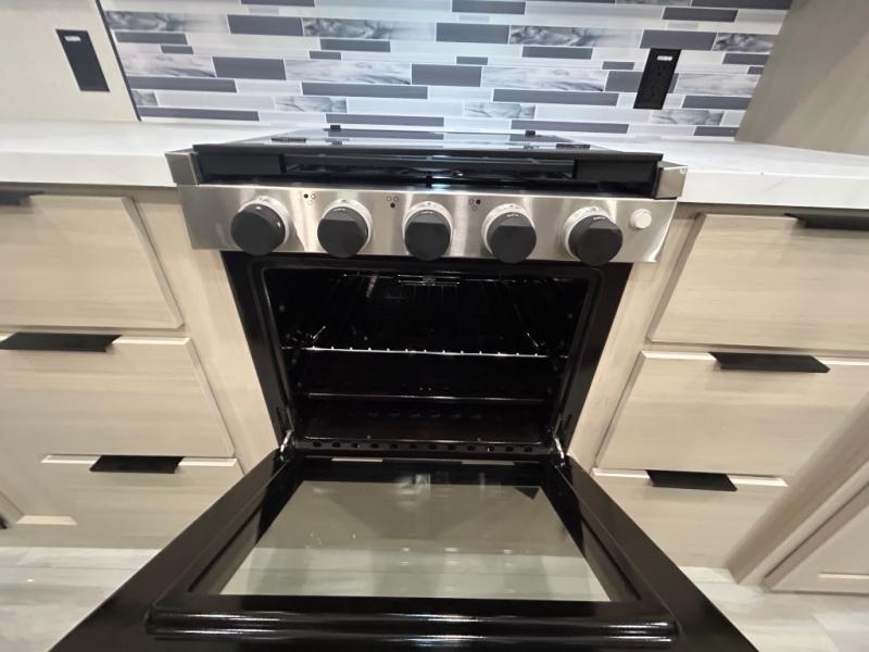 If you're ready for fun, look for further than this dual entry fifth wheel! It will be so easy to travel with friends and family since there is a master bedroom with a king bed and a full rear bath, plus a front bunkhouse suite with bunk beds, a full bed, and a second full bath! The chef of your crew can whip up breakfast in the morning on the 21" 2-in-1 oven range or in the over-the-range microwave. There is also a 16 cu. ft. 12V refrigerator and pantry for food storage, along with a coffee bar for those slow mornings! The large super sofa sits in a slide out for added space and across from the entertainment center and fireplace for easy viewing in the evening, or you may just find yourselves outdoors visiting with campground neighbors!