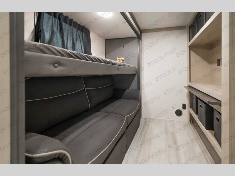Wow! You won't believe the features found in this luxury fifth wheel that can sleep up to nine each night! Your guests or the kids will absolutely love the middle bunkroom with a bunk, hide-a-bed sofa and a loft above for even more sleeping or storage space. There is also a desk here, which will allow you to utilize this space as an office as well! You'll have your own space in the front private bedroom on the king bed slide out, and there is a walk-in wardrobe to keep your clothes tidy. There is even washer and dryer prep for the option to keep those clothes clean! The chef of your group will have everything they need to prepare meals, including a 21" 2-in-1 oven range, an over-the-range microwave, a 16 cu. ft. 12V refrigerator, plus a kitchen island for more counter space. In the evenings, your crew can get cozy on the rear sofa and theater seats across from the entertainment center and fireplace, or you might just play a game at the hi-top table and chairs!