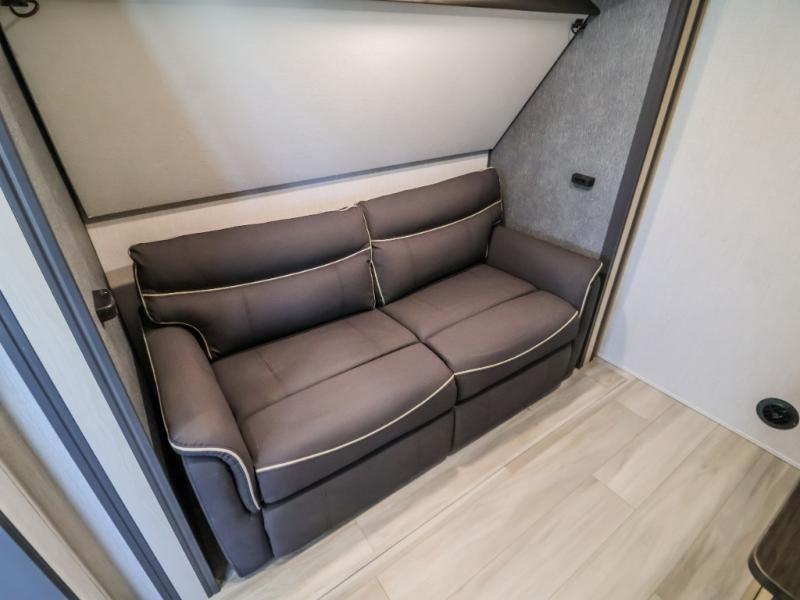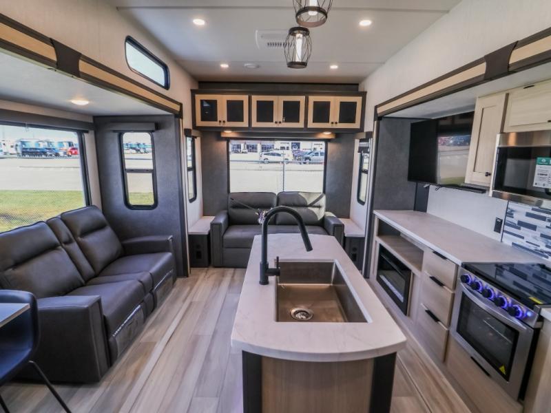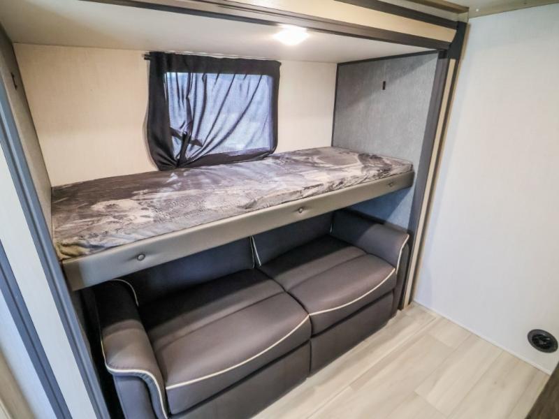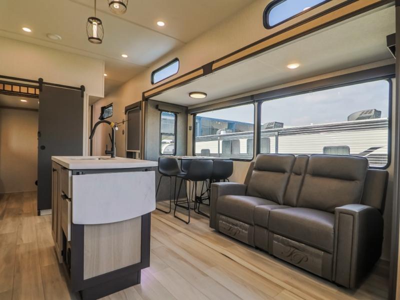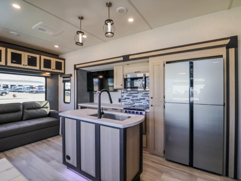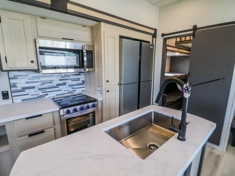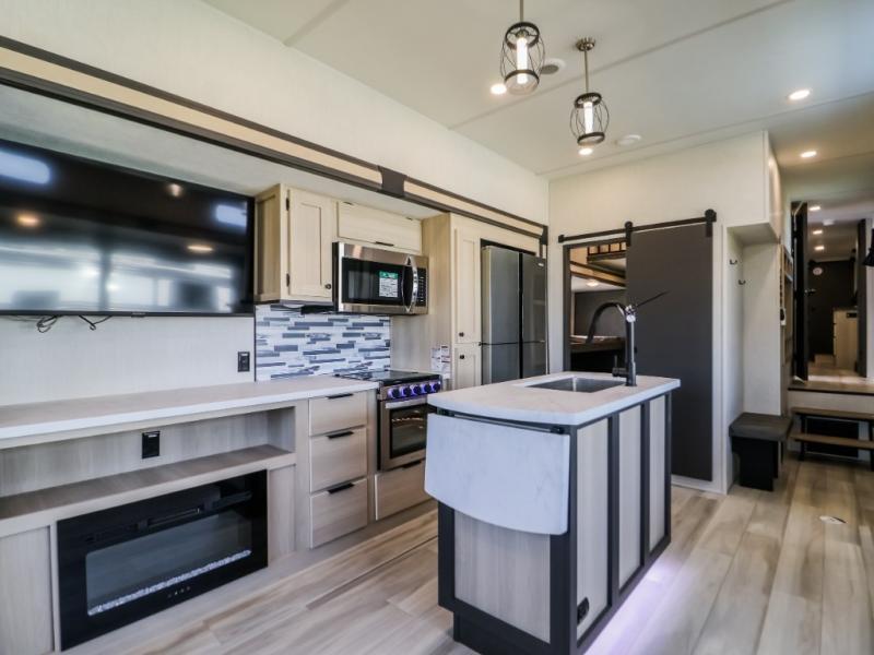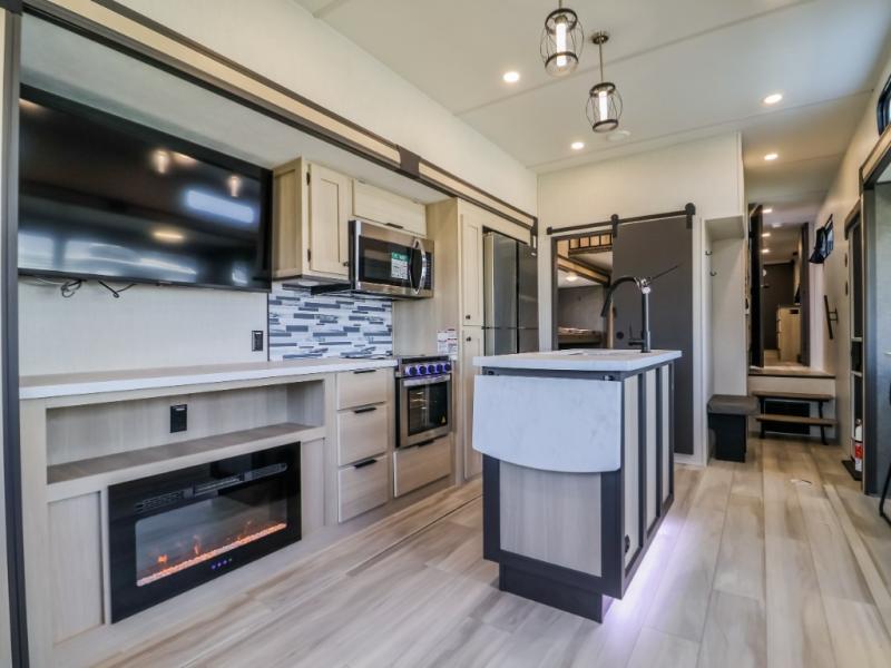 Wow! You won't believe the features found in this luxury fifth wheel that can sleep up to nine each night! Your guests or the kids will absolutely love the middle bunkroom with a bunk, hide-a-bed sofa and a loft above for even more sleeping or storage space. There is also a desk here, which will allow you to utilize this space as an office as well! You'll have your own space in the front private bedroom on the king bed slide out, and there is a walk-in wardrobe to keep your clothes tidy. There is even washer and dryer prep for the option to keep those clothes clean! The chef of your group will have everything they need to prepare meals, including a 21" 2-in-1 oven range, an over-the-range microwave, a 16 cu. ft. 12V refrigerator, plus a kitchen island for more counter space. In the evenings, your crew can get cozy on the rear sofa and theater seats across from the entertainment center and fireplace, or you might just play a game at the hi-top table and chairs!