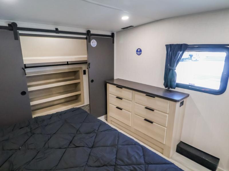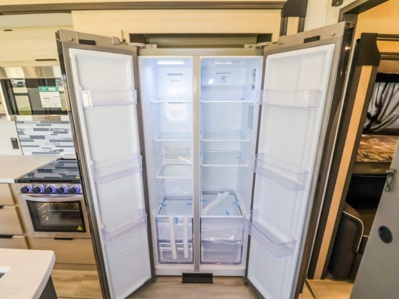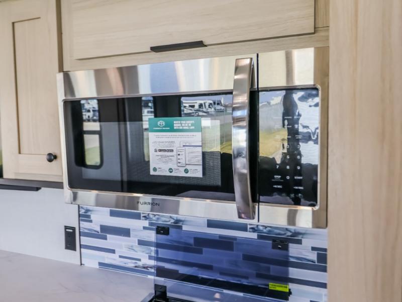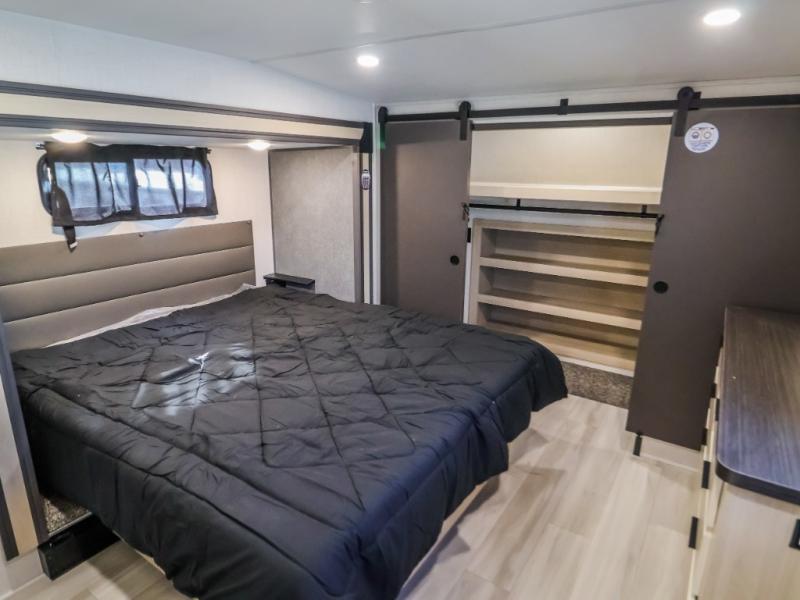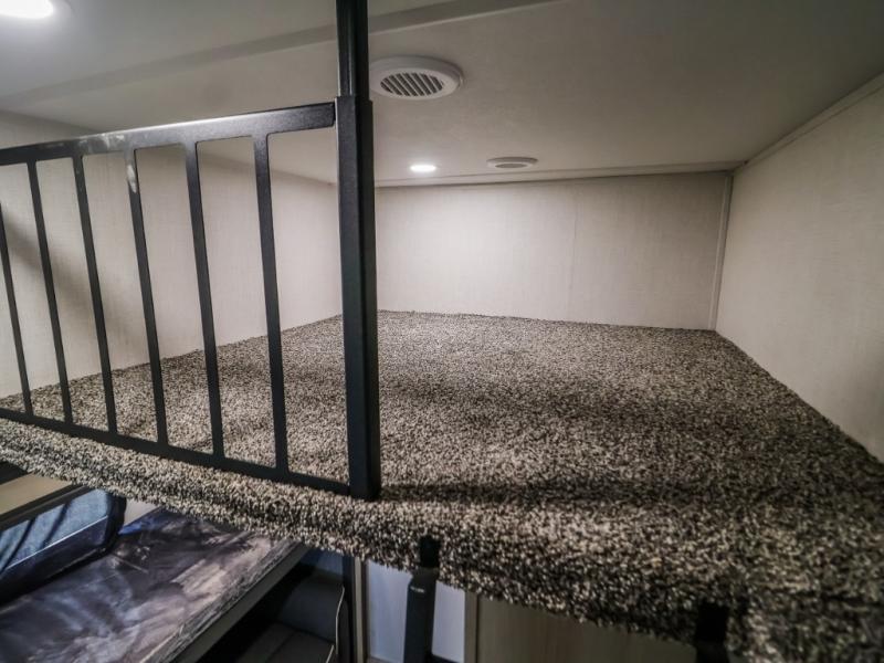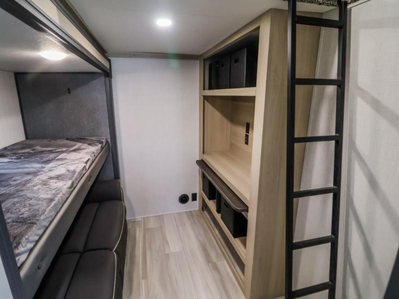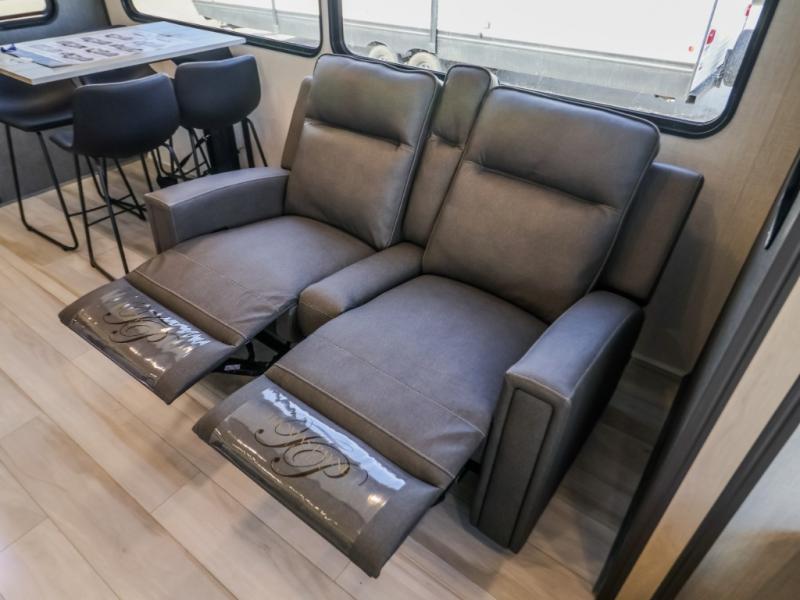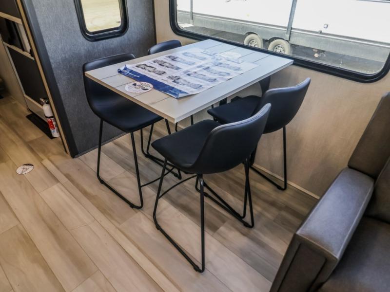Wow! You won't believe the features found in this luxury fifth wheel that can sleep up to nine each night! Your guests or the kids will absolutely love the middle bunkroom with a bunk, hide-a-bed sofa and a loft above for even more sleeping or storage space. There is also a desk here, which will allow you to utilize this space as an office as well! You'll have your own space in the front private bedroom on the king bed slide out, and there is a walk-in wardrobe to keep your clothes tidy. There is even washer and dryer prep for the option to keep those clothes clean! The chef of your group will have everything they need to prepare meals, including a 21" 2-in-1 oven range, an over-the-range microwave, a 16 cu. ft. 12V refrigerator, plus a kitchen island for more counter space. In the evenings, your crew can get cozy on the rear sofa and theater seats across from the entertainment center and fireplace, or you might just play a game at the hi-top table and chairs!