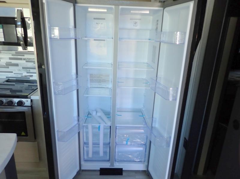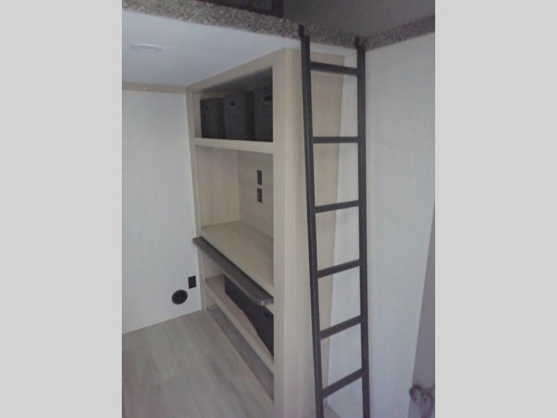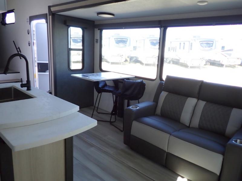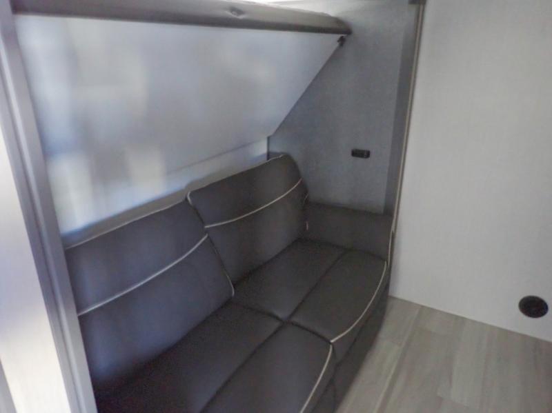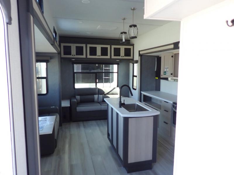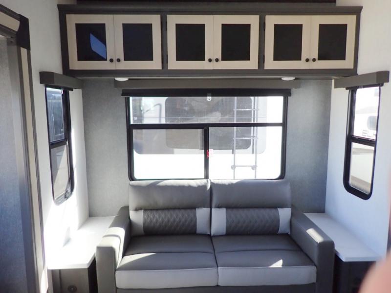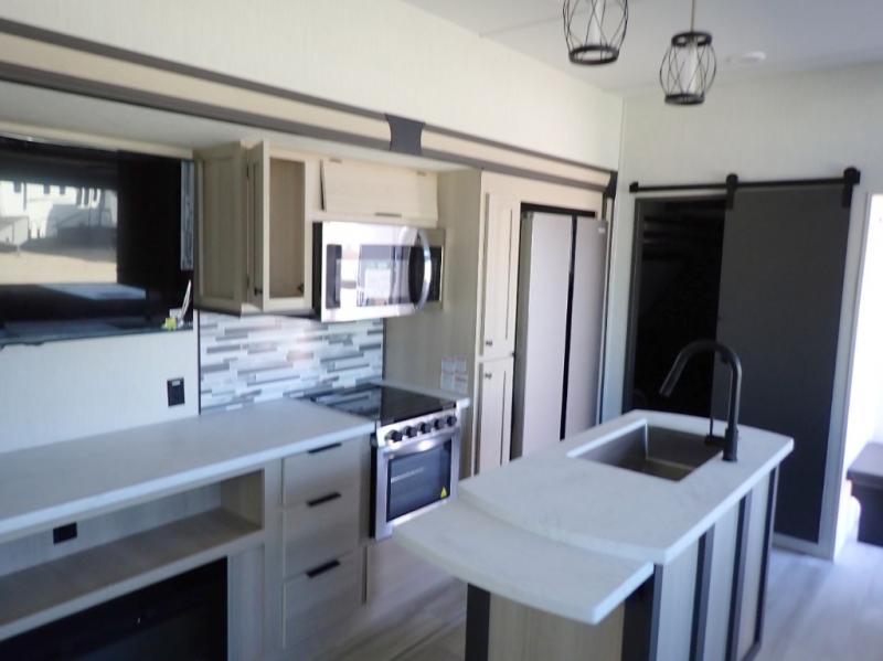 Wow! You won't believe the features found in this luxury fifth wheel that can sleep up to nine each night! Your guests or the kids will absolutely love the middle bunkroom with a bunk, hide-a-bed sofa and a loft above for even more sleeping or storage space. There is also a desk here, which will allow you to utilize this space as an office as well! You'll have your own space in the front private bedroom on the king bed slide out, and there is a walk-in wardrobe to keep your clothes tidy. There is even washer and dryer prep for the option to keep those clothes clean! The chef of your group will have everything they need to prepare meals, including a 21" 2-in-1 oven range, an over-the-range microwave, a 16 cu. ft. 12V refrigerator, plus a kitchen island for more counter space. In the evenings, your crew can get cozy on the rear sofa and theater seats across from the entertainment center and fireplace, or you might just play a game at the hi-top table and chairs!