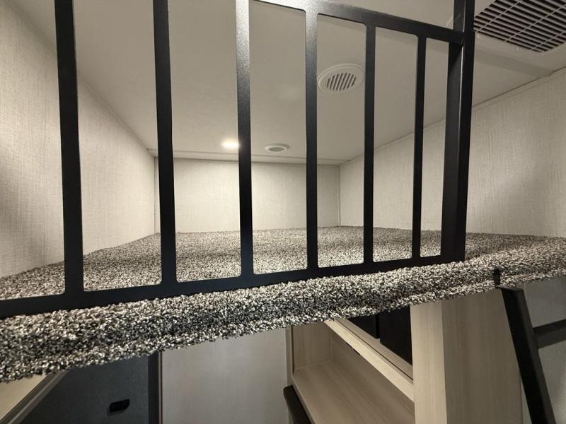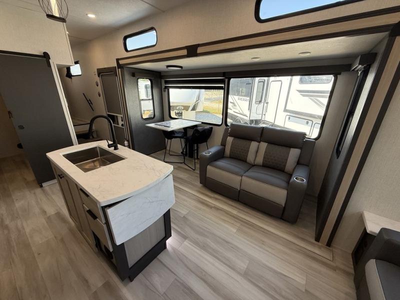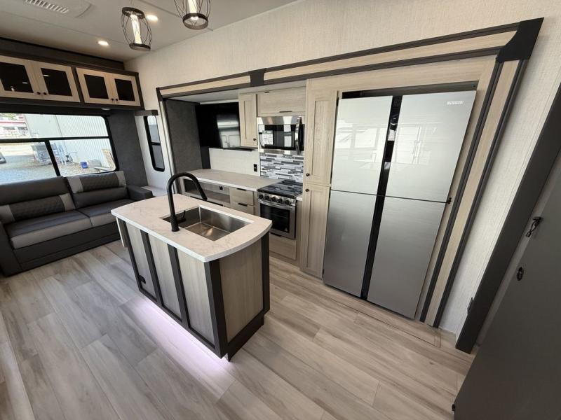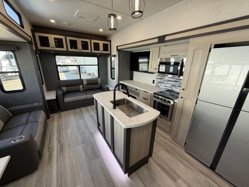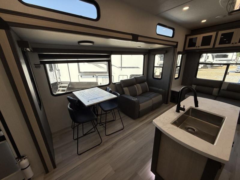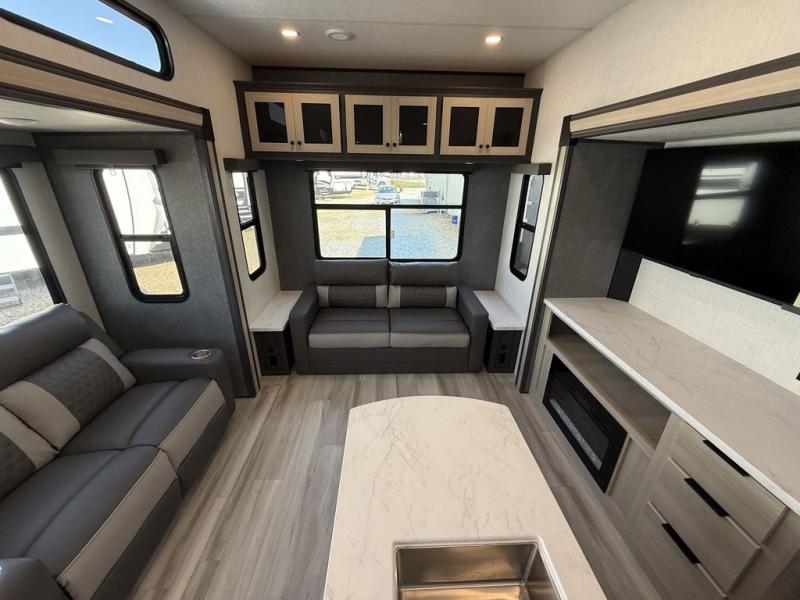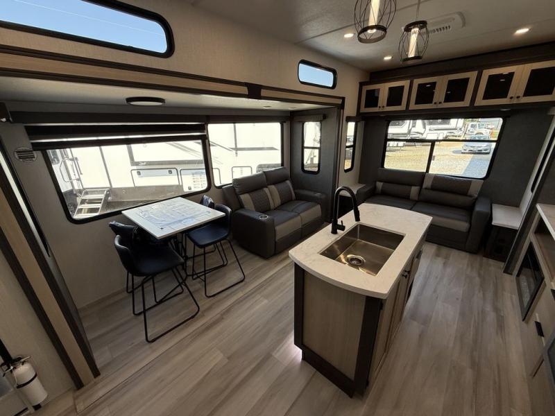 Wow! You won't believe the features found in this luxury fifth wheel that can sleep up to nine each night! Your guests or the kids will absolutely love the middle bunkroom with a bunk, hide-a-bed sofa and a loft above for even more sleeping or storage space. There is also a desk here, which will allow you to utilize this space as an office as well! You'll have your own space in the front private bedroom on the king bed slide out, and there is a walk-in wardrobe to keep your clothes tidy. There is even washer and dryer prep for the option to keep those clothes clean! The chef of your group will have everything they need to prepare meals, including a 21" 2-in-1 oven range, an over-the-range microwave, a 16 cu. ft. 12V refrigerator, plus a kitchen island for more counter space. In the evenings, your crew can get cozy on the rear sofa and theater seats across from the entertainment center and fireplace, or you might just play a game at the hi-top table and chairs!