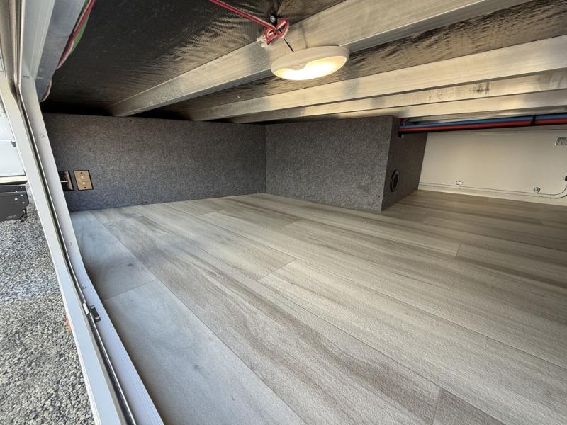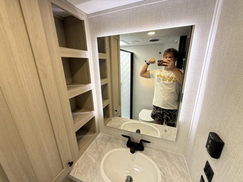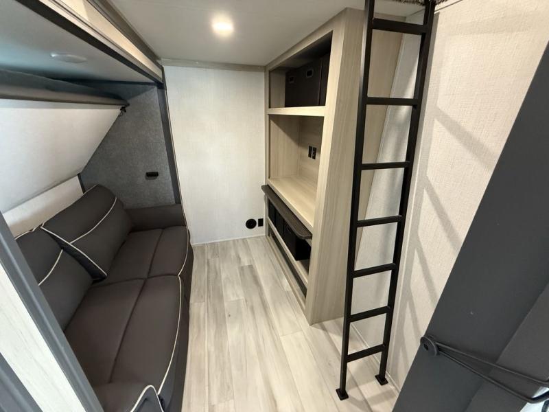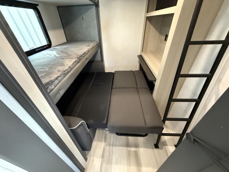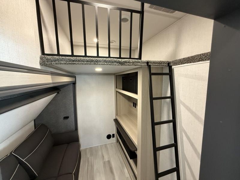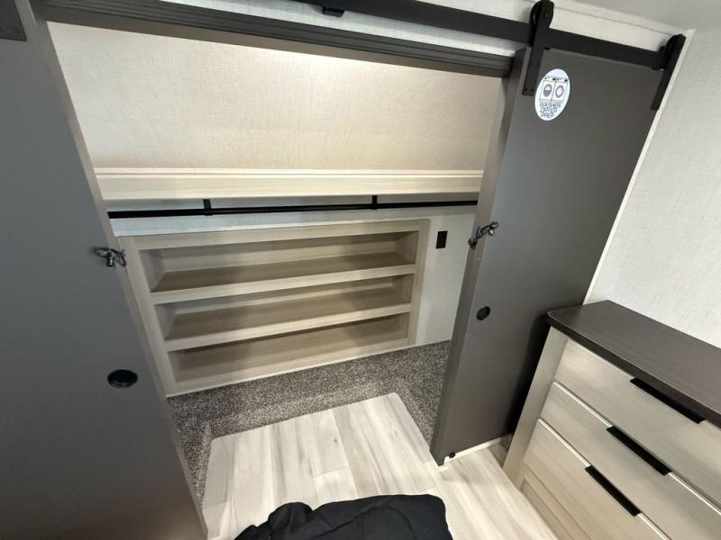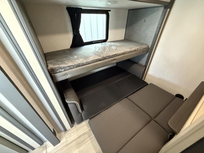 Wow! You won't believe the features found in this luxury fifth wheel that can sleep up to nine each night! Your guests or the kids will absolutely love the middle bunkroom with a bunk, hide-a-bed sofa and a loft above for even more sleeping or storage space. There is also a desk here, which will allow you to utilize this space as an office as well! You'll have your own space in the front private bedroom on the king bed slide out, and there is a walk-in wardrobe to keep your clothes tidy. There is even washer and dryer prep for the option to keep those clothes clean! The chef of your group will have everything they need to prepare meals, including a 21" 2-in-1 oven range, an over-the-range microwave, a 16 cu. ft. 12V refrigerator, plus a kitchen island for more counter space. In the evenings, your crew can get cozy on the rear sofa and theater seats across from the entertainment center and fireplace, or you might just play a game at the hi-top table and chairs!