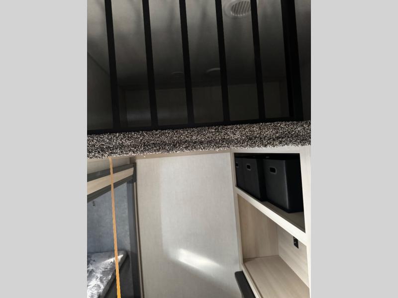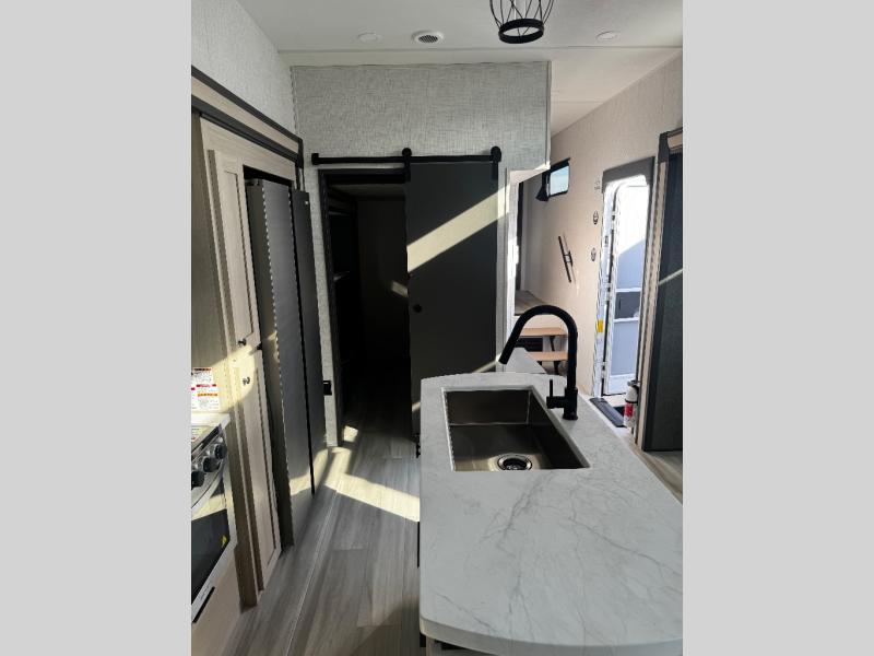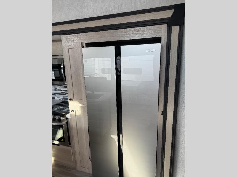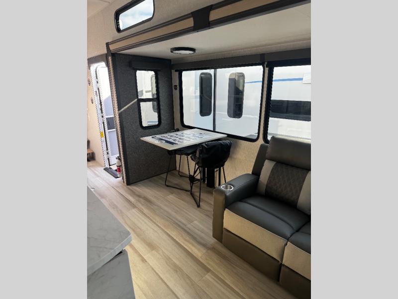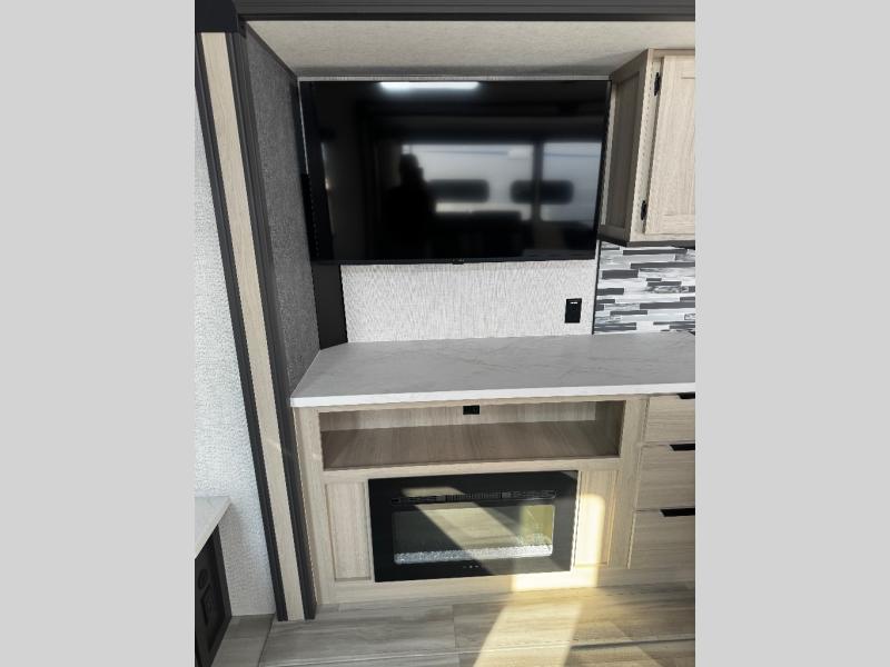 Wow! You won't believe the features found in this luxury fifth wheel that can sleep up to nine each night! Your guests or the kids will absolutely love the middle bunkroom with a bunk, hide-a-bed sofa and a loft above for even more sleeping or storage space. There is also a desk here, which will allow you to utilize this space as an office as well! You'll have your own space in the front private bedroom on the king bed slide out, and there is a walk-in wardrobe to keep your clothes tidy. There is even washer and dryer prep for the option to keep those clothes clean! The chef of your group will have everything they need to prepare meals, including a 21" 2-in-1 oven range, an over-the-range microwave, a 16 cu. ft. 12V refrigerator, plus a kitchen island for more counter space. In the evenings, your crew can get cozy on the rear sofa and theater seats across from the entertainment center and fireplace, or you might just play a game at the hi-top table and chairs!