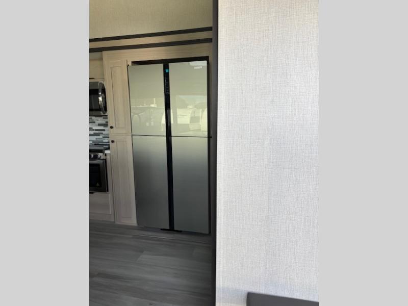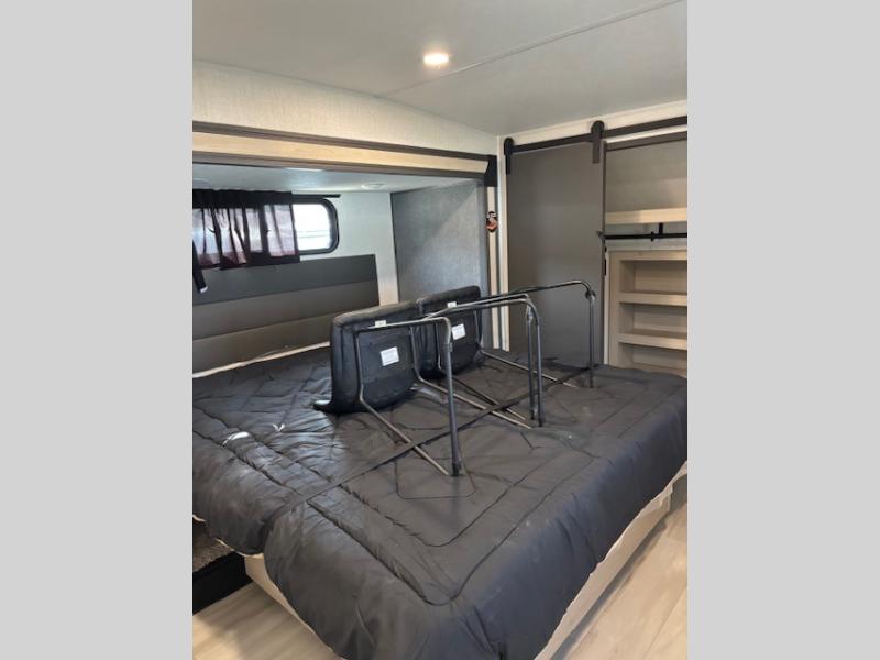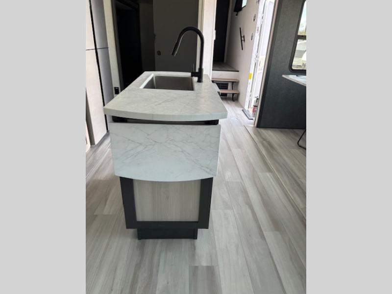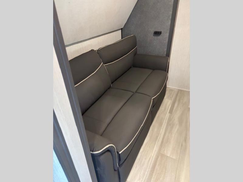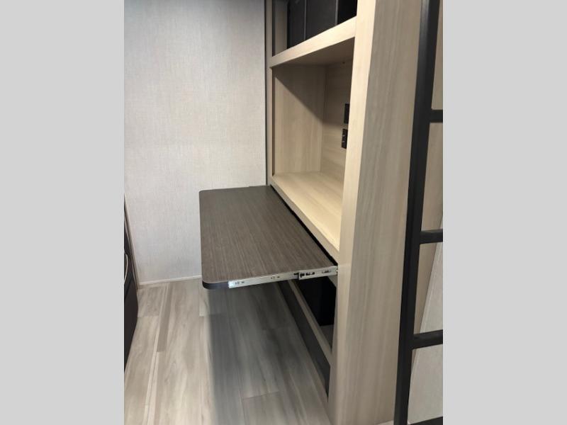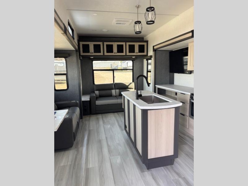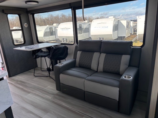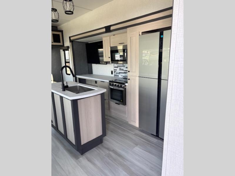 Wow! You won't believe the features found in this luxury fifth wheel that can sleep up to nine each night! Your guests or the kids will absolutely love the middle bunkroom with a bunk, hide-a-bed sofa and a loft above for even more sleeping or storage space. There is also a desk here, which will allow you to utilize this space as an office as well! You'll have your own space in the front private bedroom on the king bed slide out, and there is a walk-in wardrobe to keep your clothes tidy. There is even washer and dryer prep for the option to keep those clothes clean! The chef of your group will have everything they need to prepare meals, including a 21" 2-in-1 oven range, an over-the-range microwave, a 16 cu. ft. 12V refrigerator, plus a kitchen island for more counter space. In the evenings, your crew can get cozy on the rear hide a bed sofa and theater seats across from the entertainment center and fireplace, or you might just play a game at the hi-top table and chairs!